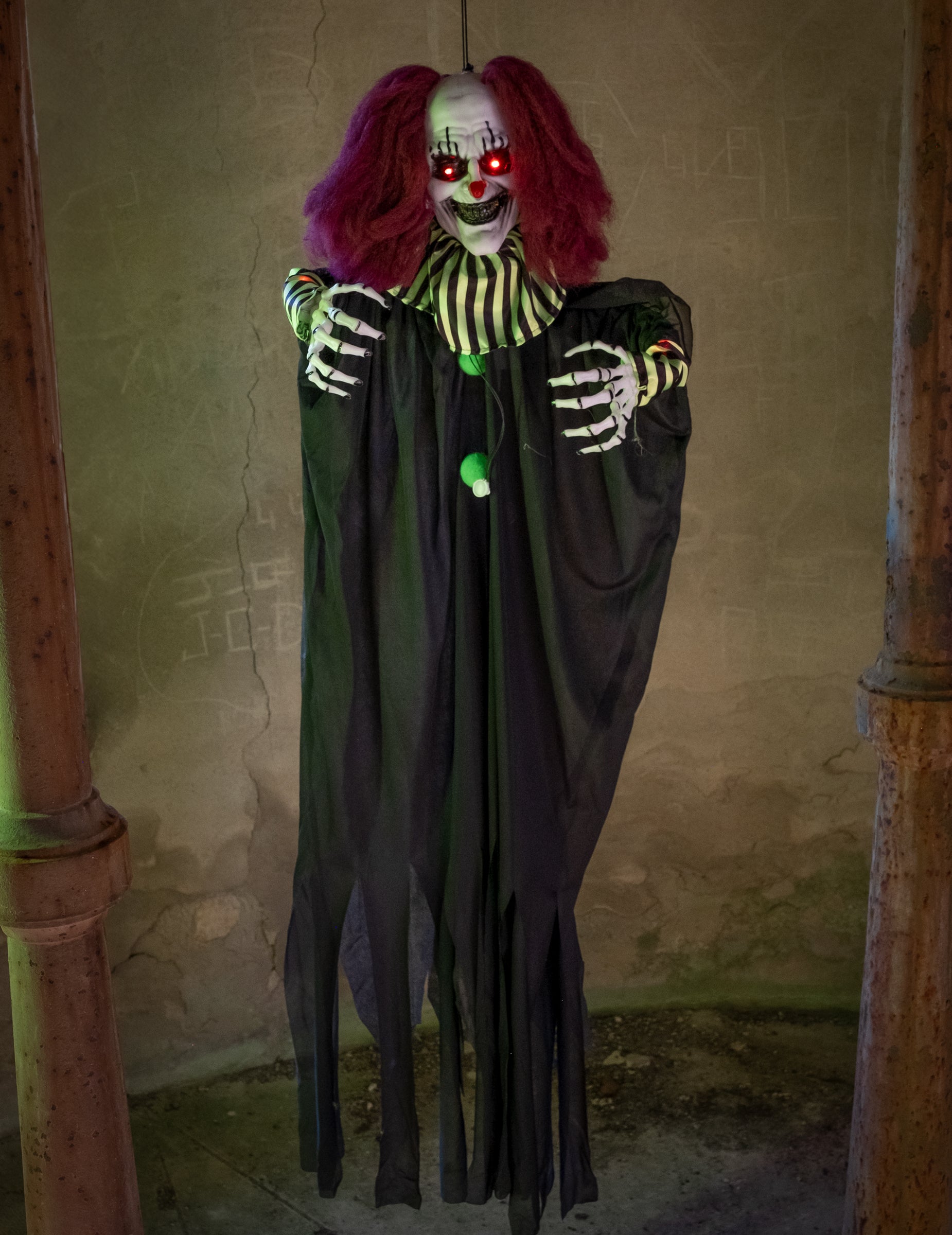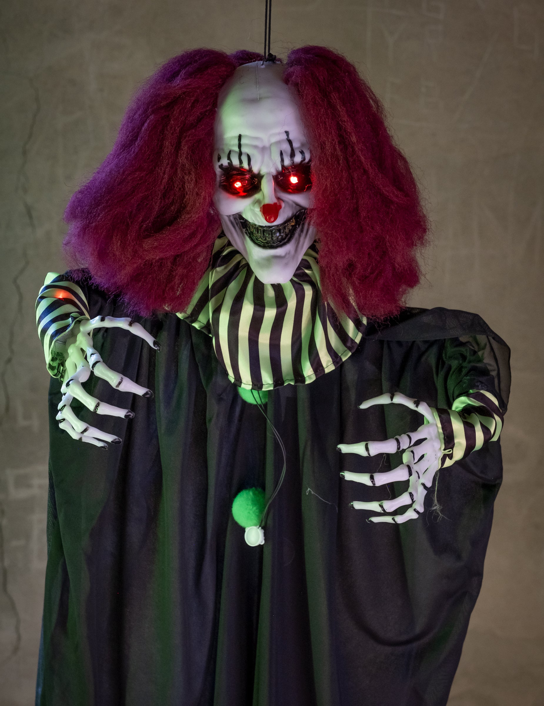 Donesite strah sa stropa s ovim 130-inčnim animiranim visećim klaunom cm Otprilike, jarko obojeni lik makabre koji uopće nije zabavan. S njegovom rušenom crvenom kosom, neonsko zelenim i crnim odijelom, a koštano lice smrznuto u uznemirujućoj grimase, privlači sve oči. Čim se čuje buka, njegov senzor zvuka pokreće užas. His eyes light up, shrill sounds ring out, and panic sets in. Lightweight and easy to hang, it works with 3 AAA batteries (not included), offering a striking combined effect of light and sound. Idealno za dekor Noći vještica, sobu s morbidnom atmosferom, užurbanim prozorom ili bilo kojim zastrašujućim prostorom, ovaj viseći klaun spreman je učiniti da vam krv postane hladna na najmanjim uzbuđenjem.