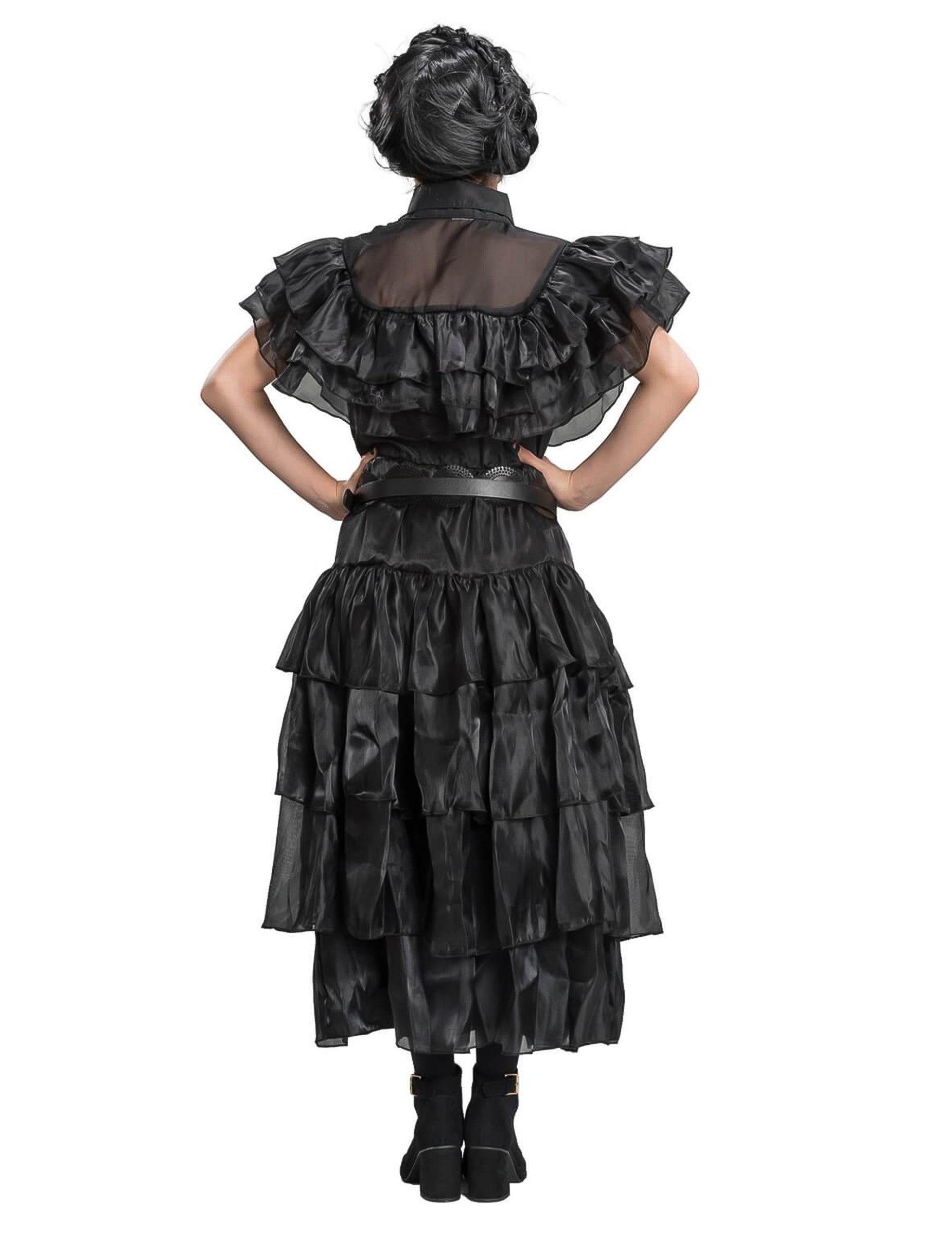 Ove srijede kostim za djecu sastoji se od duge crne haljine s rufflesima, evocirajući u srijedu Addamsovu slavnu kuglu. Vrh haljine ukrašen je slojevitim rufflesima i ovratnikom s košuljama, za stil koji je i gotički i uredan. Suknja se sastoji od nekoliko satenskih slojeva s sjajnim efektom, pružajući volumen zadržavajući tamnu auru lika. Skupeni pojas ističe struk i strukturira siluetu. Idealan kostim za utjelovljenje šarma macabre u srijedu, savršen za Noć vještica.