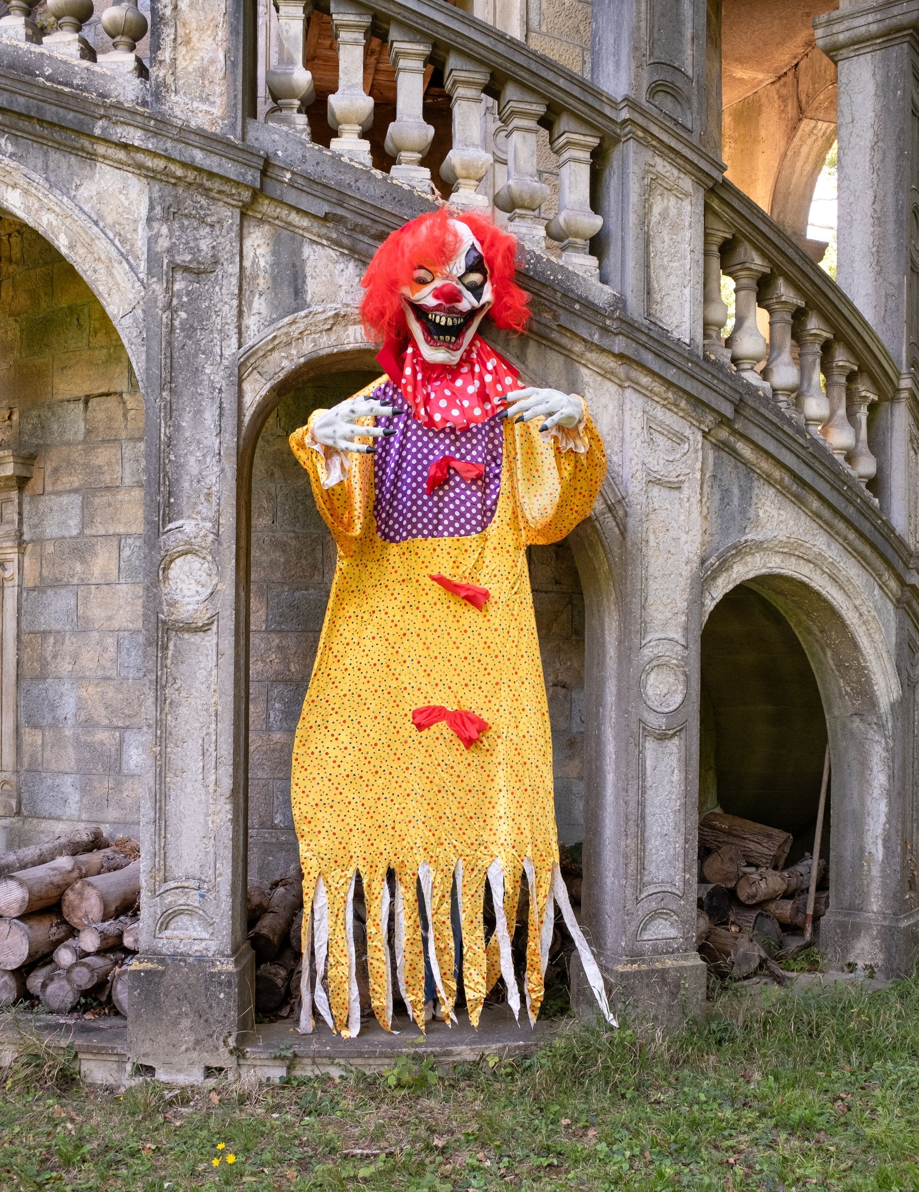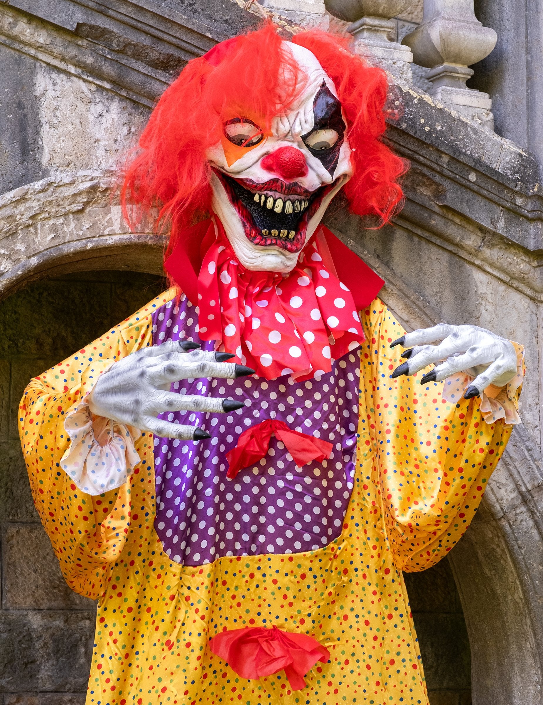 Lagan i prenosiv, ovaj zli klaun Njiše se na vjetru, pojačavajući svoj zlokobni učinak. Njegovo zastrašujuće plastično lice, drečavo crvene mašne i šarena odjeća sa širokim ovratnikom i rukavima stvaraju upečatljiv kontrast između karnevala i užasa. Ima diskretan dodatak koji omogućuje jednostavno objesiti ga s drveta, stropa ili u tamnom kutu.