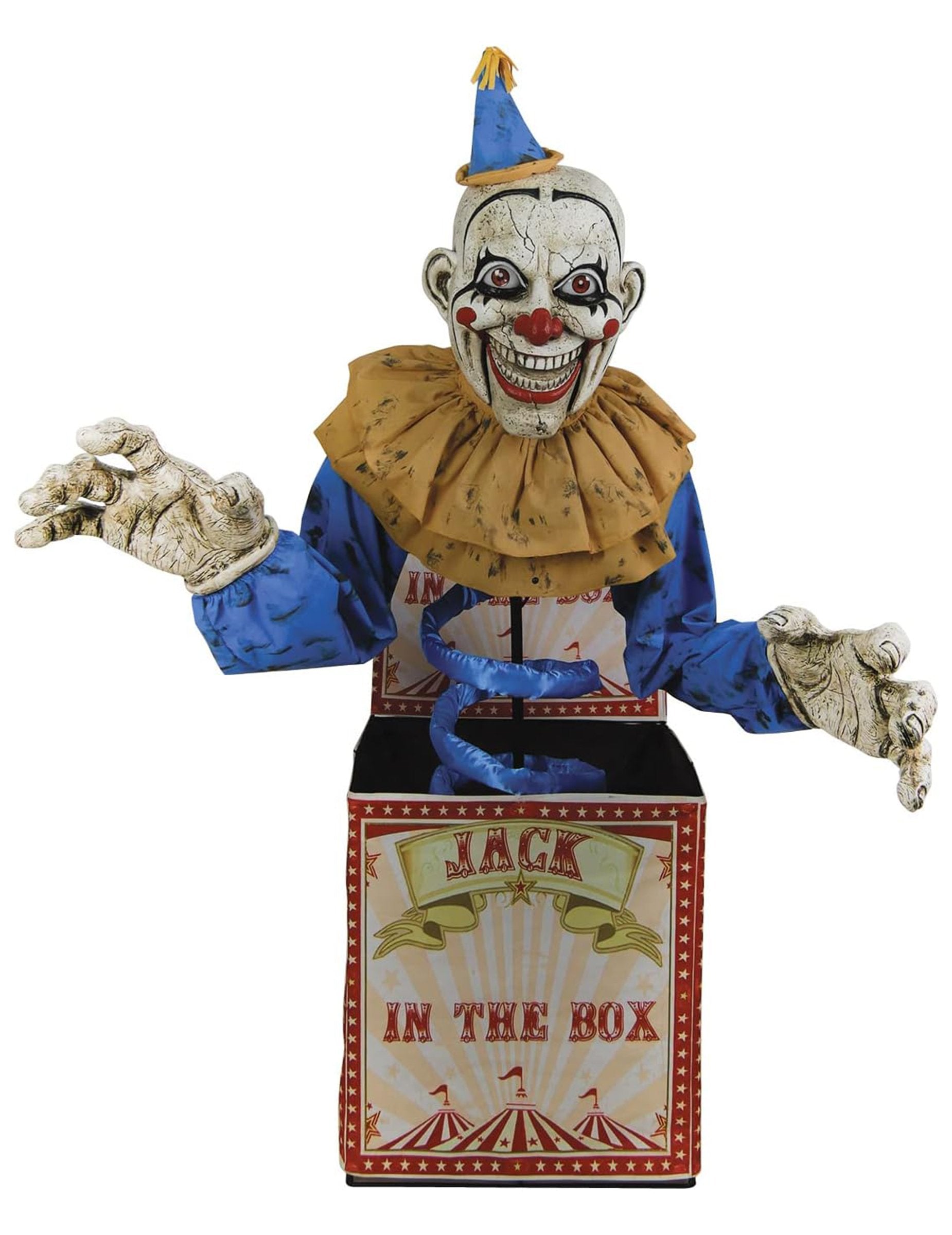 Uronite u užas s ovom priključkom u kutiji 180 animirani ukras klauna cm, Središnji dio upečatljivog koliko je zastrašujuće pretvoriti svoj prostor u istinsku scenu noćne more. Ovaj divovski klaun koji izlazi iz njegove kutije odmah privlači sve oči svojim grimasnim licem, šarenim kostimom i hladnim smijehom. Klovn govori i izbija smijeh, dok mu se čeljust otvara i zatvara ritam njegovih riječi. Oči su mu ponekad svijetle i bljesnule, pojačavajući njegov izgled. On se ljulja s lijeva na desno, čineći njegovu prisutnost još uznemirujućim. Ovaj animirani dekor djeluje na glavnoj utičnici AC 220-240V, idealno za kontinuirane animacije tijekom vaših najizmrtvijih postavki za Noć vještica.