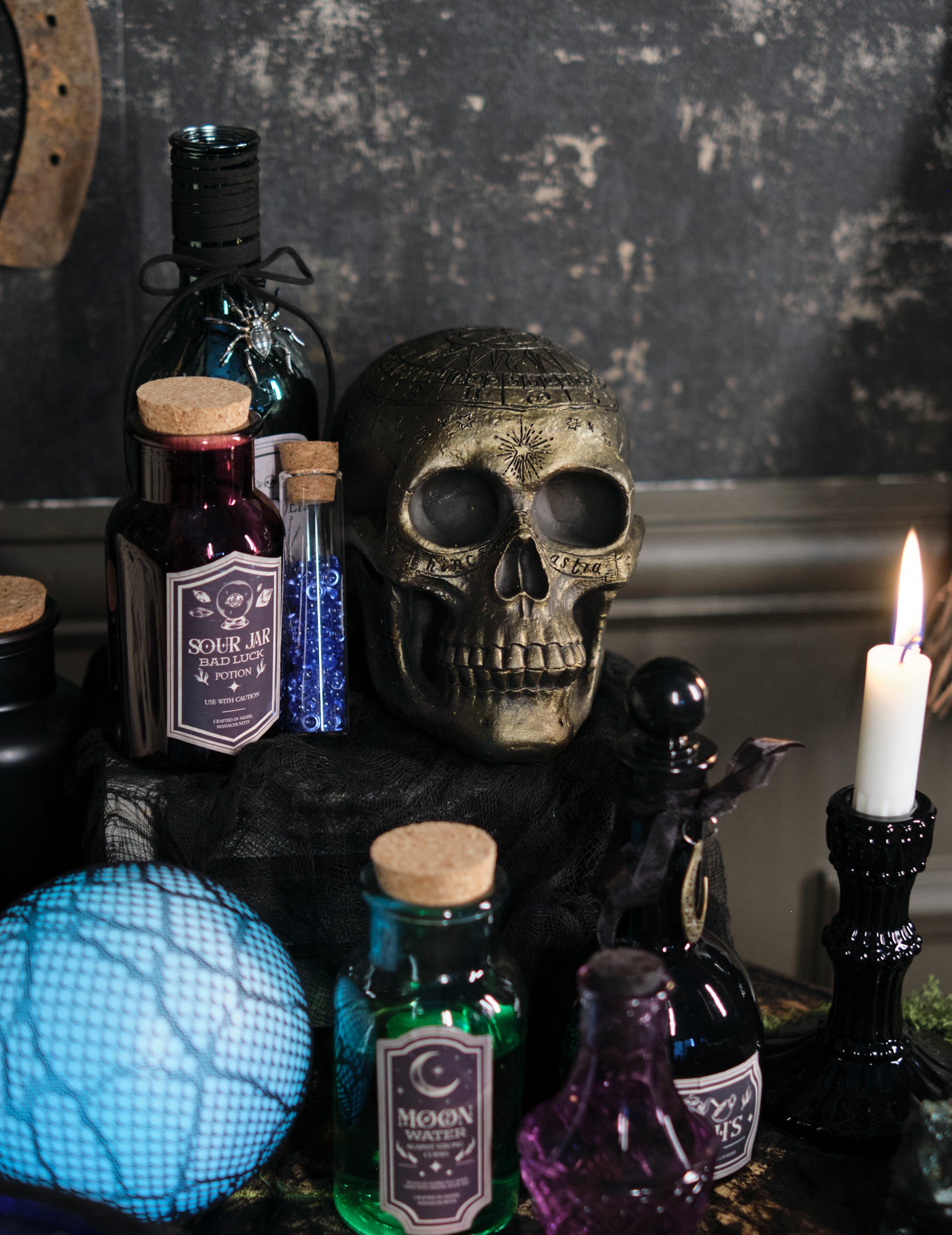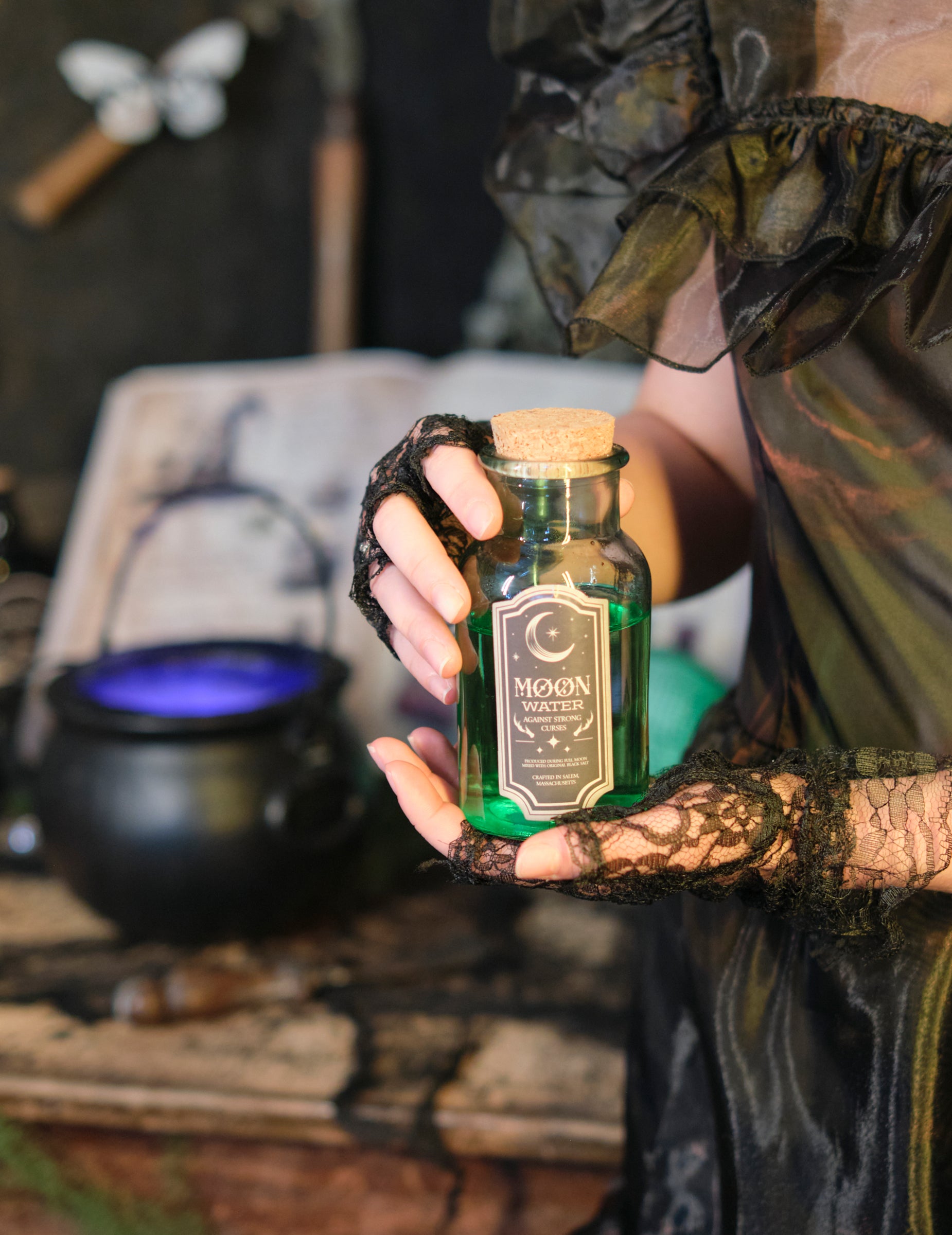 Ova zelena staklena bočica "Mjesečeva voda" od 13,5 cm Zaveden svojim čarobnim i nebeskim stilom. Odjeven s ukrasnom mjesečevom naljepnicom i zatvoren s plutastim čepom, savršeno ide s dekorom nadahnutim drevnim ritualima. Zahvaljujući kompaktnom 6.5 cm Široko, svoje mjesto nalazi u okruženju za Noć vještica nadahnuto zvijezdama.