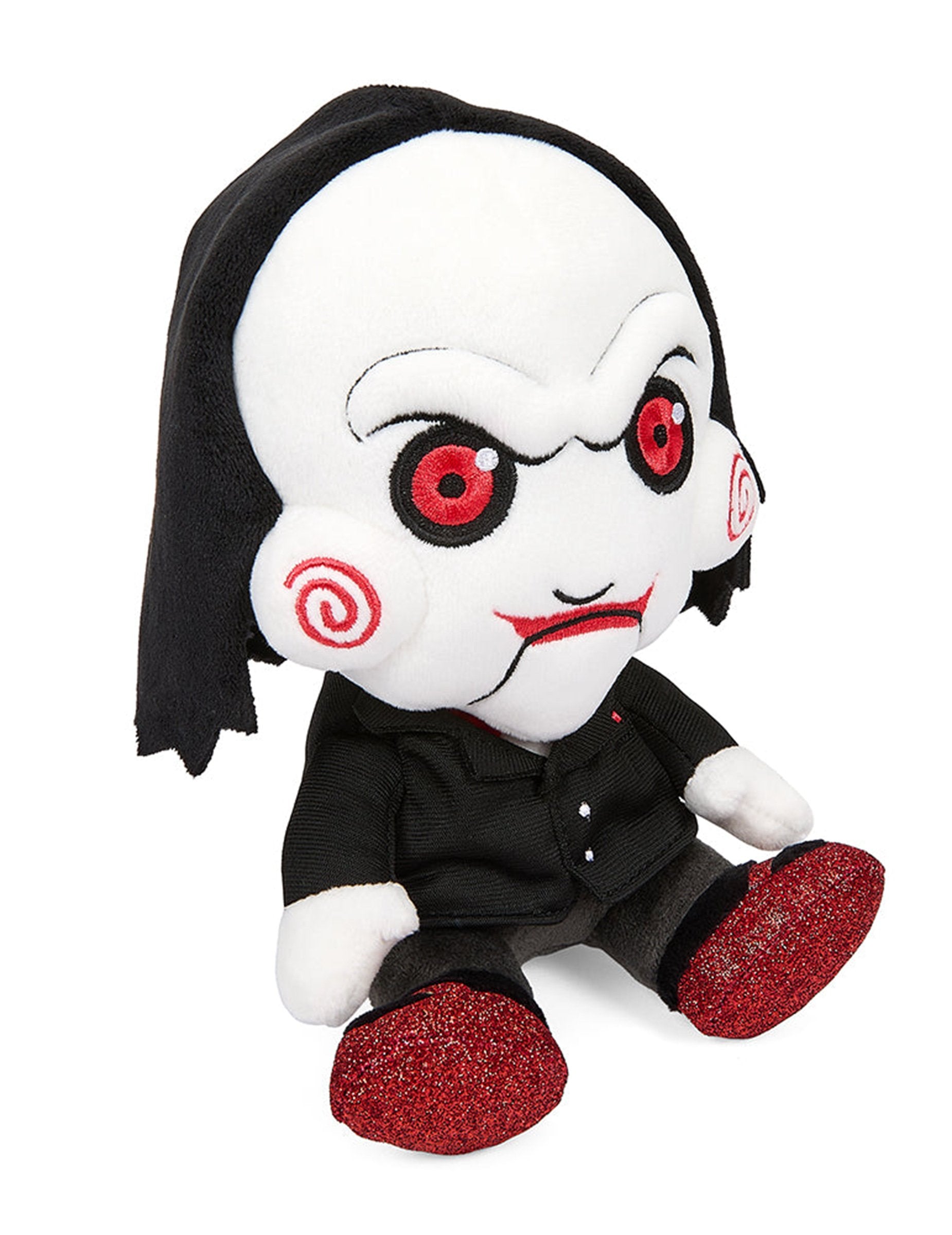 Ova plišana igračka od 20 cm Predstavlja Jigsaw, poznatu lutka iz filma Saw, u urednoj i detaljnoj verziji. Nalazimo njegov blijedi ten, intenzivne crvene oči i vezene spirale na obrazima, vjerni njegovom izvornom izgledu. Obučen u tamnu kostim i opremljen sjajnim crvenim cipelama, ovaj pliš savršeno kombinira zastrašujuću stranu lika s pristupačnijim formatom za obožavatelje svemira. Idealan komad za dovršavanje kolekcije posvećene horor kinu.