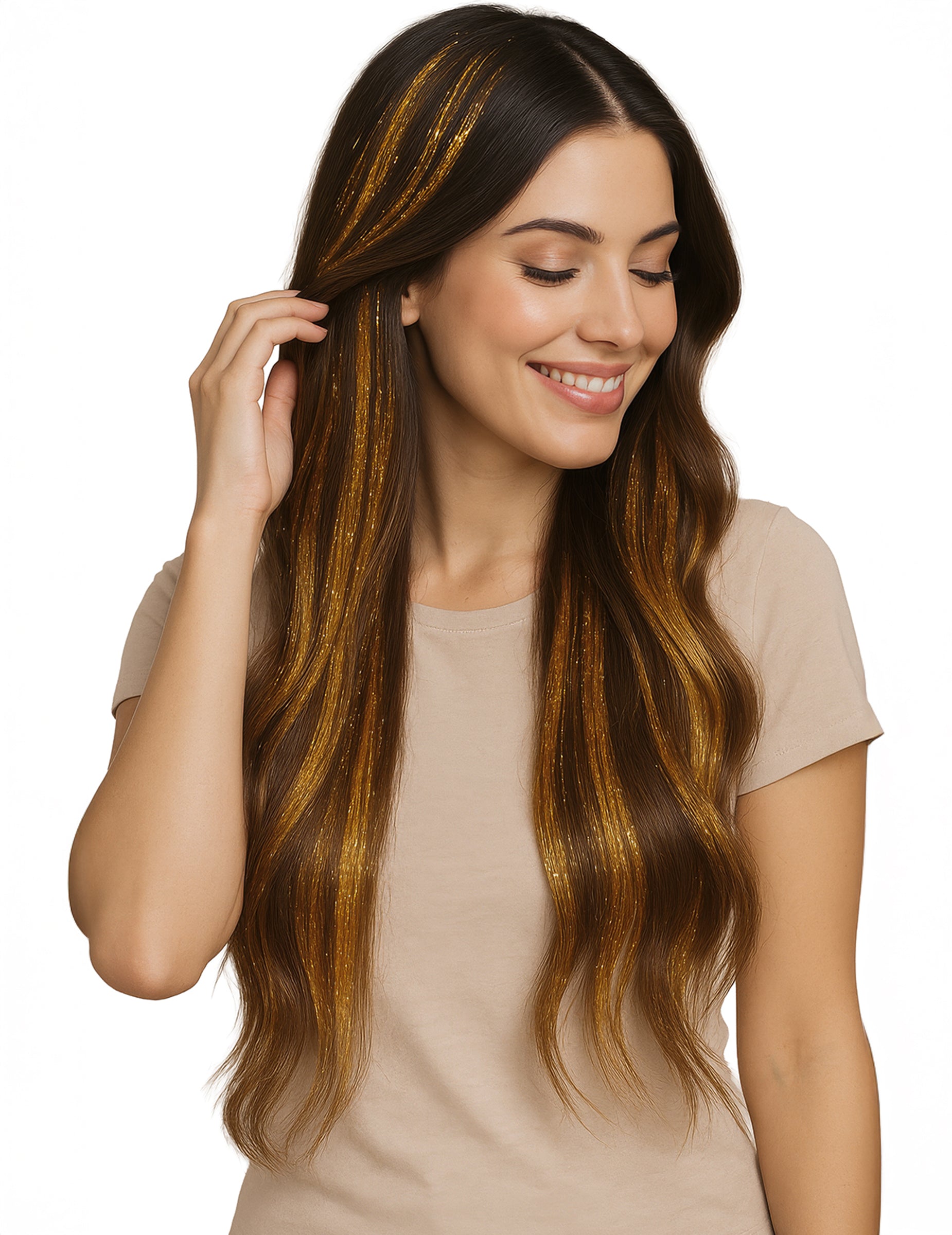 Illuminez vos coiffures avec ces 3 mèches dorées scintillantes de 50 cm. Faciles à poser grâce à leur système à clipser, elles se fixent rapidement pour transformer votre look en un clin d’œil. Idéales pour compléter un déguisement, sublimer un festival, une soirée ou un événement à thème, elles ajoutent éclat et glamour à vos cheveux. Leur couleur dorée brillante capte parfaitement la lumière pour un rendu élégant et festif.