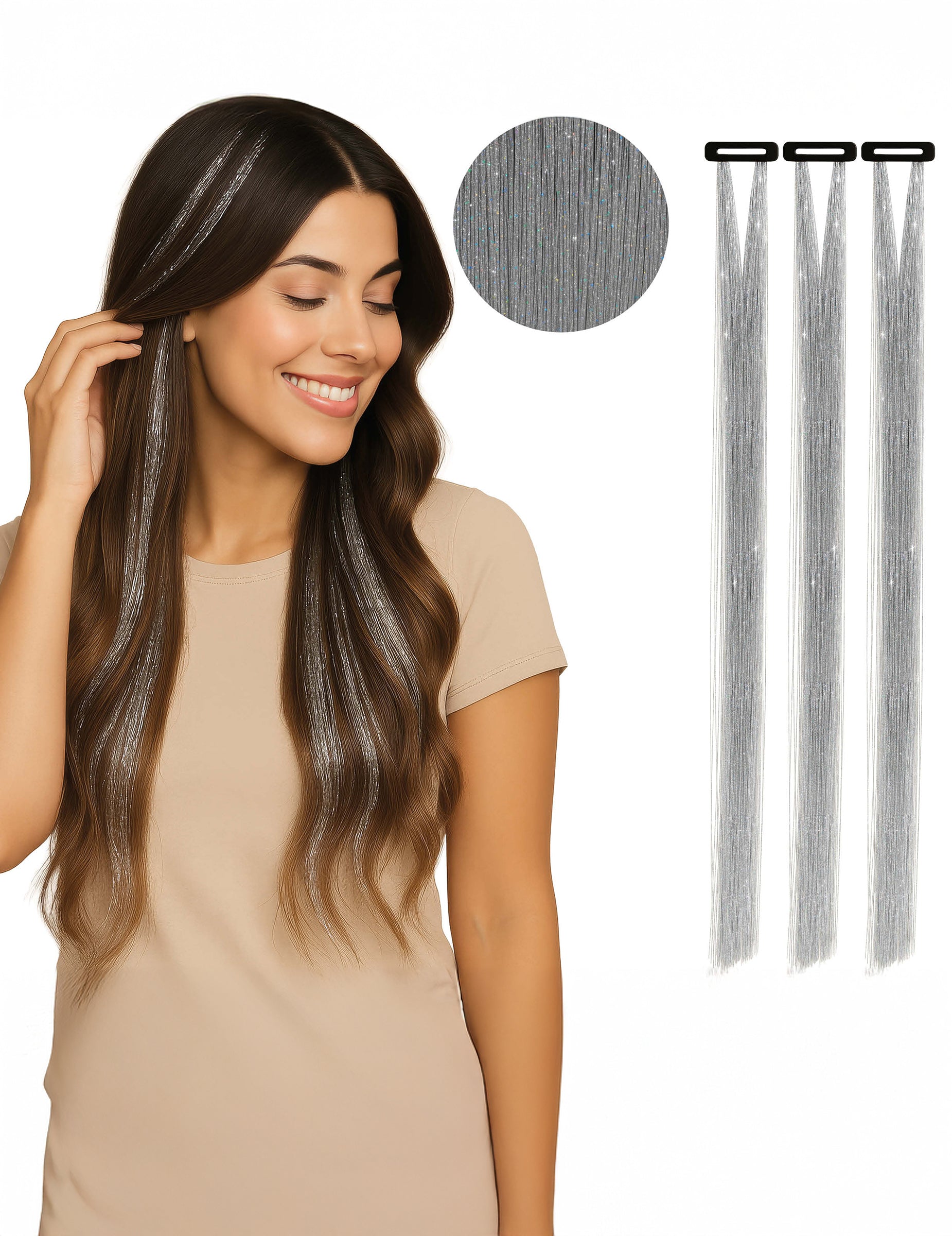 3 Mèches brillantes argentées 50 cm