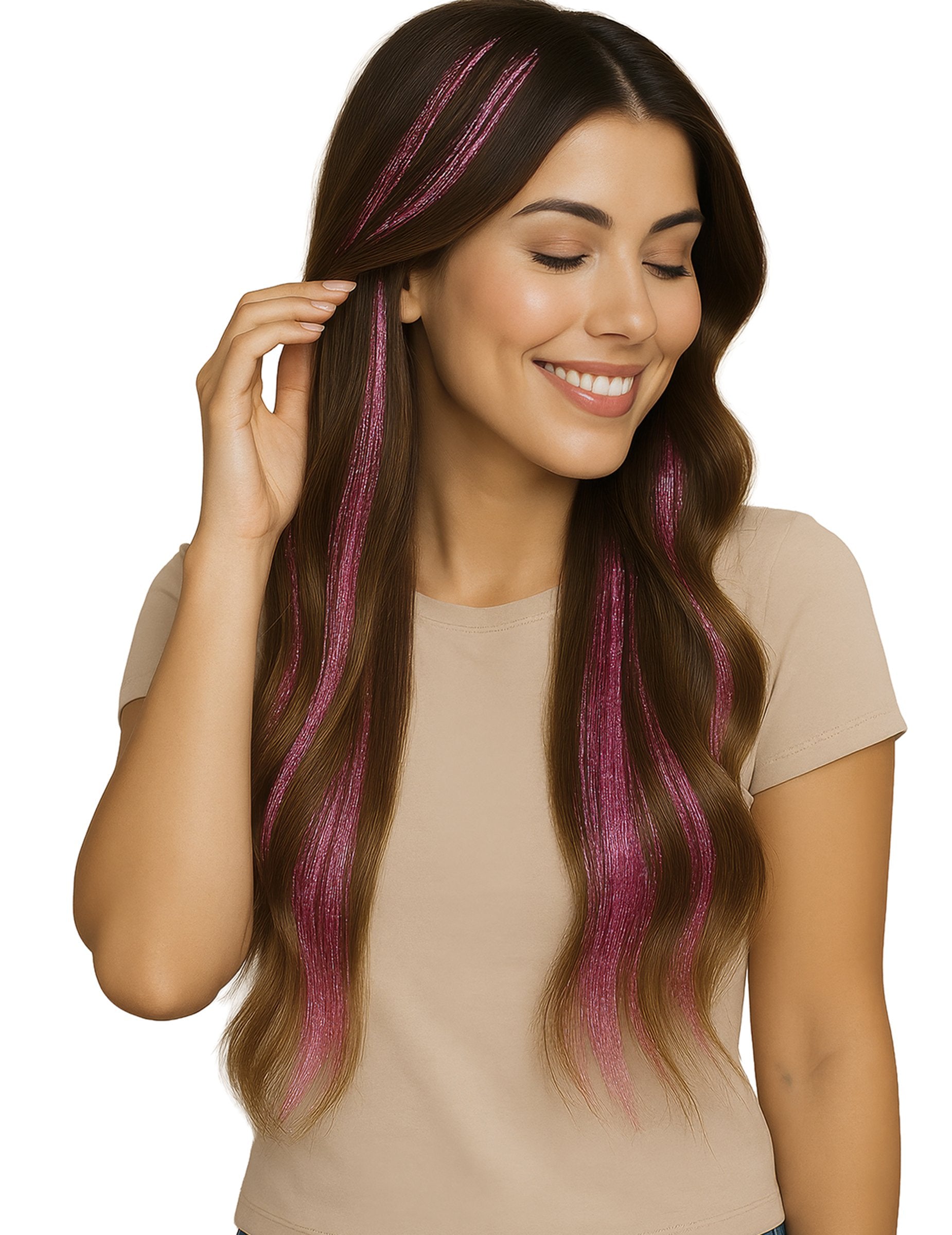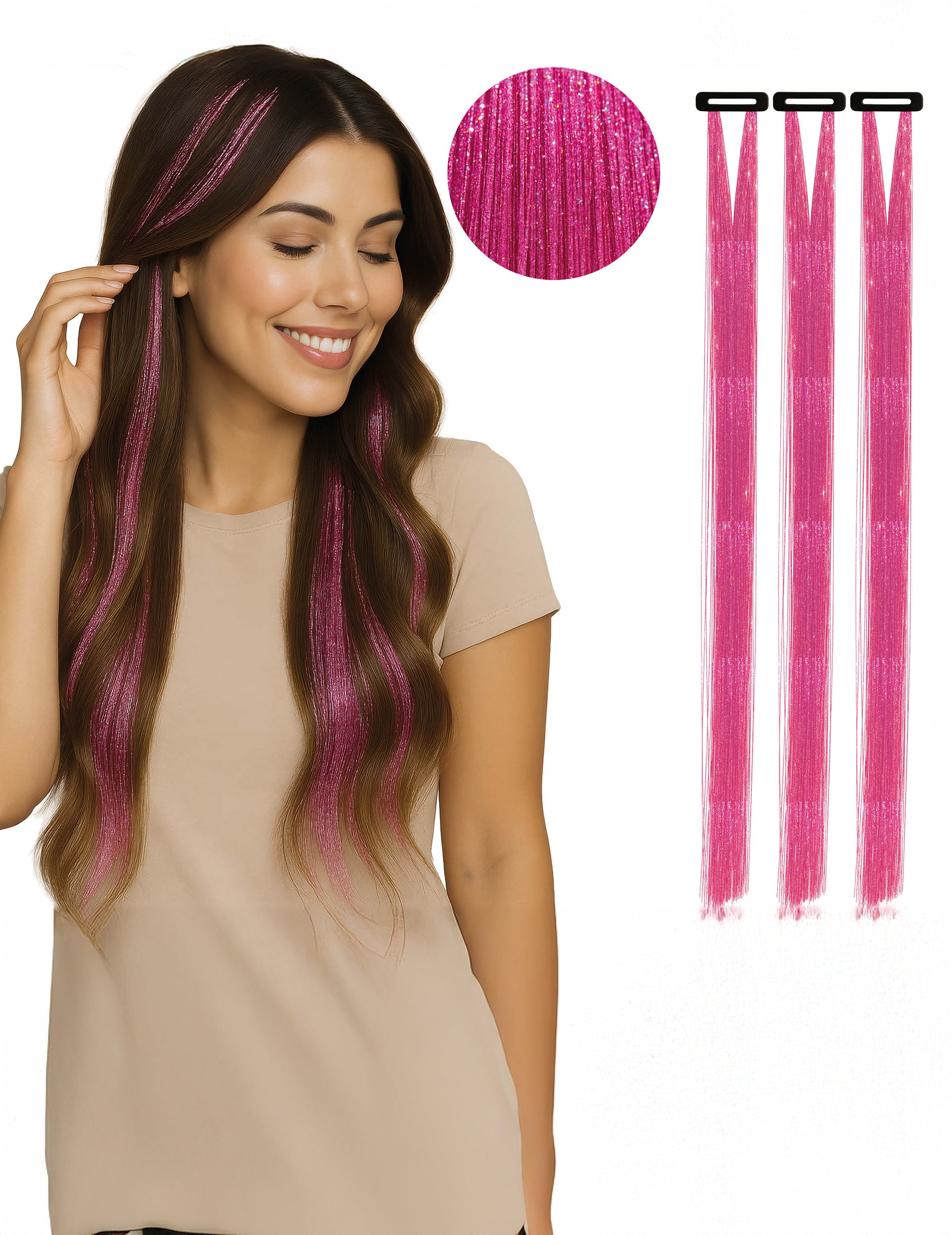 Dodajte sjaj i originalnost svojoj frizuri s ovim 3 sjajne ružičaste pramenove od 50 cm. Jednostavne za postavljanje zahvaljujući kopči, pričvršćuju se u trenu kako bi transformirale vaš stil i dale mu svečani štih. Idealne za zabave, karnevale, festivale ili kostimirane događaje, ove svjetlucave pramenove unose dozu glamura i živahnosti u vaš izgled. Nezaobilazan dodatak za osvjetljavanje vaše kose i privlačenje svih pogleda.
