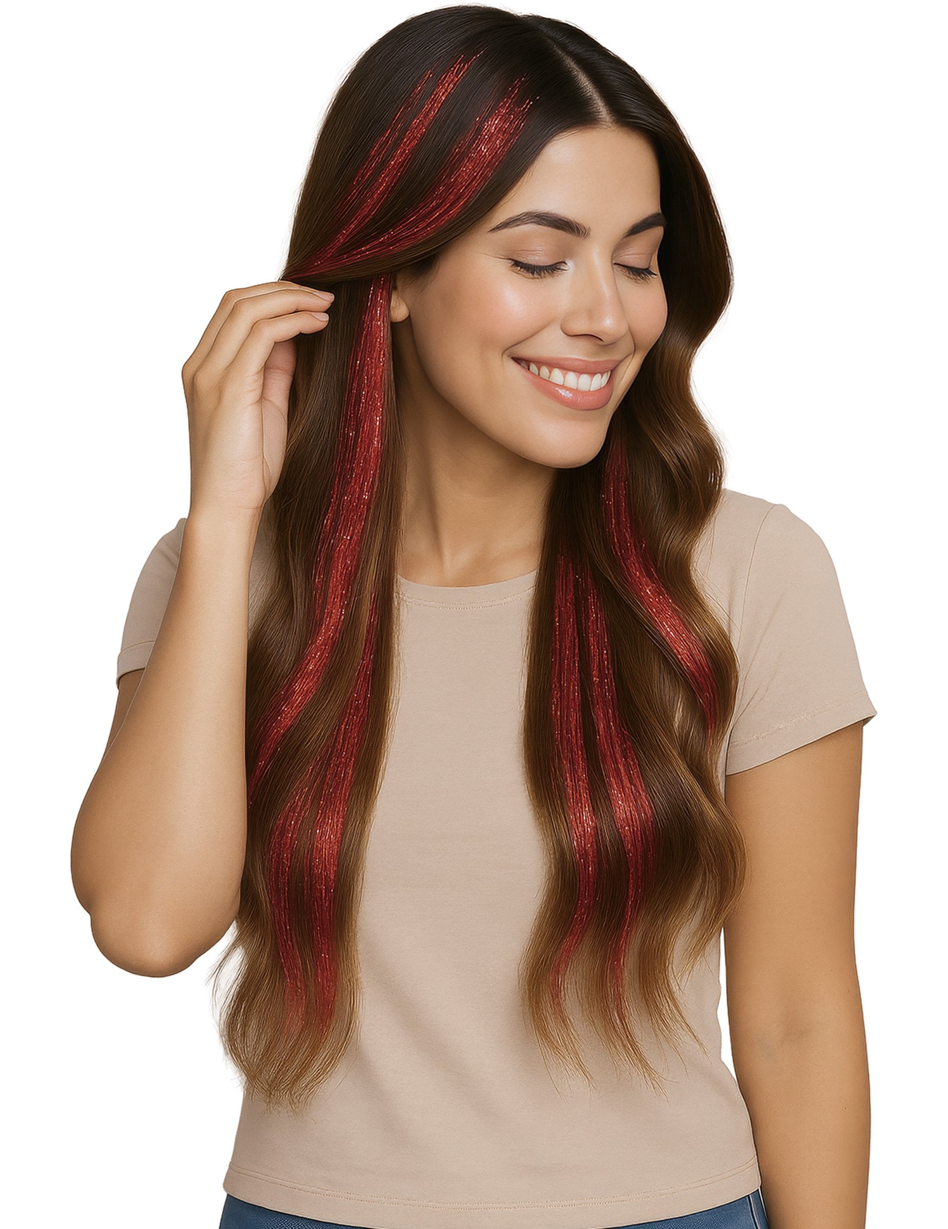Apportez une touche de lumière et de fantaisie à vos cheveux avec ces 3 mèches brillantes rouges de 50 cm. Faciles à clipser, elles se fixent en quelques secondes et transforment instantanément votre coiffure. Idéales pour les fêtes, soirées, carnavals ou déguisements, elles ajoutent éclat et glamour à votre look. Ces mèches rouges scintillantes sont l’accessoire parfait pour illuminer vos cheveux et attirer tous les regards.