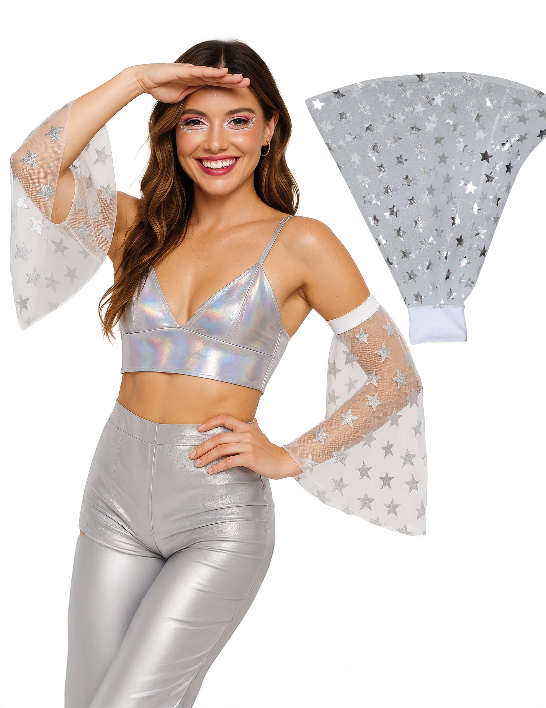 Dodajte blistav dodir svom kostimu s ovim srebrnim disco manžetama ukrašenim sjajnim zvjezdicama. Izrađene od laganog prozirnog tila, lako se nose zahvaljujući elastičnom zapešću, što osigurava udobnost i stabilnost tijekom cijele večeri. Idealne za disco izgled, festival, kostimiranu zabavu ili karneval, osvijetlit će vaše pokrete i naglasiti vaše plesne geste.