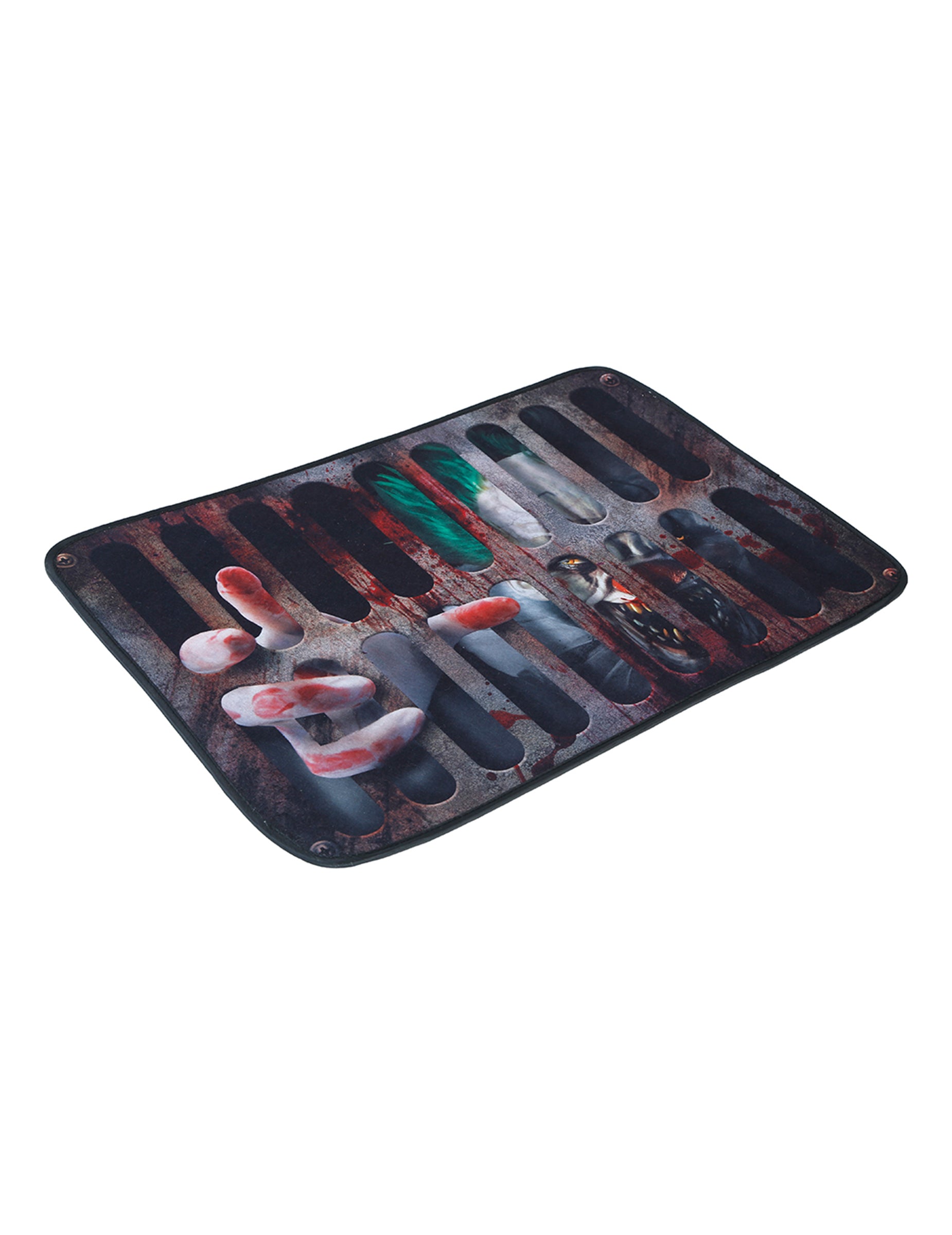 Ovaj otirač ubojica klaun 60 x 40 cm prikazuje noćnu moru: prodoran pogled iza rešetaka, krvave prste i zastrašujućeg klauna zatvorenog pod vašim nogama. Dekor podsjeća na napetu rešetku na podu, gdje nešto monstruozno pokušava pobjeći.