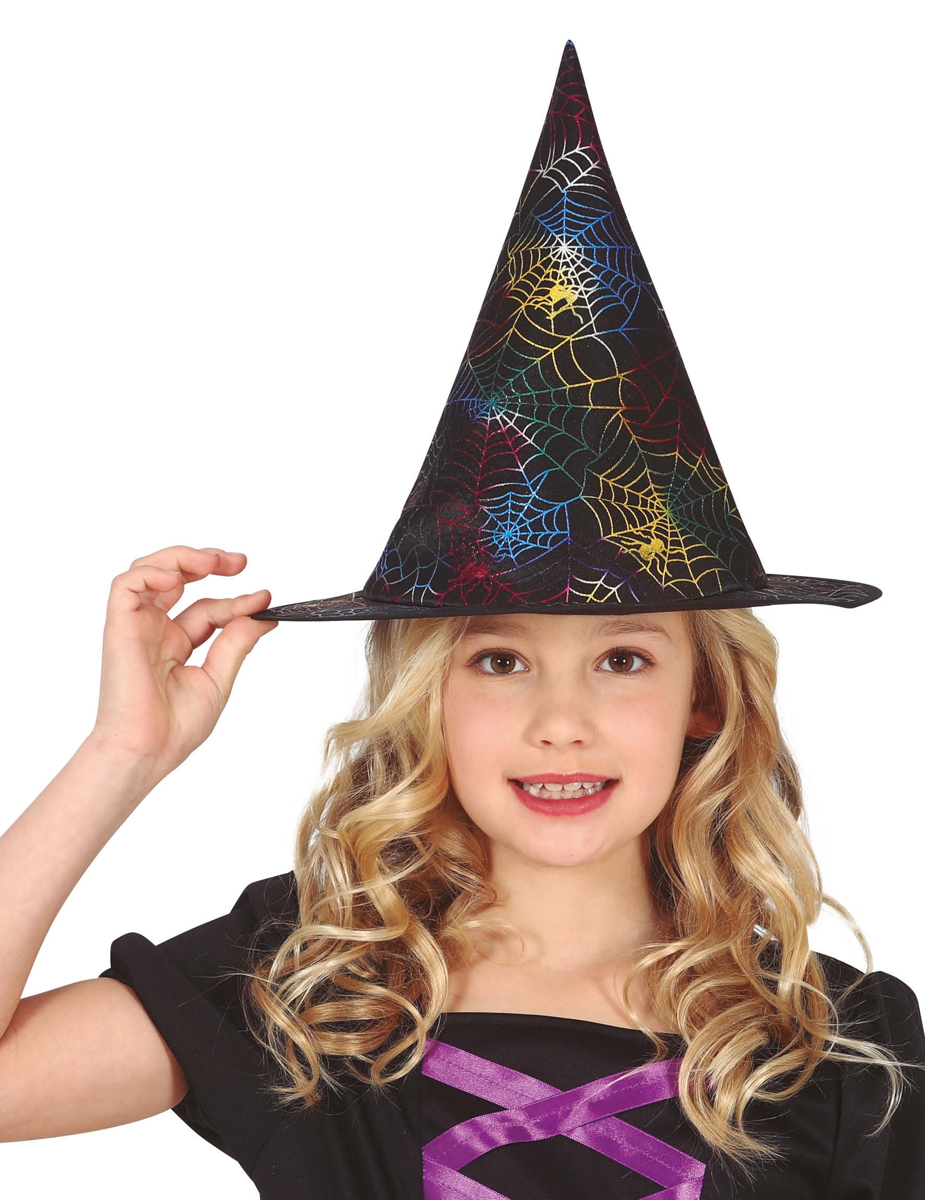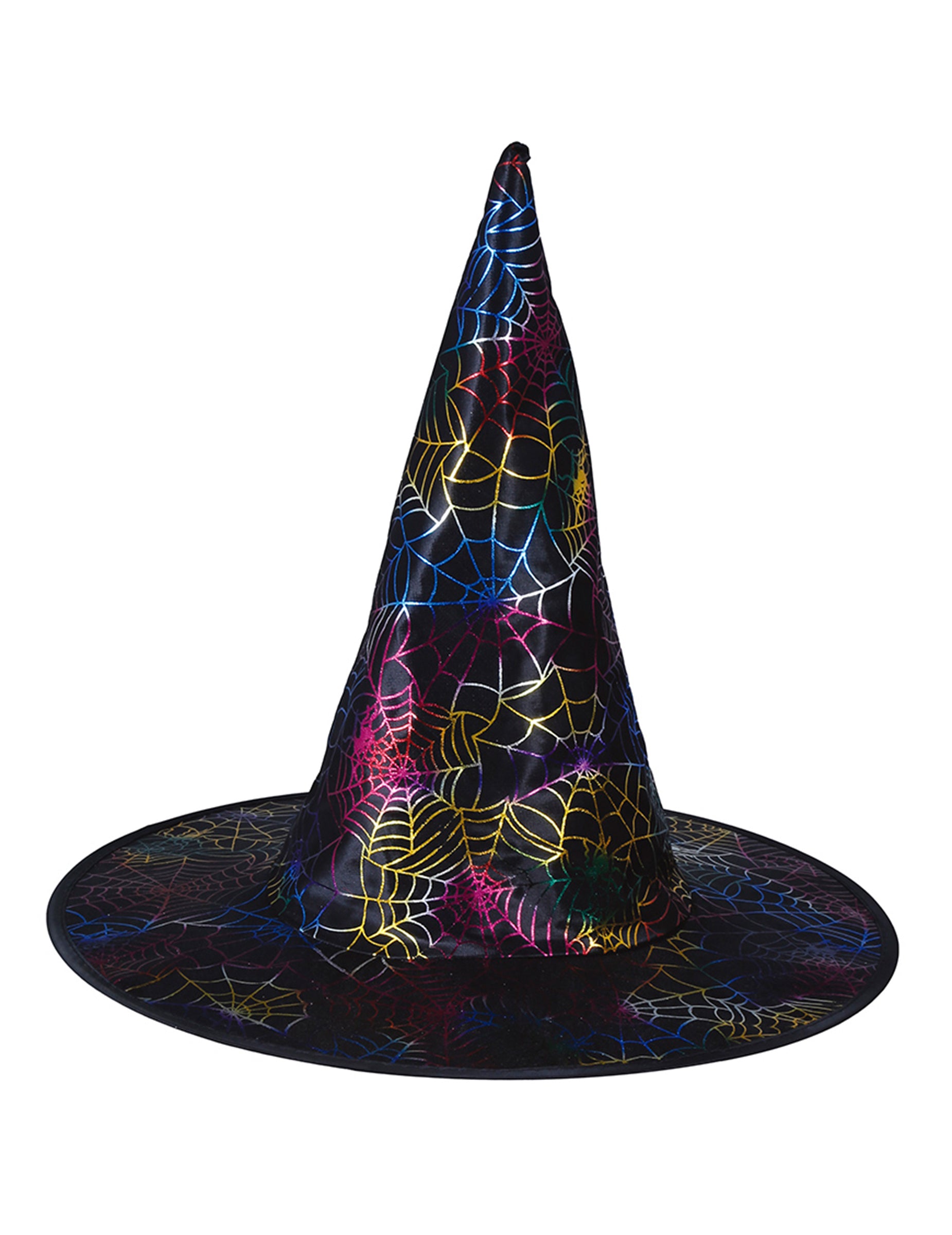 Ovaj crni šešir za vješticu ukrašen je prekrasnim šarenim paukovim mrežama koje svjetlucaju ovisno o svjetlu. Njegov tradicionalni šiljasti oblik i široki obod čine ga savršenim dodatkom za upotpunjavanje dječjeg kostima vještice. Originalan i sjajan, donosi dašak mašte i misterije na Noć vještica ili karneval.