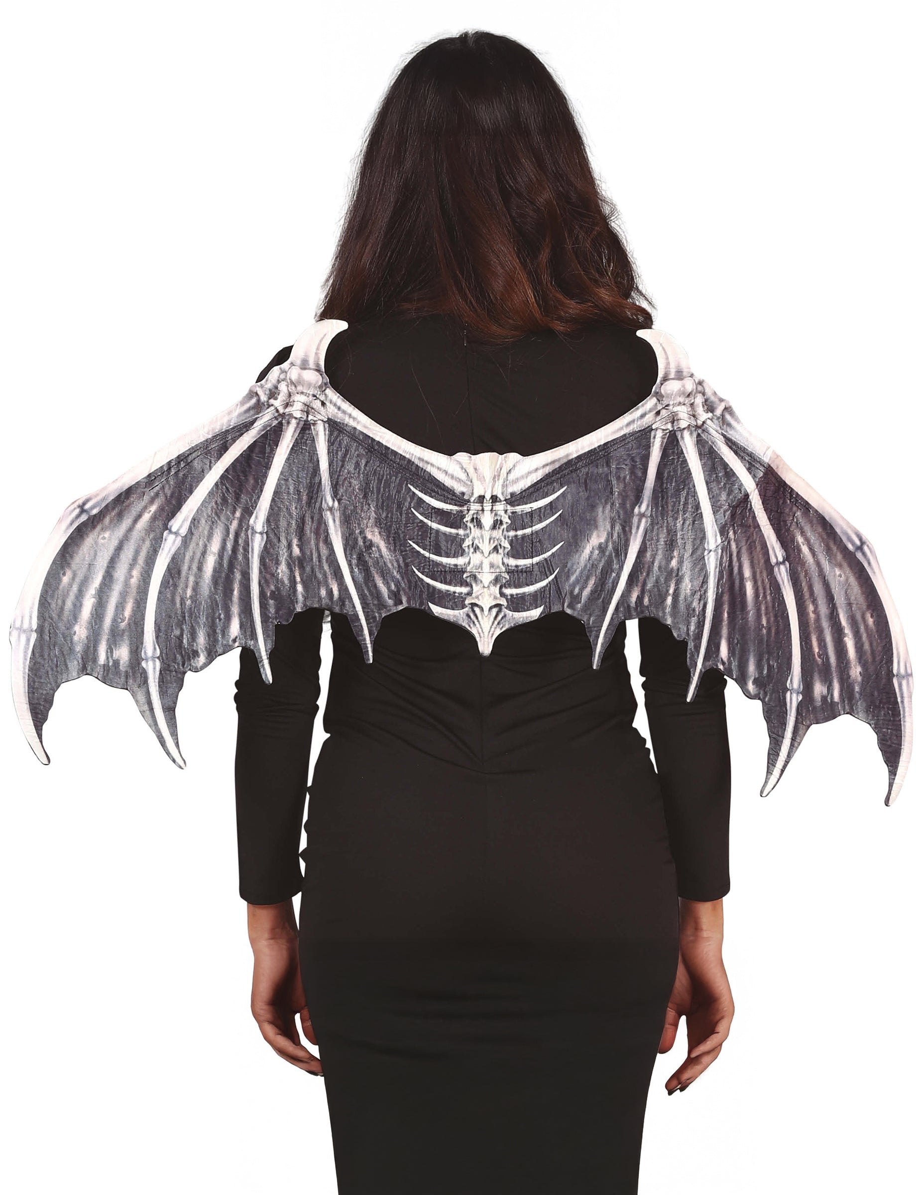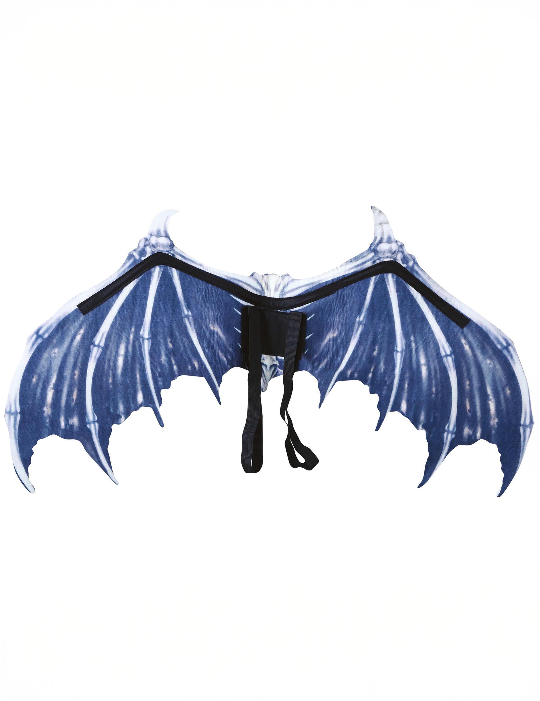 Ova krila šišmiša za odrasle mjere otprilike 80 x 40 cm. Izrađena su od tkanine, crne su boje s otiskom koji prikazuje kostur šišmiša.