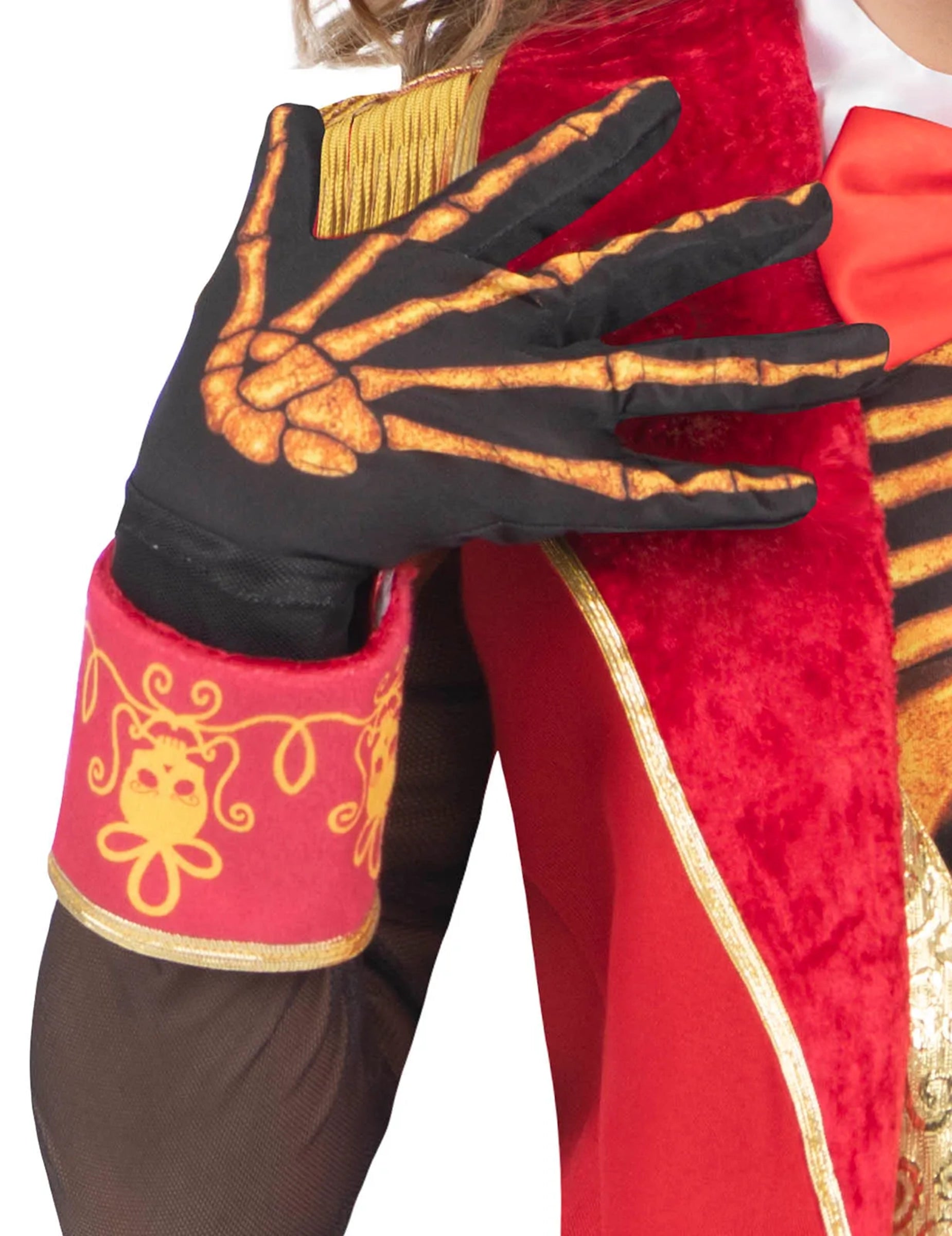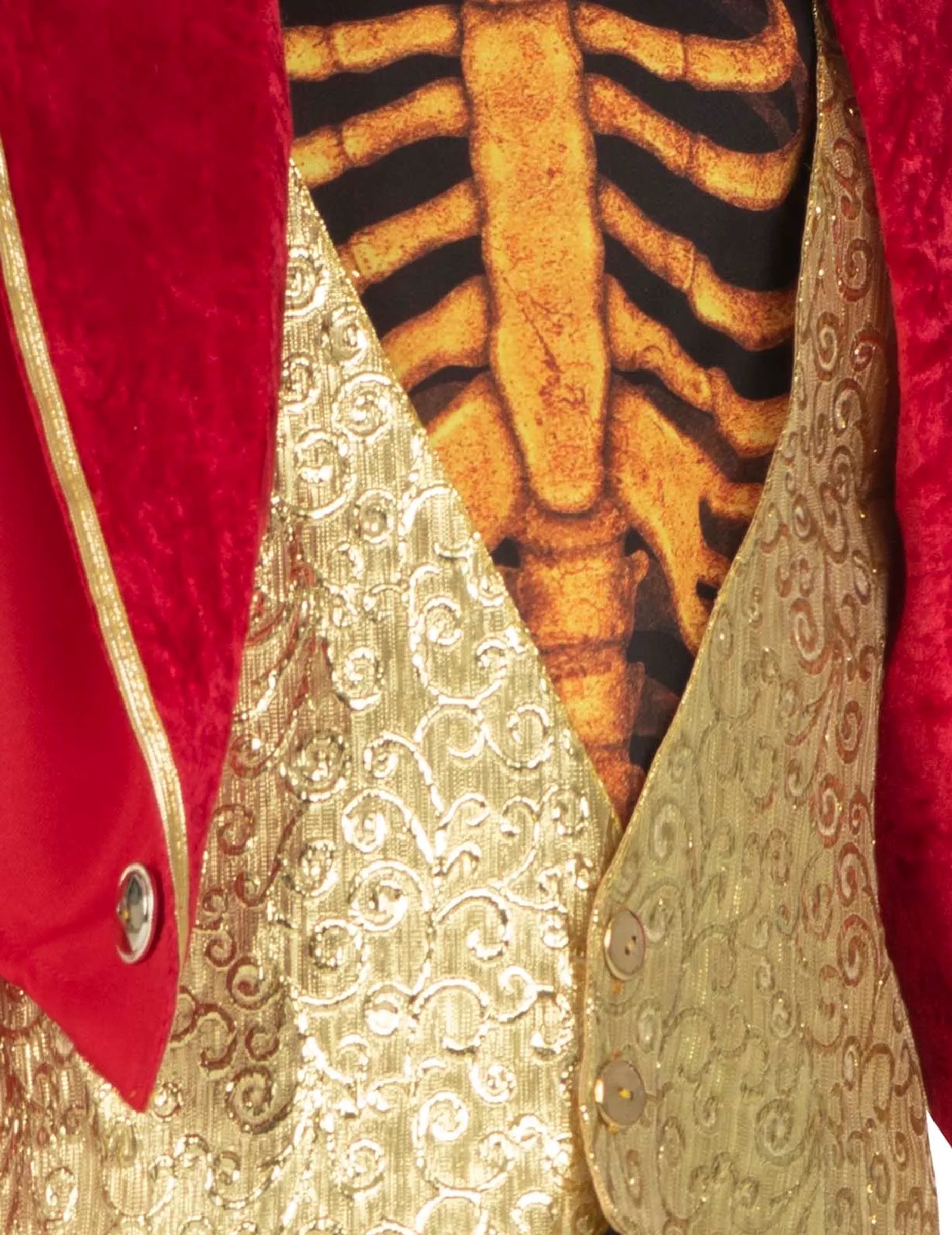 Crni cilindar sa zlatnom vrpcom upotpunjuje ovaj spektakularni izgled, dok rukavice s vidljivim kostima pojačavaju efekt kostura sve do vrhova prstiju. Na kraju, crne navlake za čizme savršeno zaokružuju kostim.