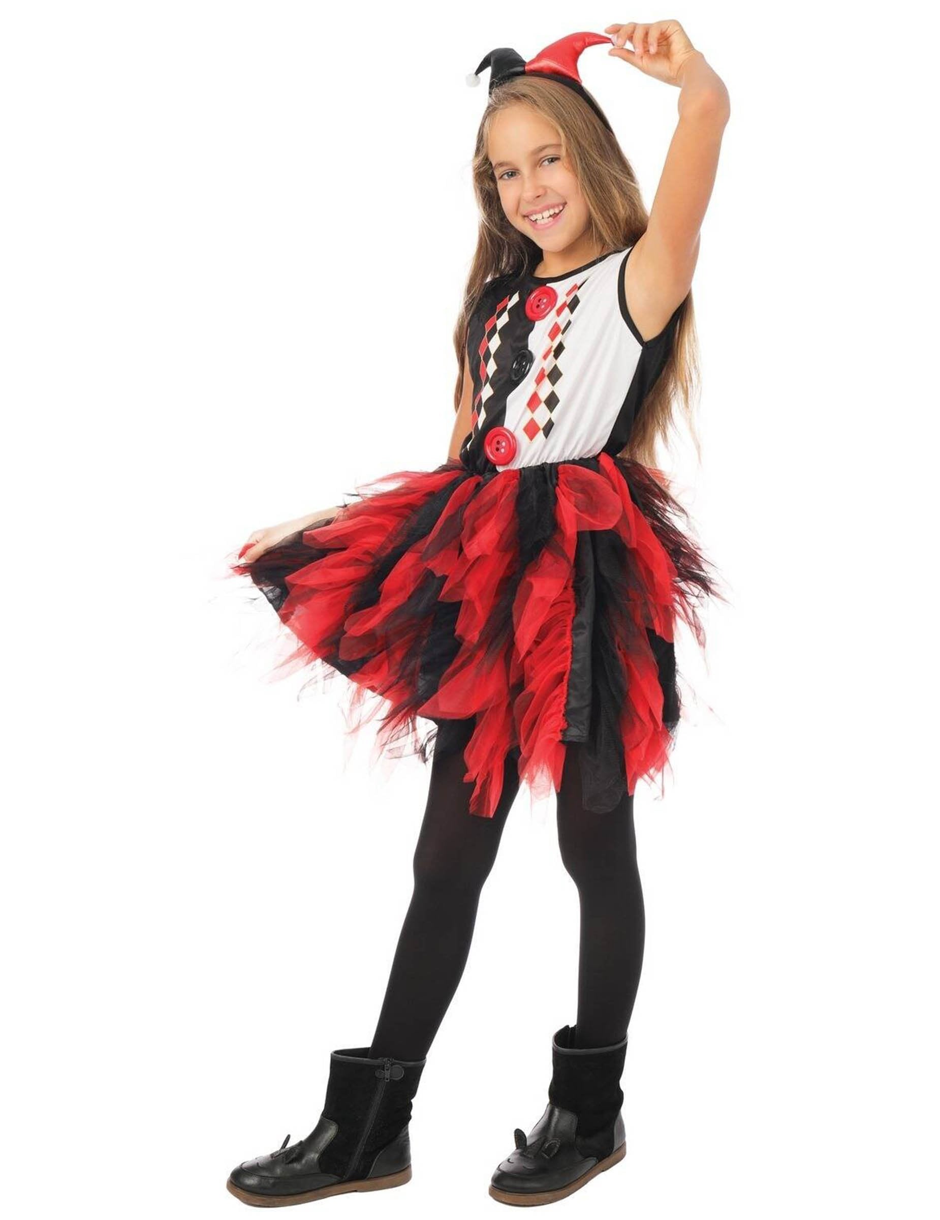 Ovaj kostim harlekina za djevojčice sastoji se od dvobojne crno-bijelo-crvene haljine ukrašene podsuknjom od crnog i crvenog tila za dodatni volumen i svečani izgled.