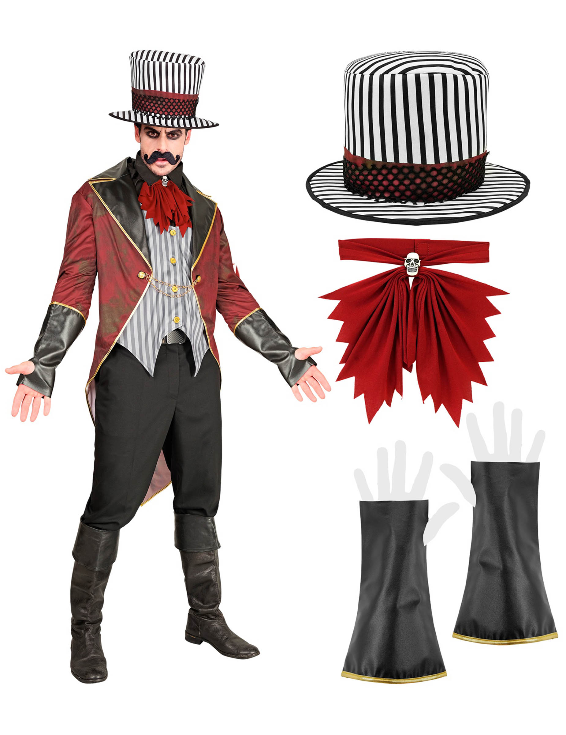 Postanite gospodar zastrašujućeg cirkusa s ovim kostimom zlokobnog cirkuskog direktora. U kompletu se nalazi dugi crveni frak s integriranim prslukom, krvavocrvena jabot marama, crne rukavice bez prstiju i crno-bijeli prugasti cilindar. Cijeli komplet stvara teatralan i jeziv izgled, savršen za impresionirati vaše goste na maskiranoj zabavi.