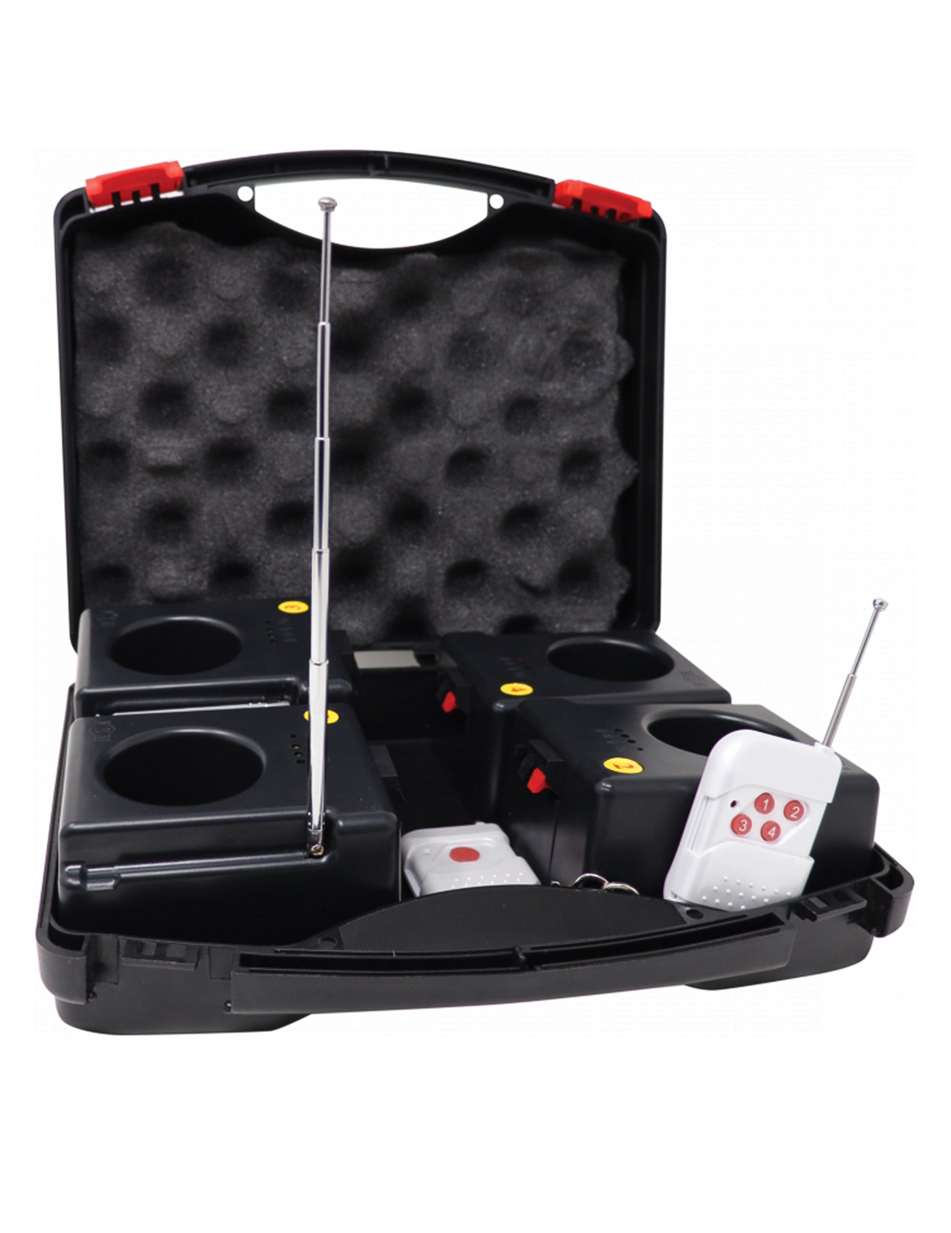 Ovaj daljinski upravljač sadrži 4 držača za scenske fontane i omogućuje vam da pokrenete vaše pirotehničke efekte sinkronizirano i sigurno. Kompaktan i jednostavan za transport, dolazi u obliku kofera za pohranu u kojem se nalaze četiri pojedinačna držača koji se mogu zasebno postaviti prema željenoj konfiguraciji.