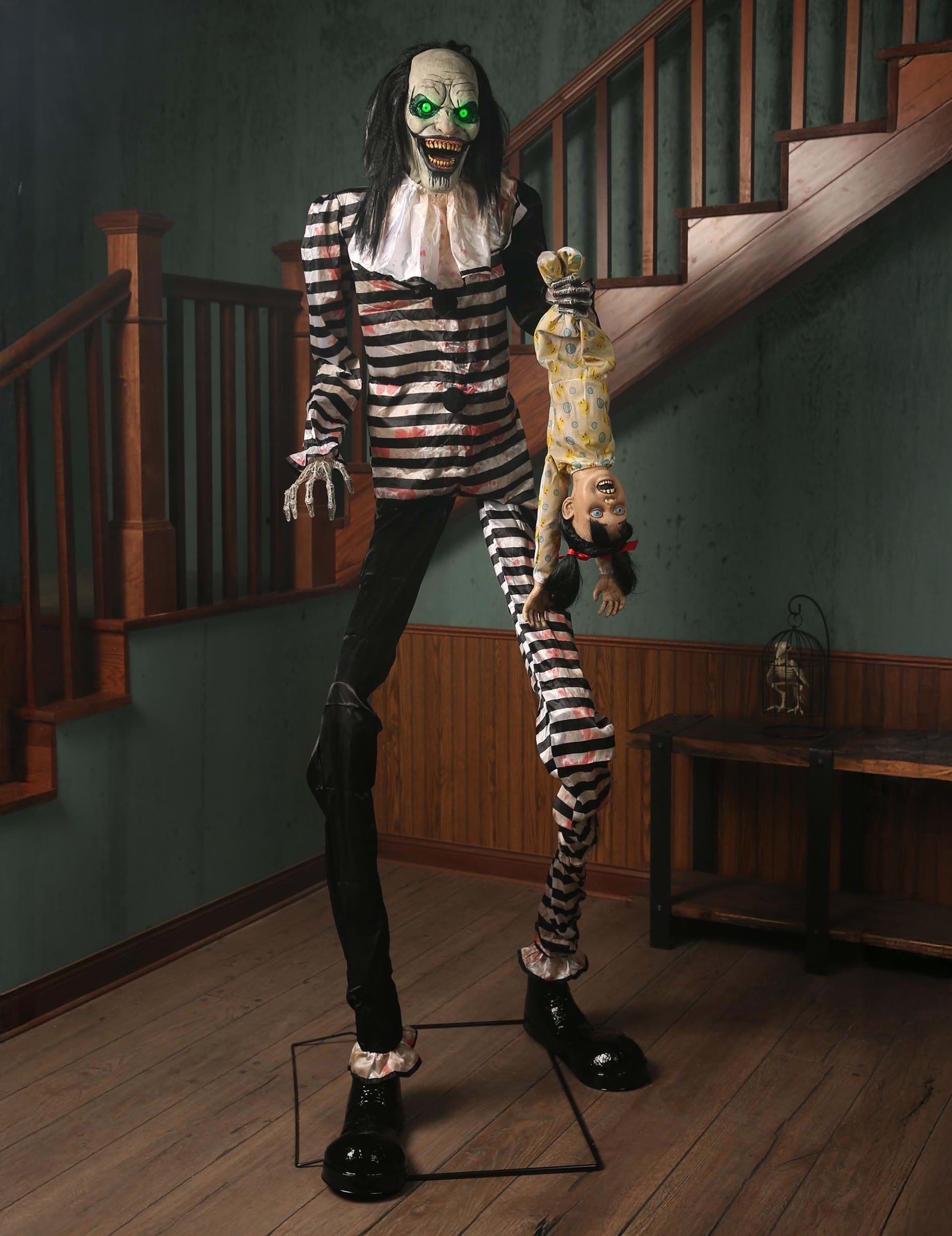 Ovaj zastrašujući animirani klaun od 2,15 metara jedan je od najneometanijih ukrasa za nezaboravnu scenu za Noć vještica. Svojim blistavim pogledom, pokretnom čeljusti i zlim osmijehom, odmah postavlja ton. Lik se kreće u stranu držeći dječju lutku ovješenu nogama, što vrišti svakim pokretom. Kontrast njegovog kostima klauna i izraza njegove žrtve stvara atmosferu koja je jeziva i spektakularna. Animacija se automatski pokreće zahvaljujući infracrvenom senzoru, a zvučni volumen prilagodljiv je za prilagodbu vašem dekoru. Radi na mreži za kontinuirani učinak tijekom cijele večeri.