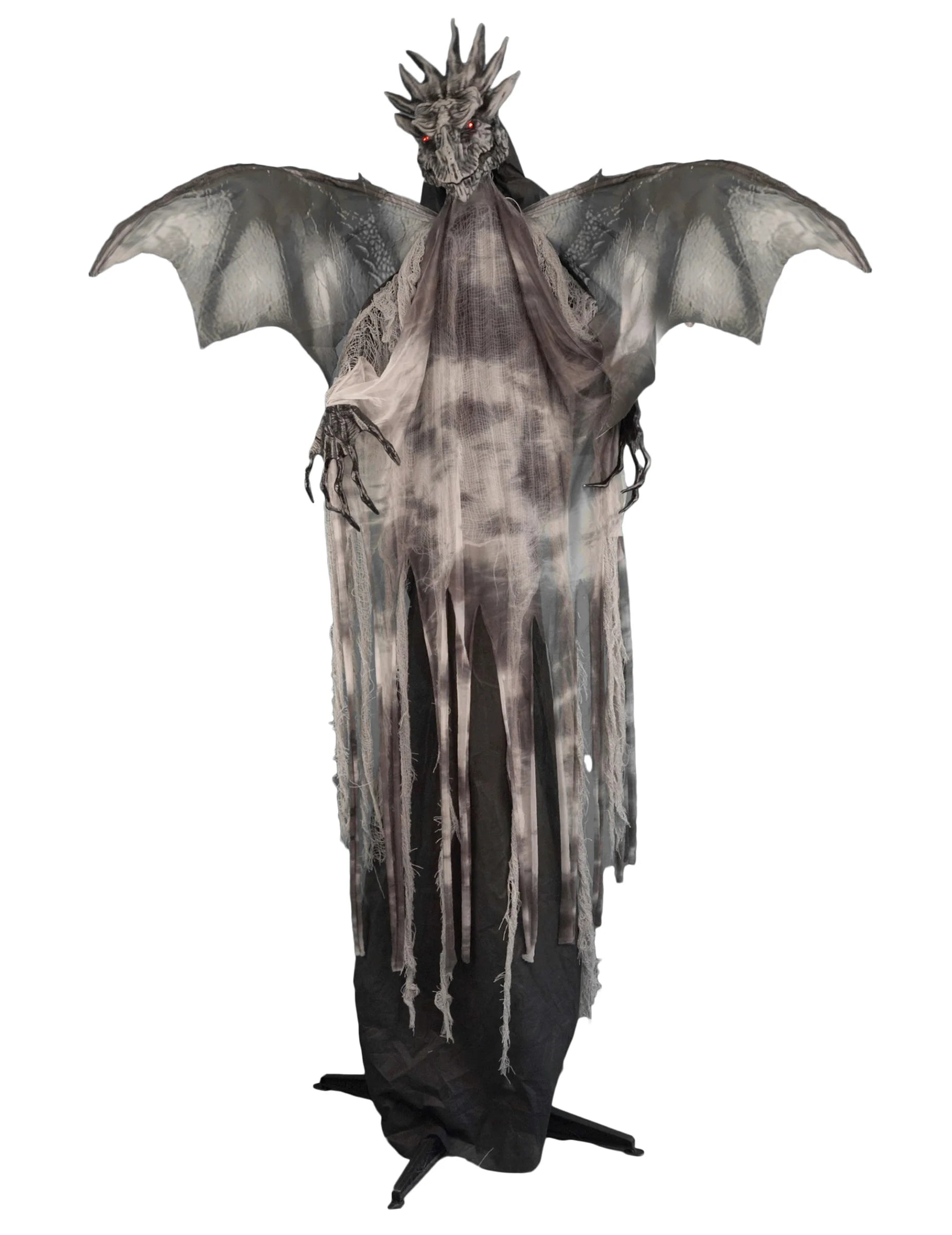 Dodajte epski dodir svom Ukrasi za Noć vještica s ovim Animirani divovski zmaj od 175 cm cmNjegova impozantna krila, zastrašujuće lice i svjetleće LED oči stvaraju spektakularnu prisutnost.