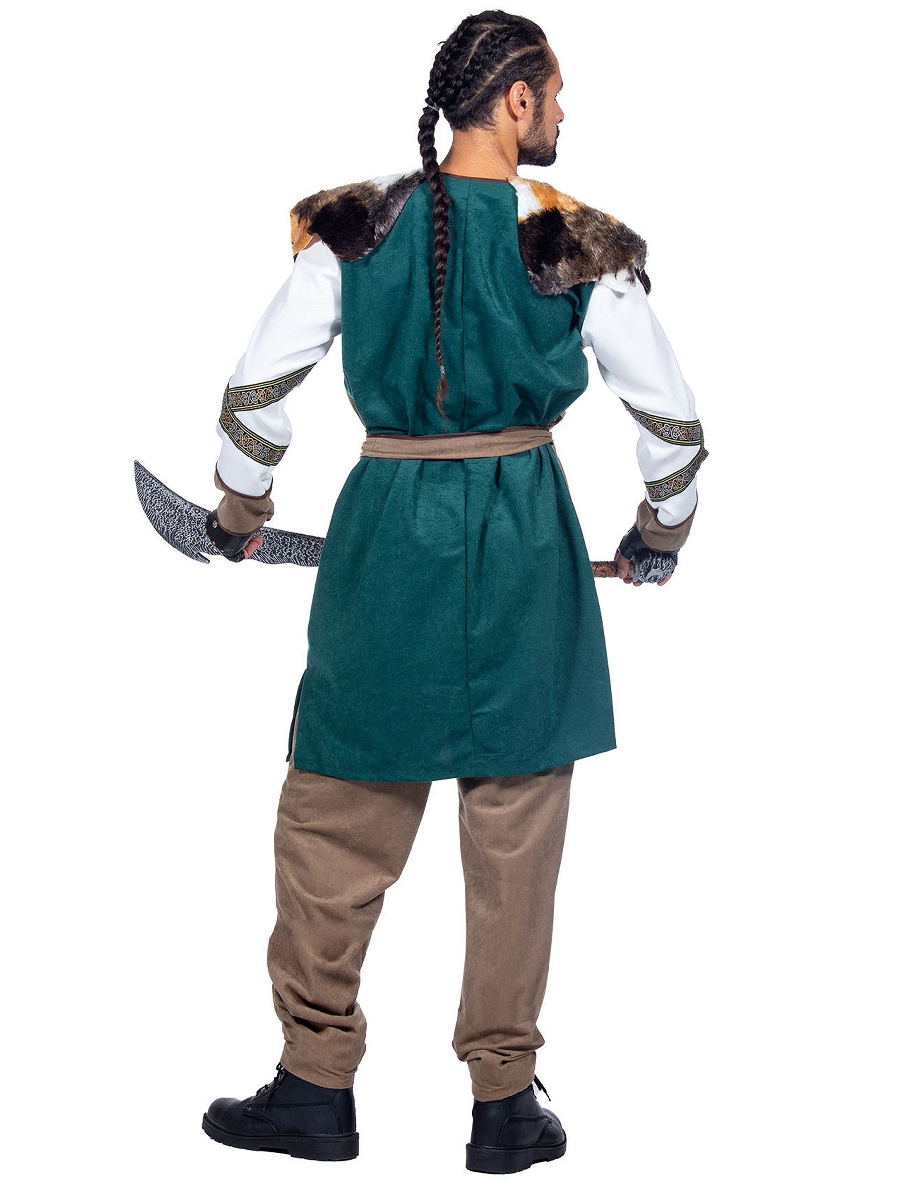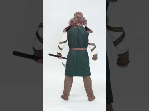 Izrađen od kvalitetnog poliestera, ističe se zeleno-smeđom tunikom ukrašenom zlatnim trakama i pažljivo izrađenim detaljima koji podsjećaju na nordijsku srednjovjekovnu estetiku. Bijeli rukavi elegantno kontrastiraju s ostatkom kostima, dok pojas omogućuje prilagodbu veličine za optimalnu udobnost. Ramena su ukrašena umjetnim krznom kako bi se pojačao realističan i veličanstven dojam, dostojan vikinškog ratnika spremnog za borbu. Kostim je lagan i ugodan za nošenje, pruža slobodu pokreta i izdržljivost.