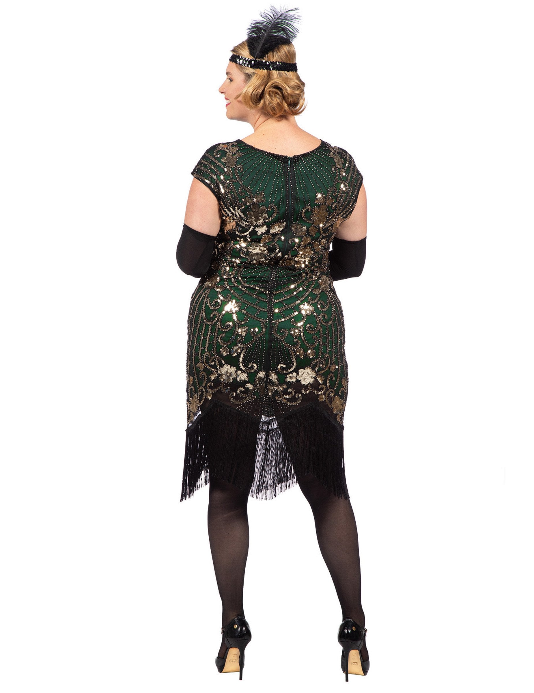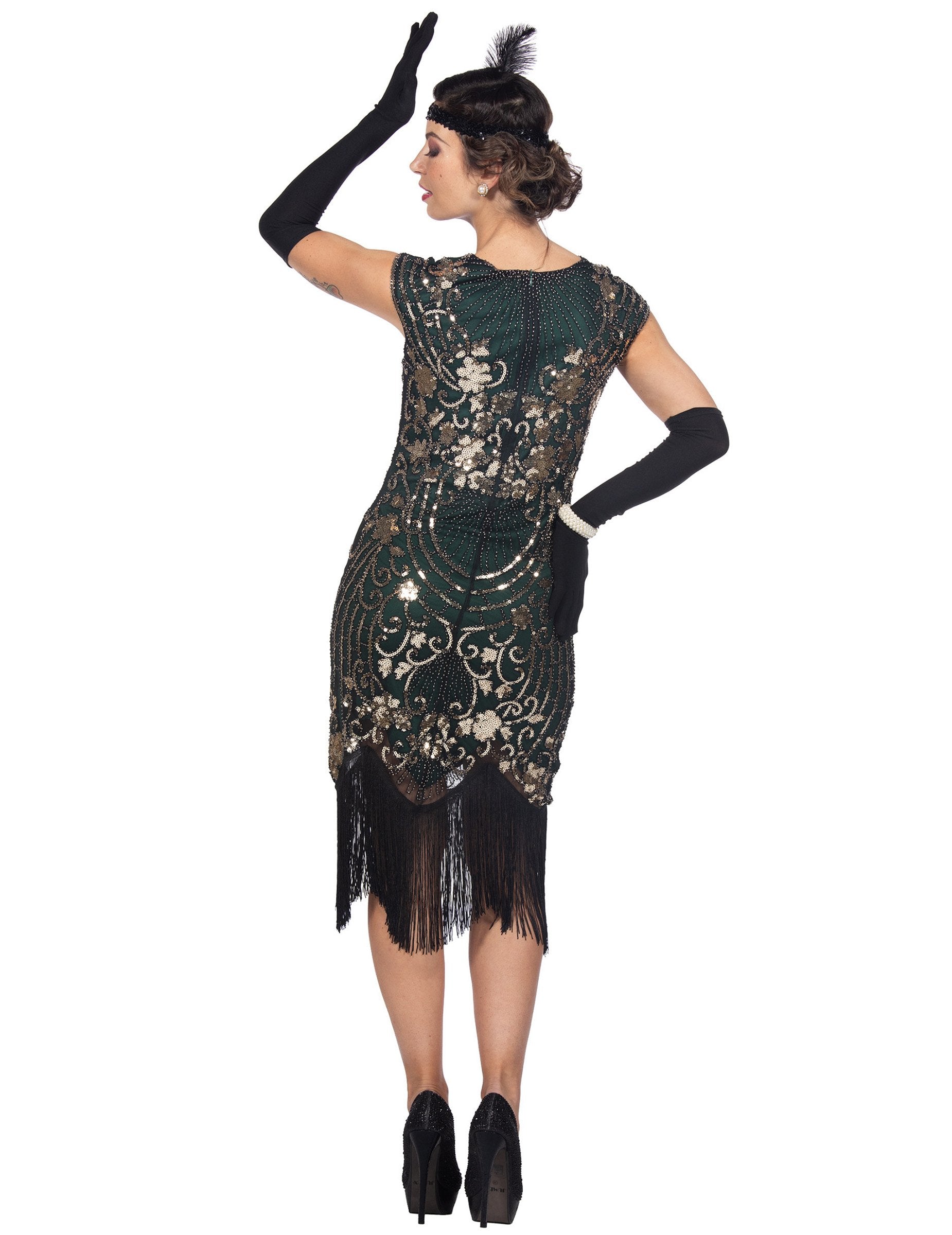 Izrađena od kvalitetne tkanine, haljina je u potpunosti ukrašena zelenim i zlatnim šljokicama koje čine prekrasne geometrijske uzorke, dok ravni kroj elegantno naglašava siluetu. Crne rese na donjem dijelu haljine dodaju pokret i lakoću svakom plesnom koraku, podsjećajući na autentični Charleston stil.