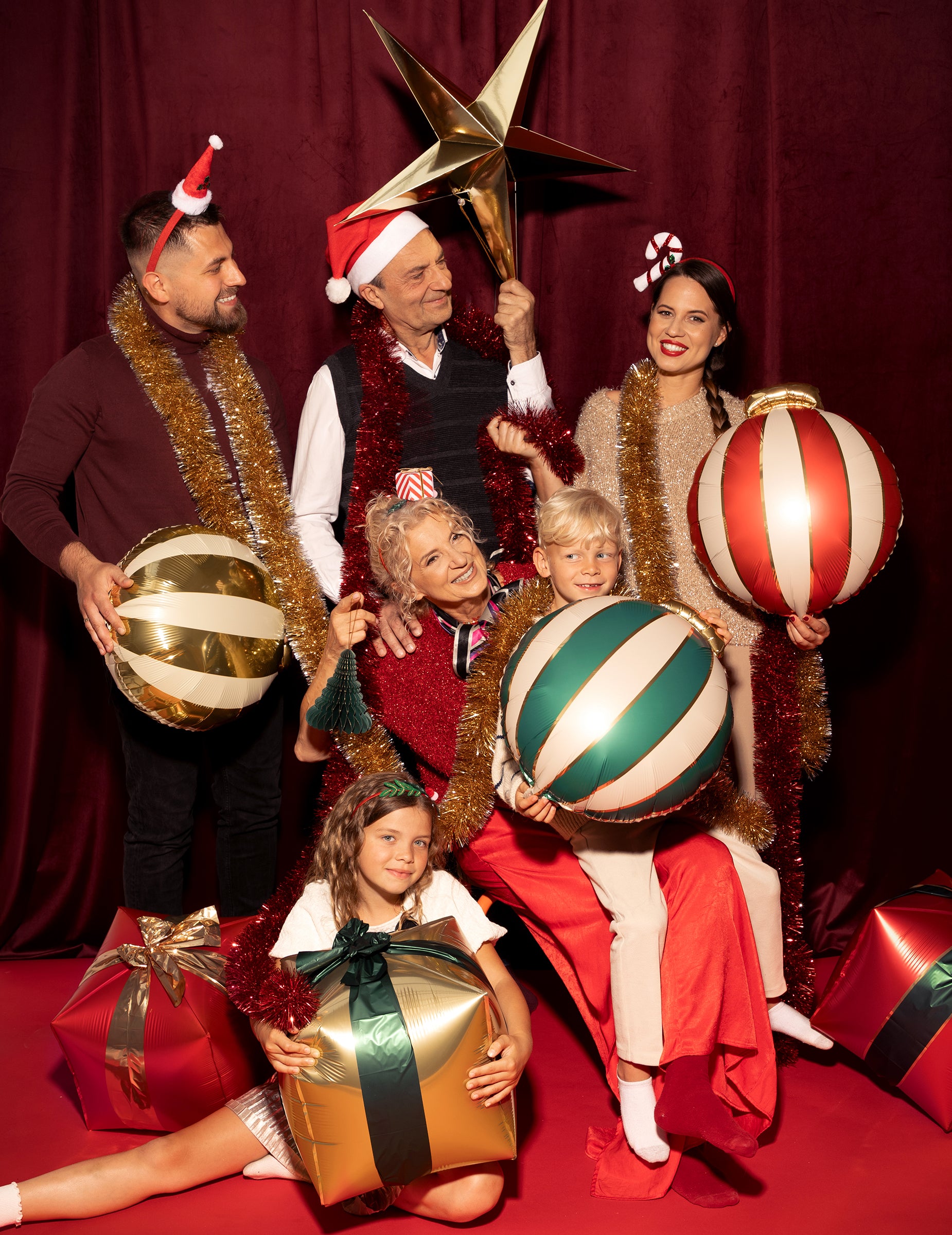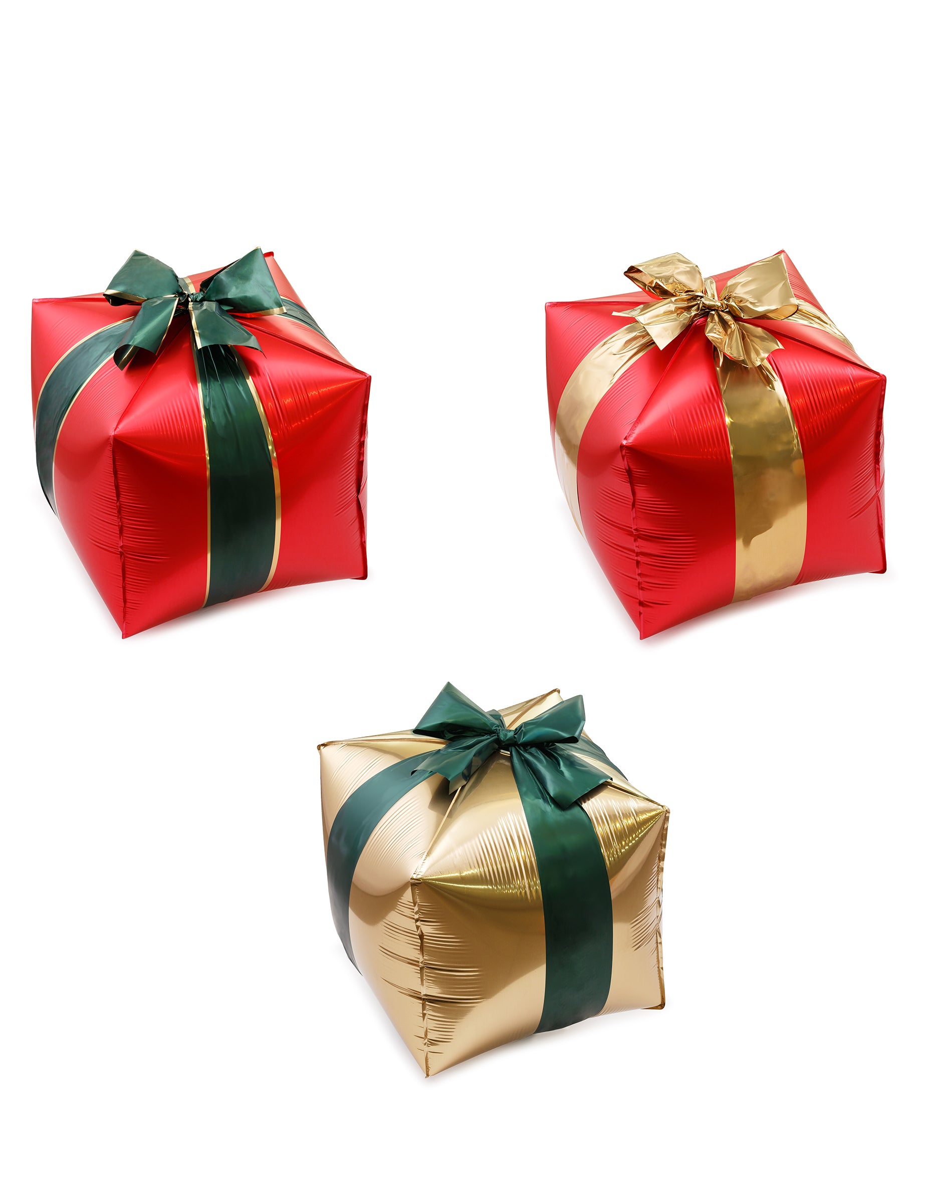Aluminijski baloni Božićni pokloni 34 x 36 cm vjerno prikazuju izgled lijepih poklona, ukrašenih sjajnim vrpcama i velikim mašnama. Svaki balon u obliku kocke dolazi u tradicionalnim bojama koje spajaju zlatnu, jarkocrvenu i tamnozelenu kako bi dočarao pravi božićni ugođaj.