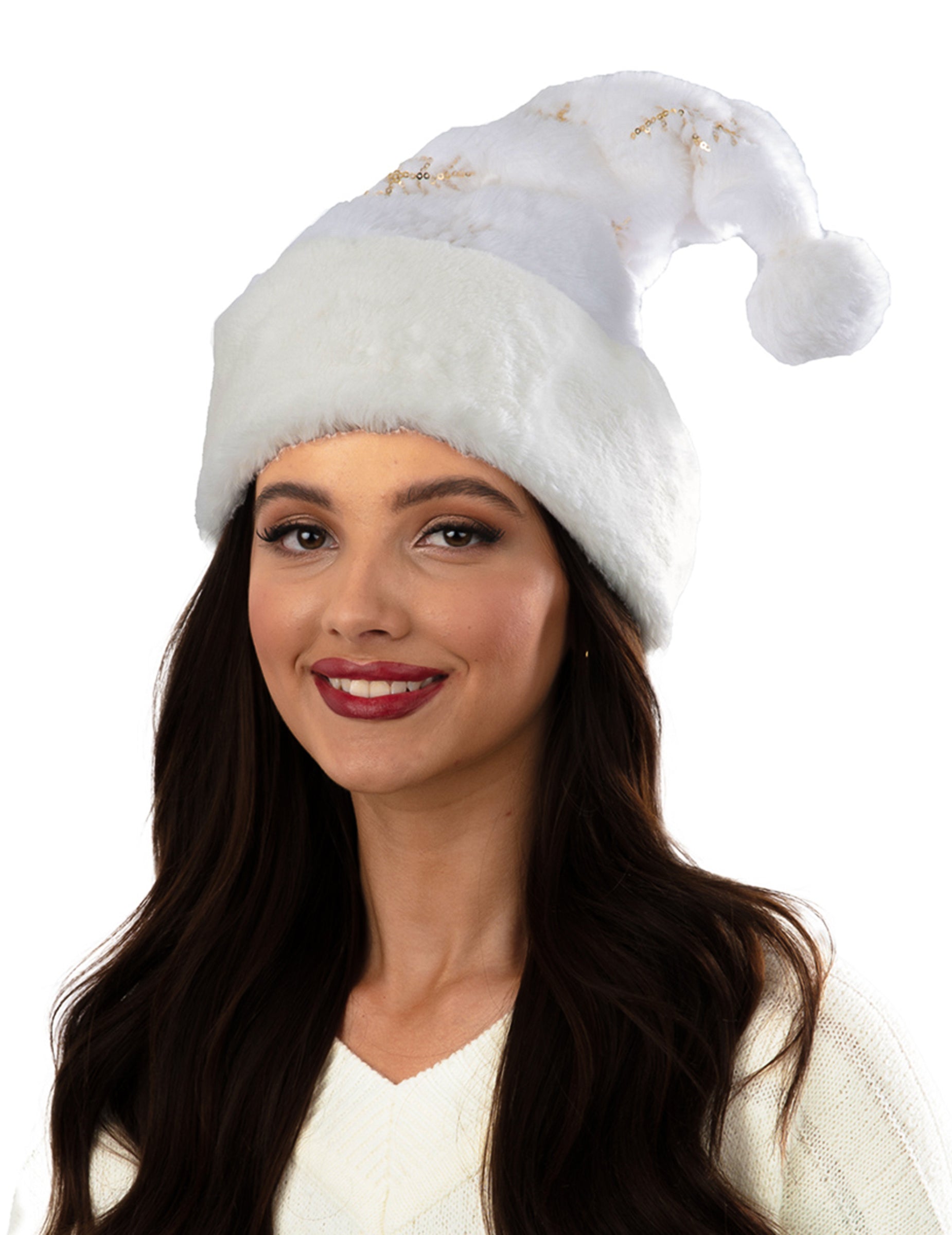 Dodajte elegantnu i luksuznu notu svom izgledu s ovim bijelim božićnim kapom od baršuna, ukrašenim zlatnim pahuljama od šljokica.
