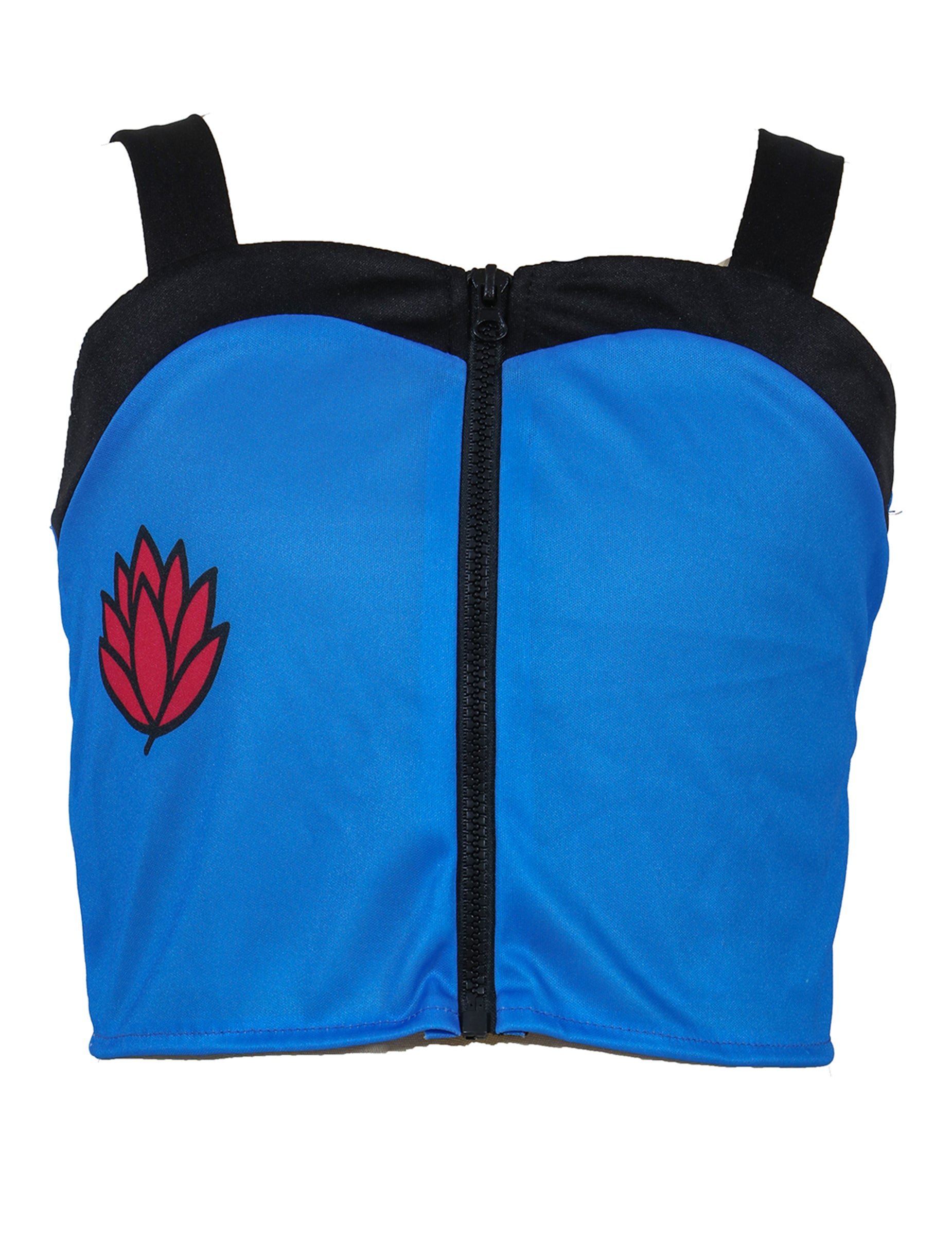 Sastoji se od kratkog plavog topa s patentnim zatvaračem i kontrastnim crnim naramenicama te širokih plavo-žutih hlača s velikim džepovima, što pruža udobnost i slobodu pokreta. Pažljivo izrađeni detalji i žive boje podsjećaju na razigrani i stilizirani svijet najpopularnijih glazbenih spotova.