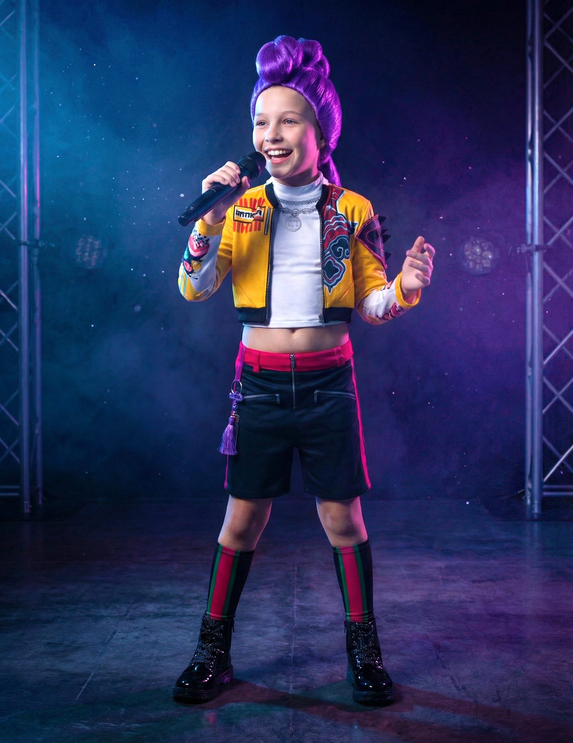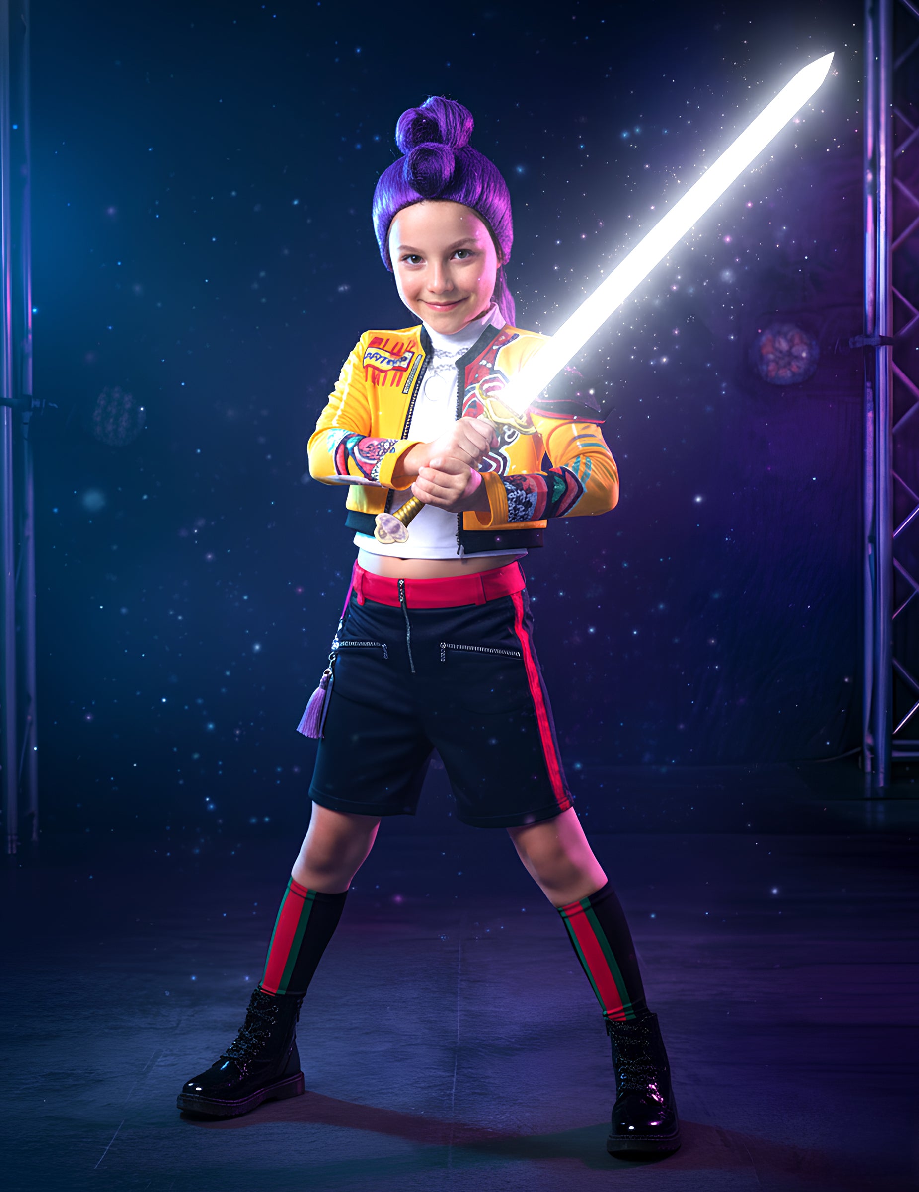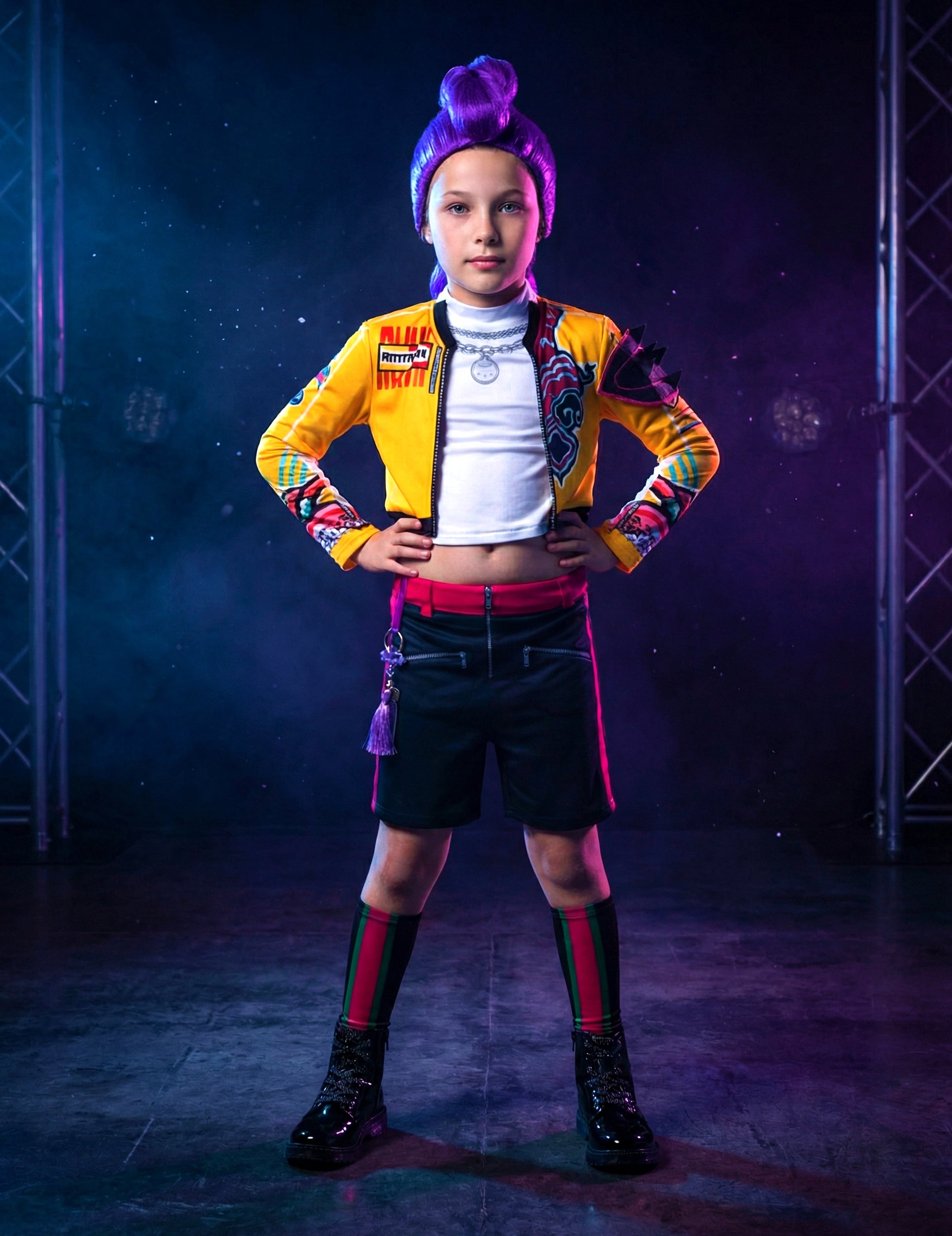 Jakna s grafičkim, šarenim detaljima, naglašena lažnim "demon" ramenom, donosi odvažan izgled, dok elastični struk kratkih hlača pruža udobnost i sigurnost za ples, igru ili povorku. Gamaše s ružičastim i zelenim prugama daju neodoljivu pop notu, savršenu za K-pop stil. Izrađen od laganih i ugodnih materijala, ovaj kostim spaja žive boje, tiskane detalje i pažljivo završene rubove.