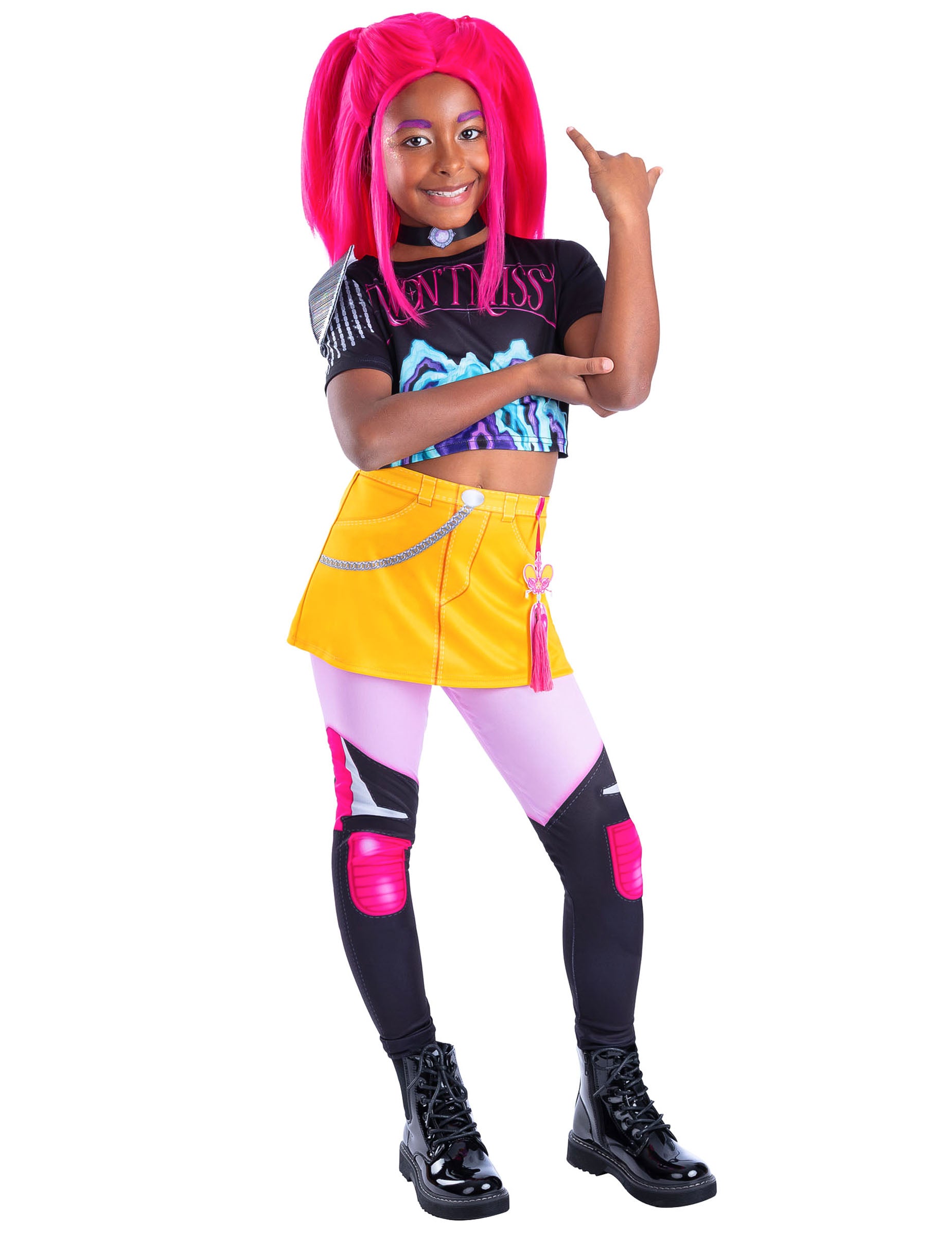 Kostim Mira Kpop Demon Hunter™ za djevojčice uključuje crni top s printom u scenskom stilu, sjajnu žutu suknju ukrašenu fantazijskim remenom, šarene tajice s grafičkim efektima i odgovarajuću choker ogrlicu za vjerno dočaravanje prepoznatljivog stila lika.