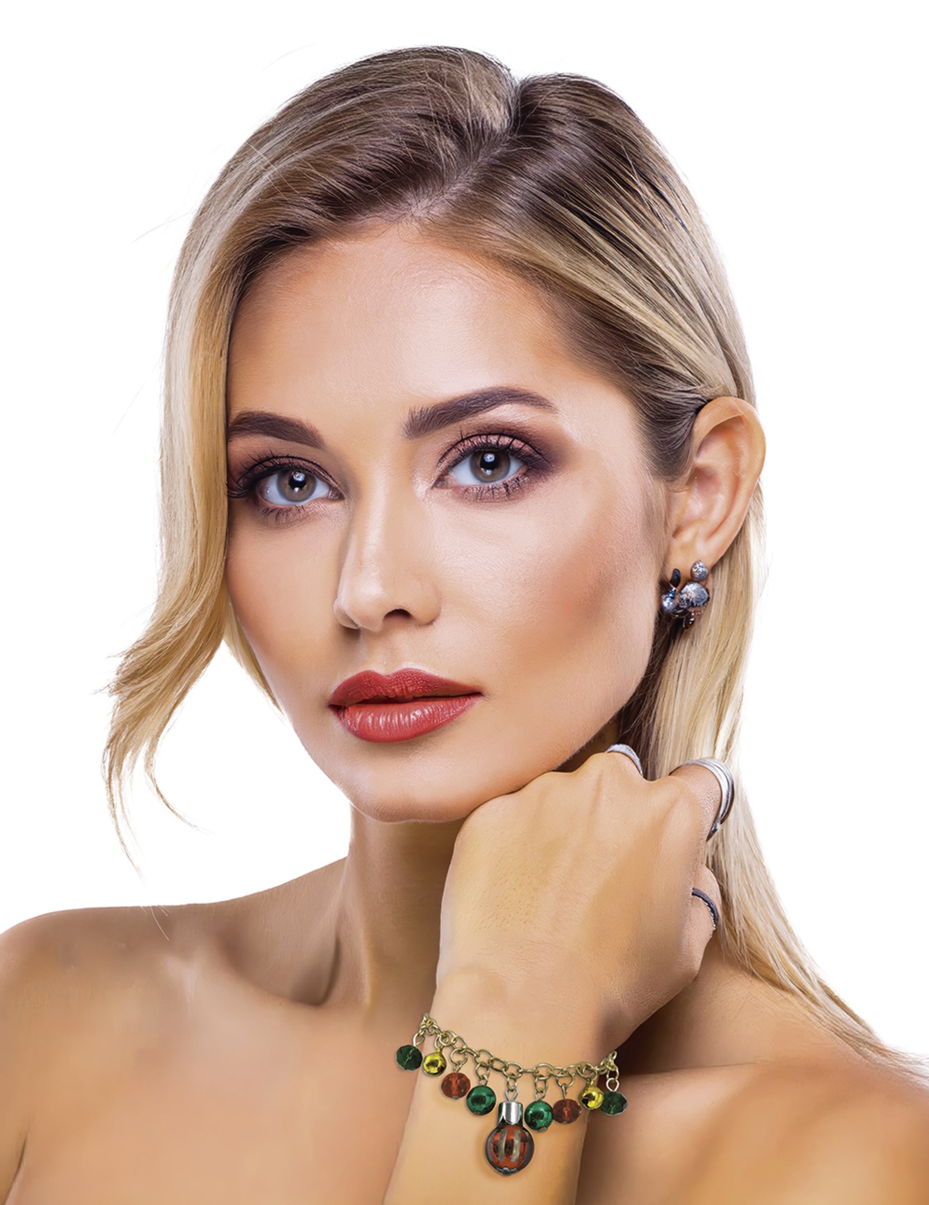 Ova metalna narukvica s božićnim kuglicama profinjeni je modni dodatak koji slavi čaroliju blagdana sjajem. Njezin zlatni lančić ukrašen je šarenim perlicama u nijansama crvene, zelene i zlatne, zajedno s prugastim privjeskom s kuglicom, dodajući svijetao i svečan dodir. S podesivom kopčom, lako se prilagođava vašem zapešću za savršenu udobnost. Idealna je za upotpunjavanje elegantne božićne odjevne kombinacije ili za jedinstven i blistav komad nakita koji obuhvaća duh blagdana.