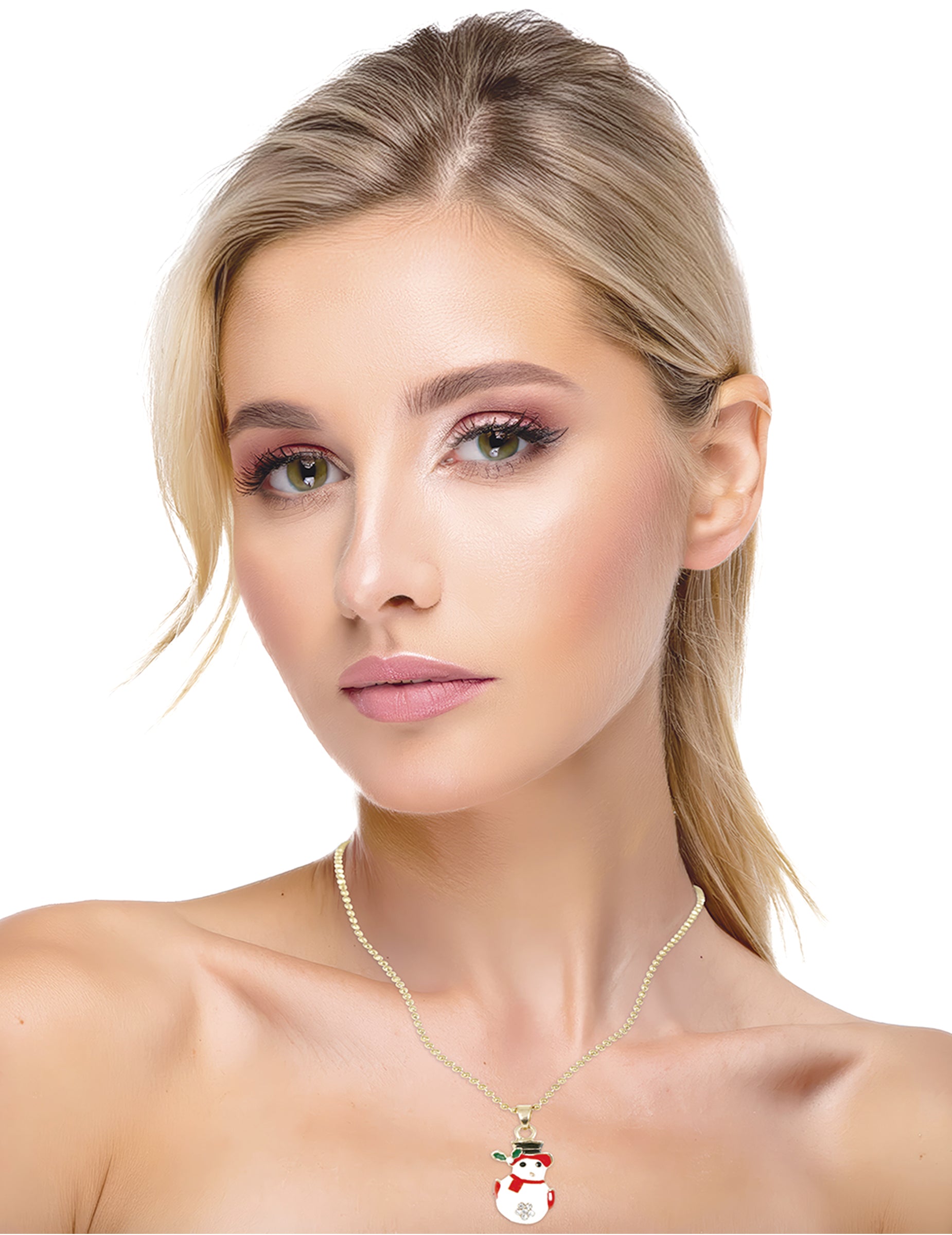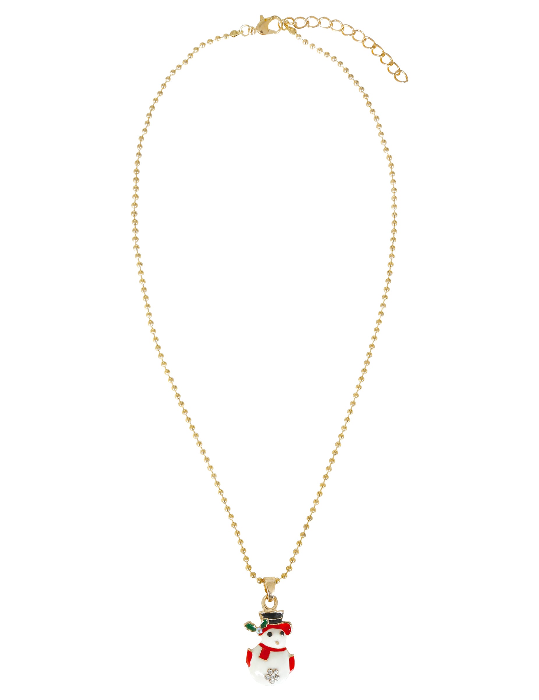 Ova božićna ogrlica s privjeskom u obliku snjegovića dodaje dašak zimskog veselja vašoj odjevnoj kombinaciji. Privjesak, obješen na nježnom zlatnom lančiću, prikazuje preslatkog snjegovića s crnim šeširom, crvenim šalom i blistavim zlatnim detaljima. Njegov elegantan i svečan dizajn nadopunjuje formalnu večernju odjeću i ležernu božićnu odjeću. Prekrasan i razigran komad nakita, savršen za širenje blagdanske čarolije sa stilom.