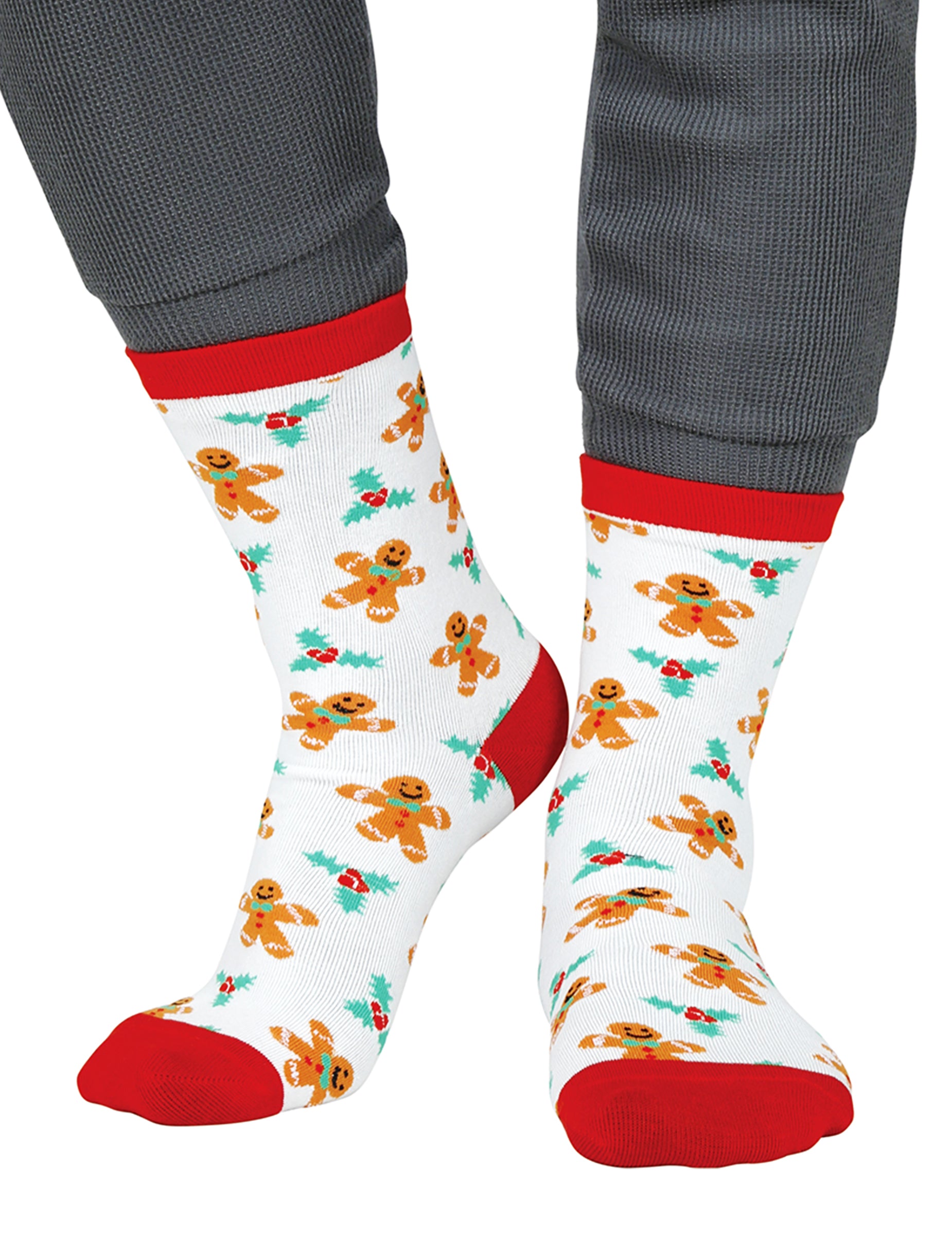 Ove bijele božićne čarape za odrasle s uzorkom medenjaka dodaju topao i sladak dodir vašoj odjevnoj kombinaciji. Preslatki mali medenjaci okruženi listovima božikovine ponavljaju se na svijetloj pozadini, evocirajući radostan i utješan duh blagdana. Njihovi crveni obrub, pete i prsti pružaju živahan i svečan dodir, savršen za upotpunjavanje veselog sezonskog izgleda.