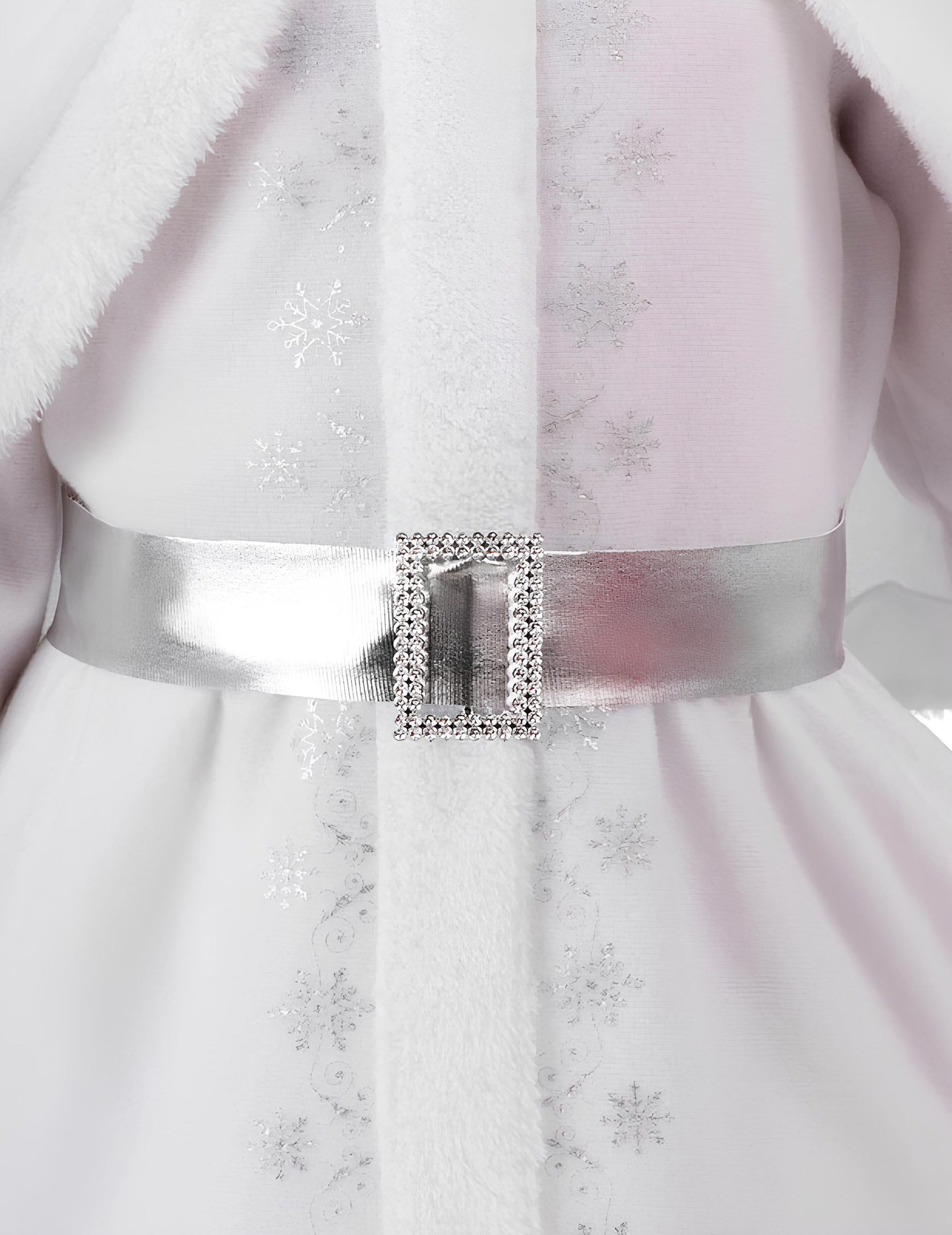 Ova odjevna kombinacija donosi čarobnu atmosferu Božića svojom elegantnom bijelom haljinom i mekim ogrtačem s kapuljačom koji nježno obavija dijete. Cjelina stvara blistav izgled, savršen za potpuno doživljavanje čarolije blagdana. Ovaj bijeli kostim gospođe Mraz za djevojčice kombinira lepršavu haljinu ukrašenu srebrnim detaljima i svjetlucavi pojas koji suptilno ističe figuru. Odgovarajući ogrtač dodaje profinjeni zimski dodir i savršen je dodatak svečanim božićnim trenucima. Odjevna kombinacija koja ističe svu slatkoću i sjaj ovog čarobnog godišnjeg doba.