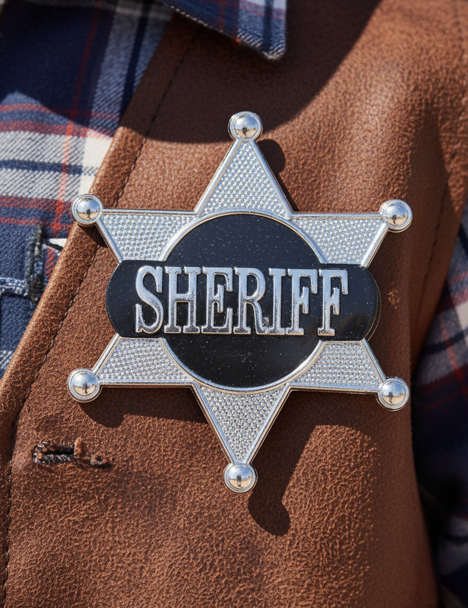 Ovaj kaubojski set dodataka uključuje mamuze, šerifovu zvijezdu, igračku pištolj i lutke za stvaranje jednostavnog, ali efektnog vestern izgleda. Mamuze se pričvršćuju na stražnji dio cipela kako bi evocirale stil kauboja. Zvijezda se može postaviti na košulju ili prsluk kako bi se dobio izgled pravog šerifa. Igračka pištolj, zajedno s lutkama za metke, savršeno upotpunjuje set za zabavno igranje uloga. Idealan set za karneval, tematsku zabavu ili za zabavu pretvarajući se da ste kauboj ili šerif.