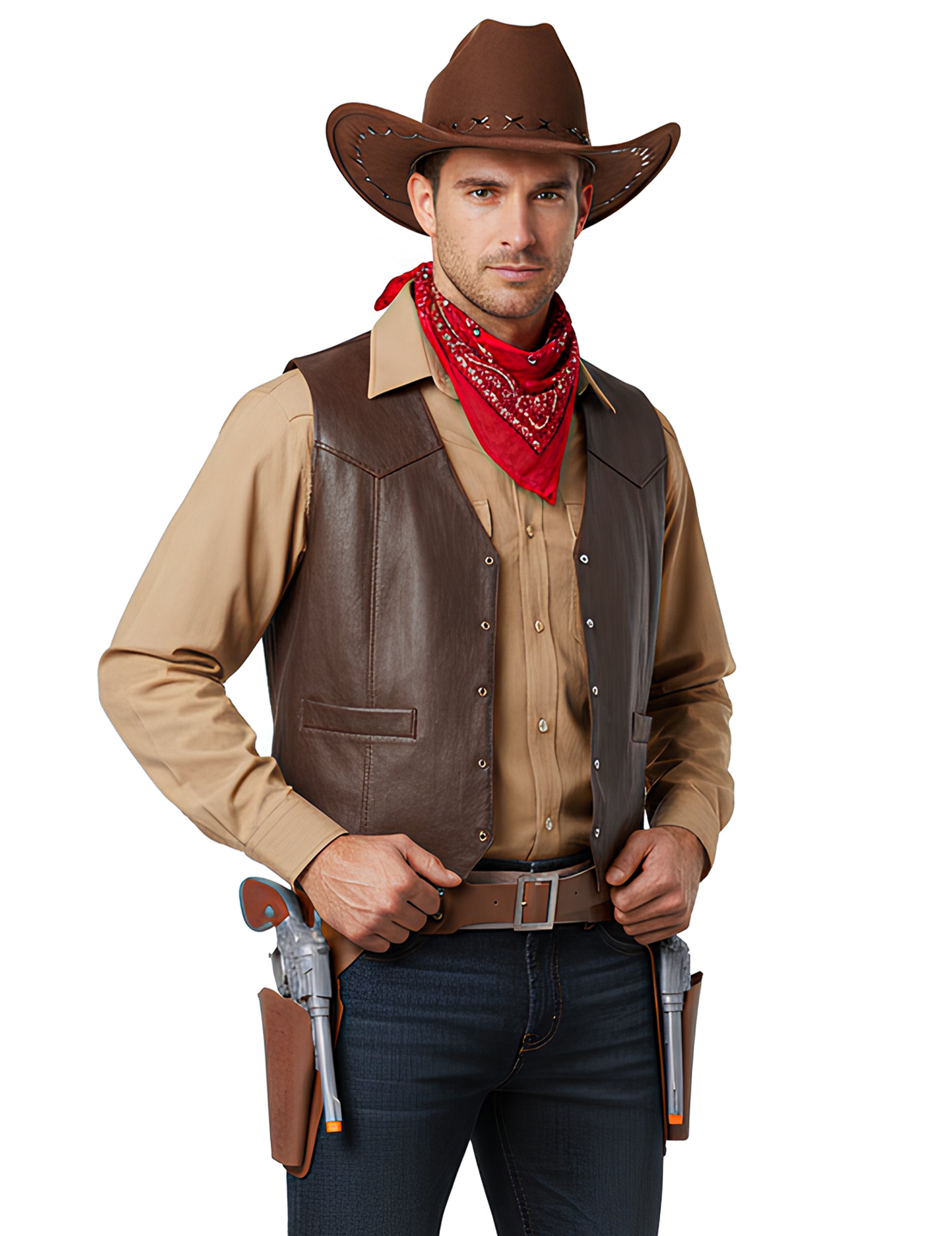 Ovaj set kaubojskog remena uključuje podesivi remen i dva pištolja, savršen za upotpunjavanje odjevne kombinacije Divljeg zapada. Smeđi remen se lako podešava struku i omogućuje vam nošenje dva pištolja sa svake strane za klasičan kaubojski izgled. Revolveri imaju obojene vrhove, podsjećajući vas da su dodaci za zabavu, a istovremeno zadržavaju prepoznatljivi zapadnjački stil. Idealan dodatak za karneval, zabavu s vestern tematikom ili kostim šerifa.