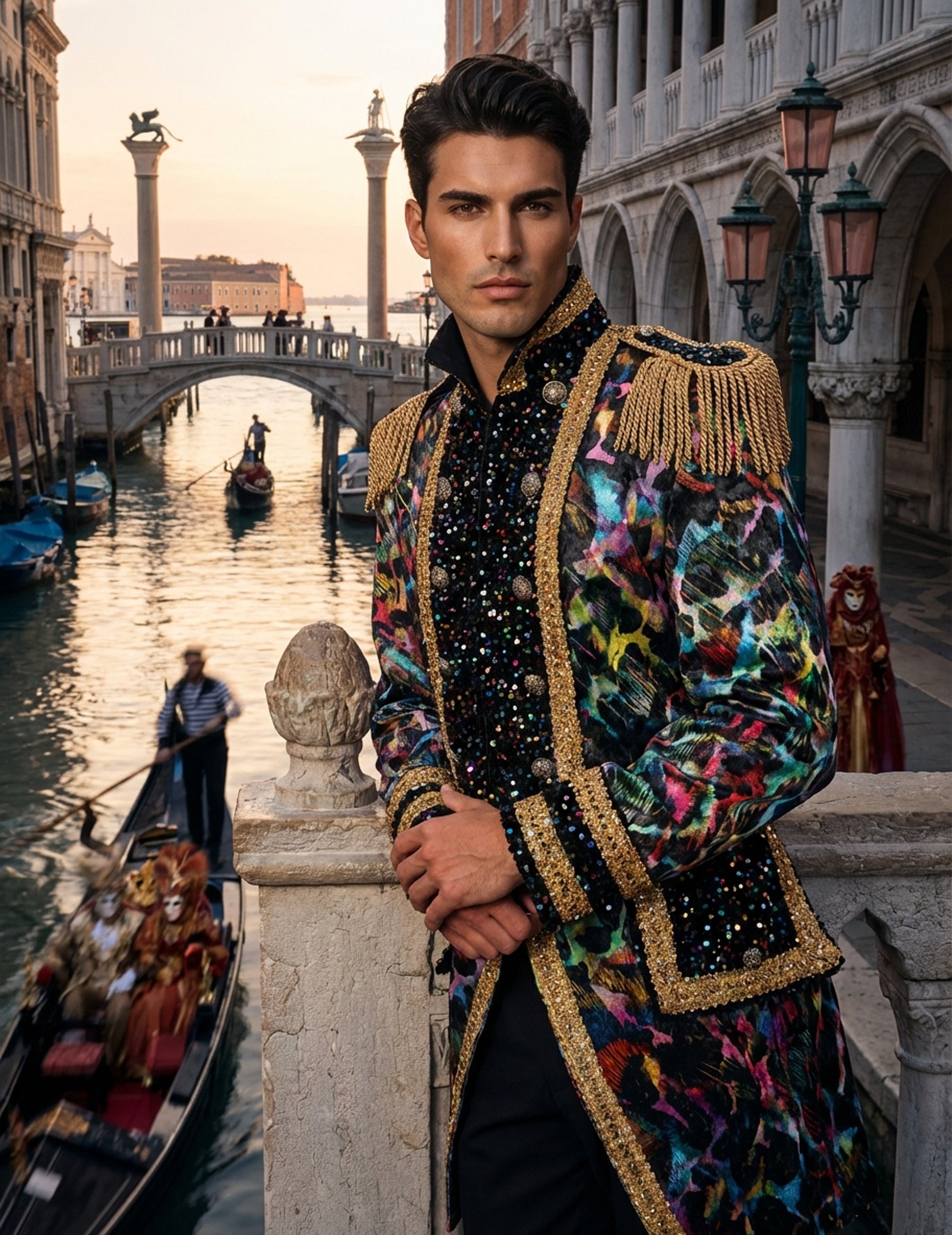 Ova vrhunska muška karnevalska jakna u živim neonskim bojama ističe se svojim intenzivnim nijansama i zlatnim obrubom, što pojačava njezin blagdanski izgled. Resaste epolete definiraju siluetu, dok svjetlucave pruge i raznobojni uzorci dodaju dašak energije. Ukupni efekt naglašava kretanje i stvara upečatljivu prisutnost, idealnu za upotpunjavanje odvažne odjevne kombinacije. Savršena za karneval ili kostimiranu zabavu, bez napora nadopunjuje izgled koji želi istaknuti stil.