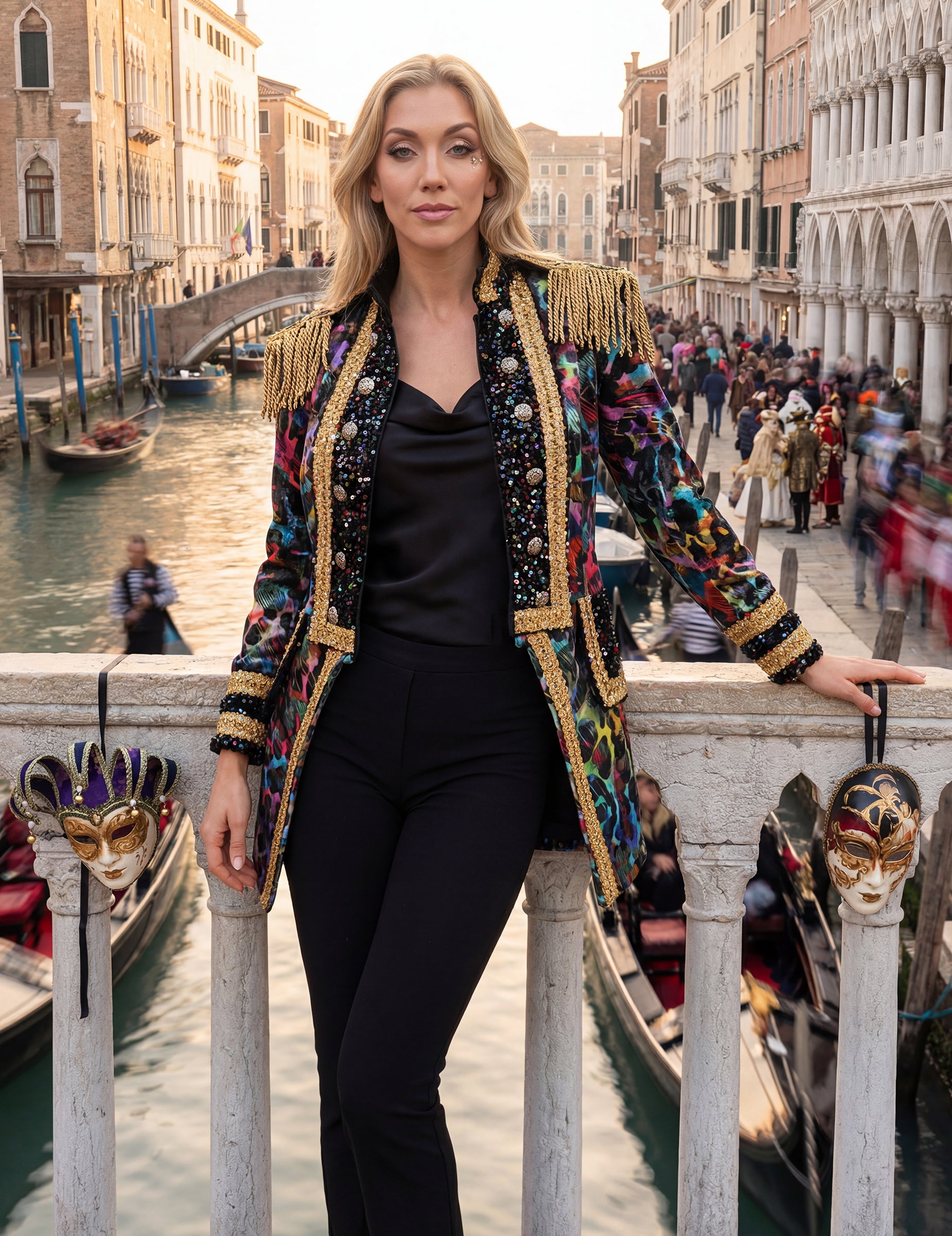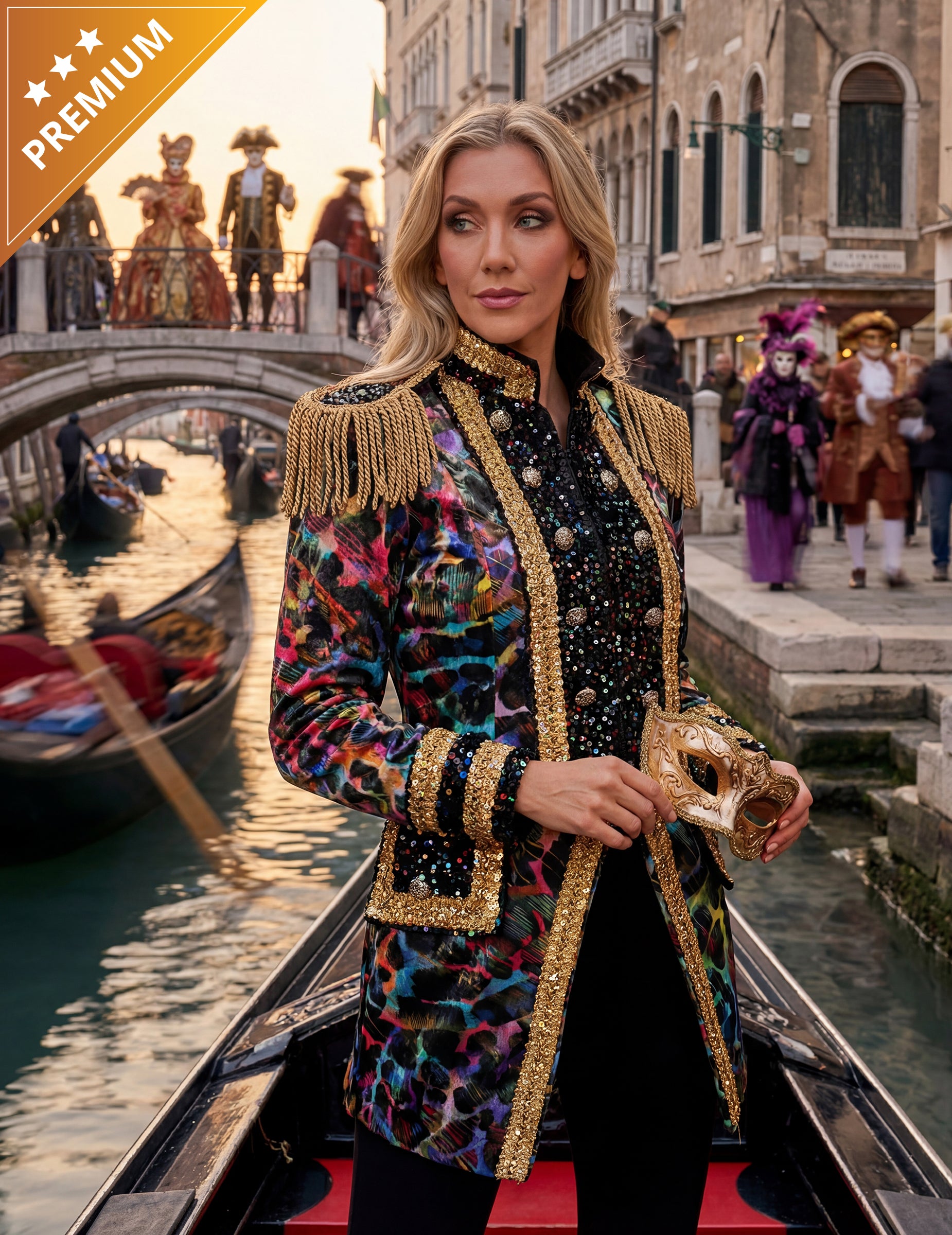 Ova vrhunska ženska karnevalska jakna u živim neonskim bojama ističe se svojim blistavim nijansama i zlatnim ukrasima koji laskaju cijeloj silueti. Resaste epolete naglašavaju gornji dio odjevnog predmeta, dok svjetlucave pruge i šareni uzorci pojačavaju njegov svečani izgled. Rezultat je energičan i izražajan stil, savršen za oživljavanje odjevne kombinacije za zabavu. Idealna za karneval ili kostimiranu zabavu, lako nadopunjuje izgled osmišljen da privuče poglede.