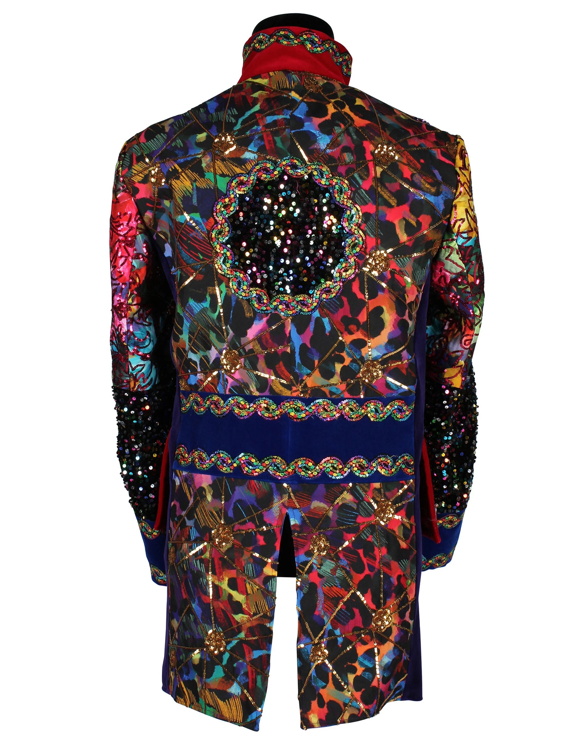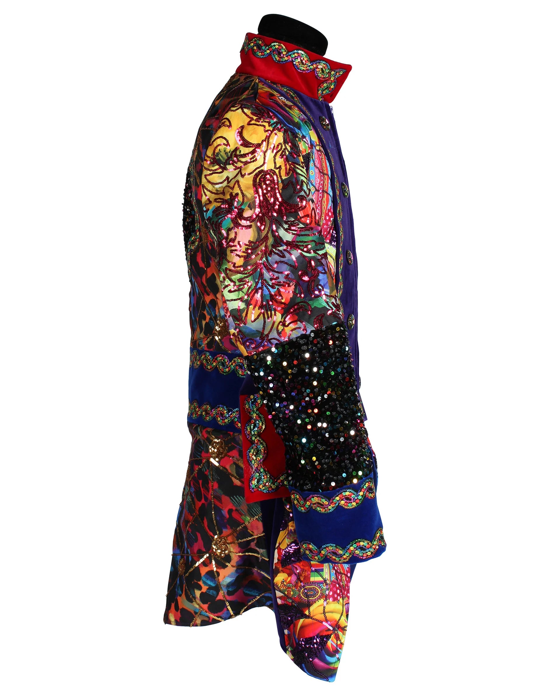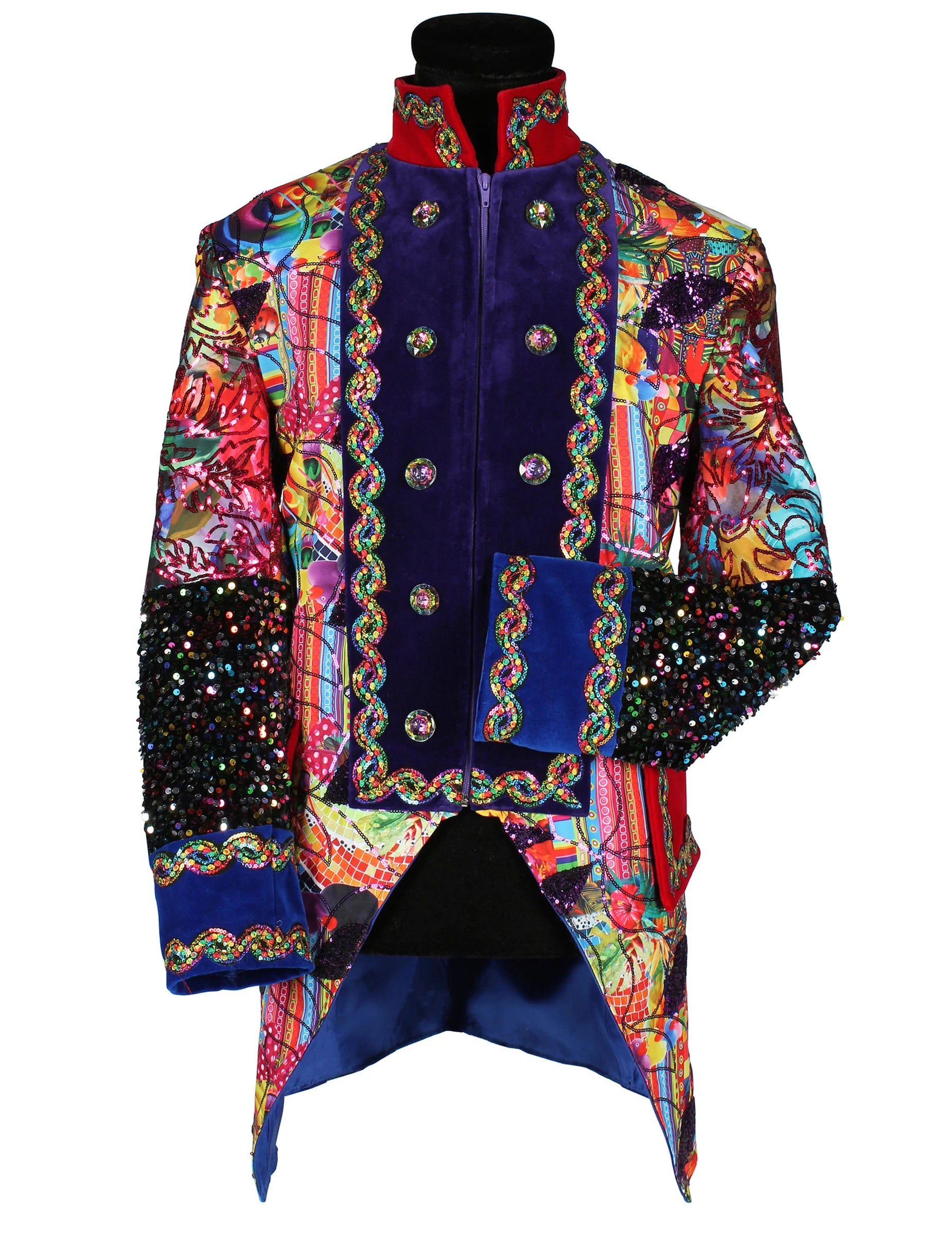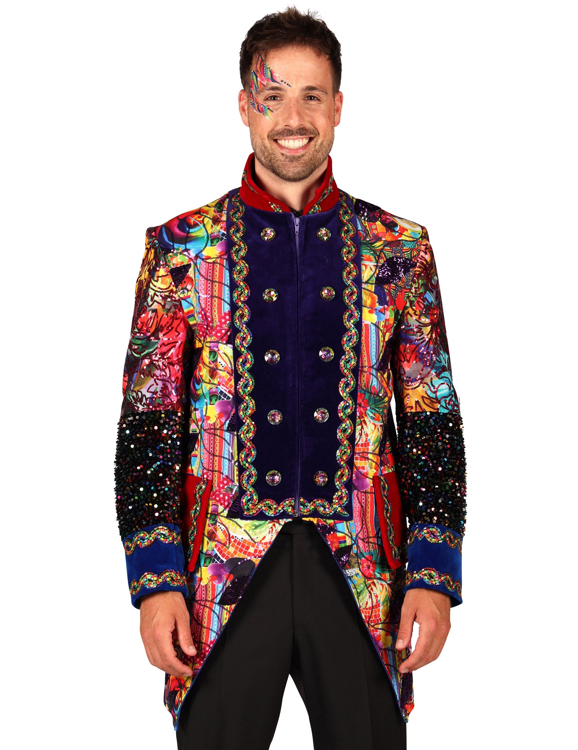 Ova muška karnevalska jakna u stilu Fiesta Carnavale, vrhunske kvalitete i šarenih boja, odmah privlači pažnju svojim živim bojama i dekorativnim uzorcima koji donose svečani stil. Ukrašeni rukavi, poravnati gumbi i kontrastni završeci stvaraju strukturiran izgled, dok višebojni detalji daju energičan dojam. Vizualno naglašava siluetu i donosi snažnu prisutnost, idealnu za upotpunjavanje izražajnog kostima.