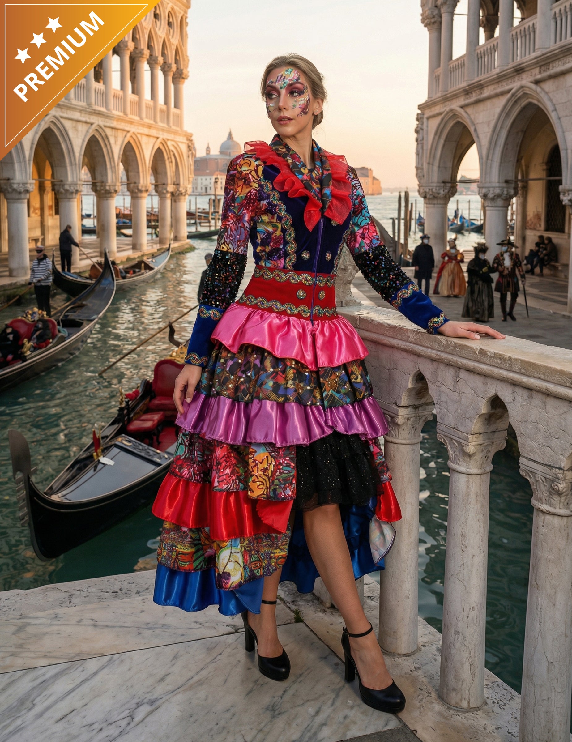 Ova vrhunska, višebojna ženska karnevalska jakna u stilu Fiesta Carnavale ističe se svojim živim nijansama i privlačnim svečanim uzorcima. Ukrašeni rukavi, definirani ovratnik i kontrastni obrub stvaraju dinamičan izgled, dok višebojni detalji dodaju radostan i karakteran dodir. Dizajn laska figuri i ostavlja snažan dojam, savršen za odjevnu kombinaciju za zabavu. Idealna za karneval ili kostimirane zabave, savršeno nadopunjuje izgled koji želi ostaviti snažan dojam.