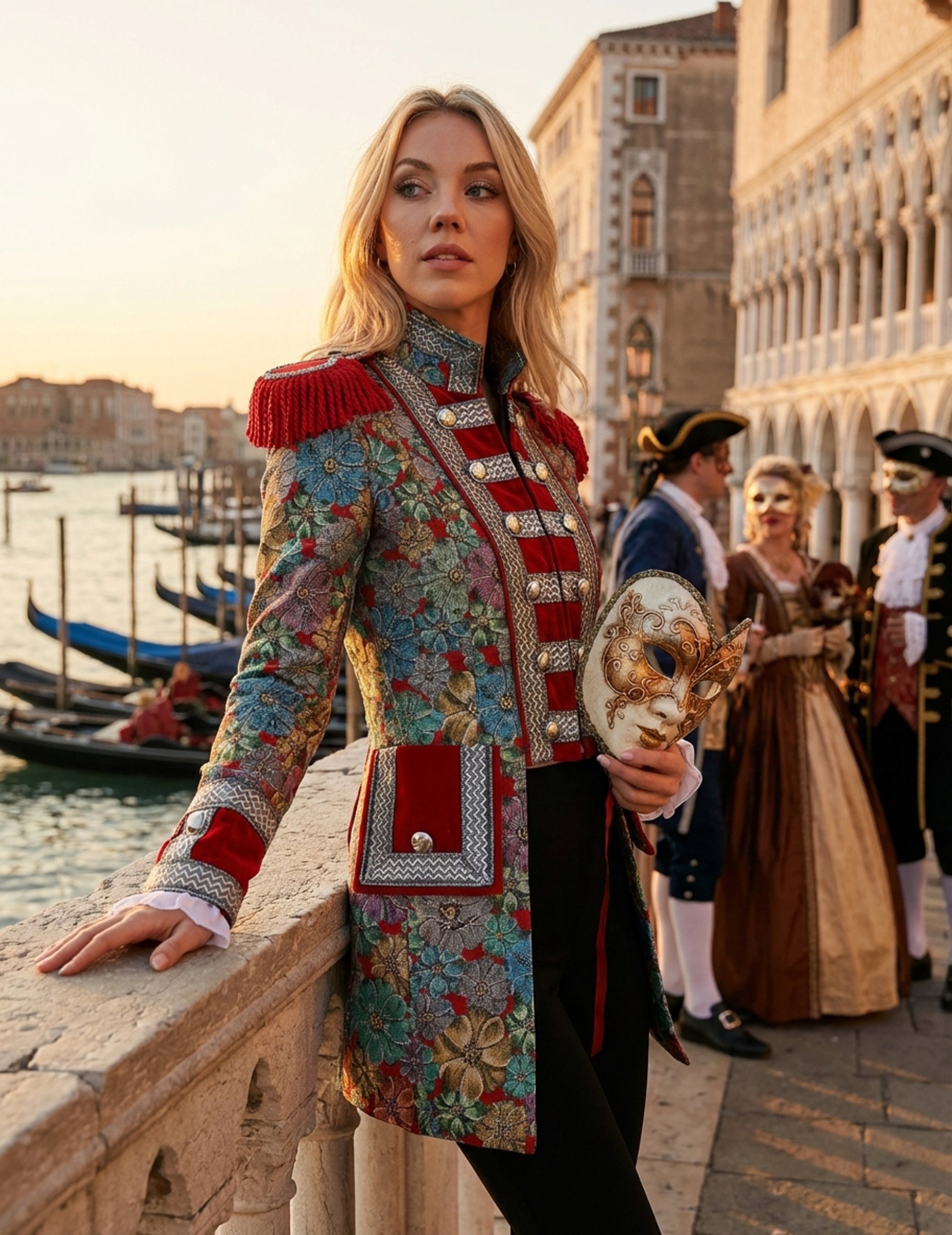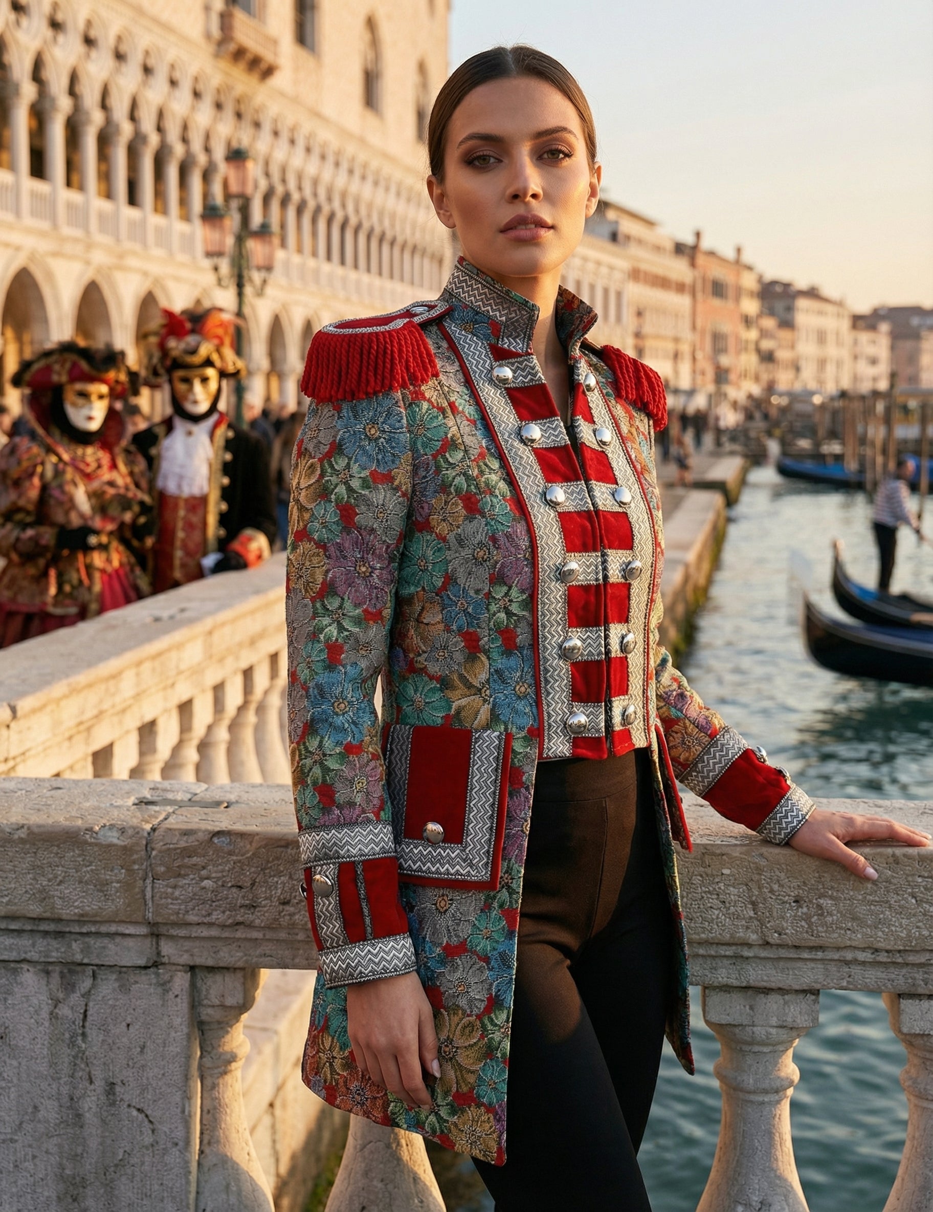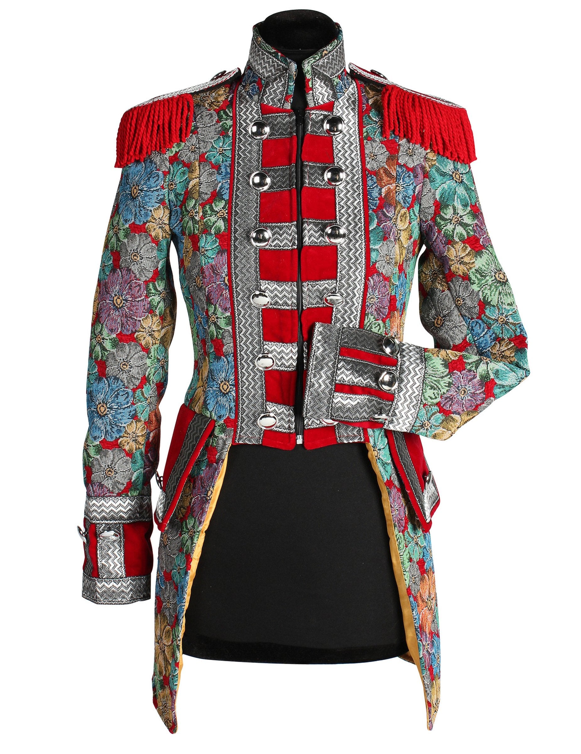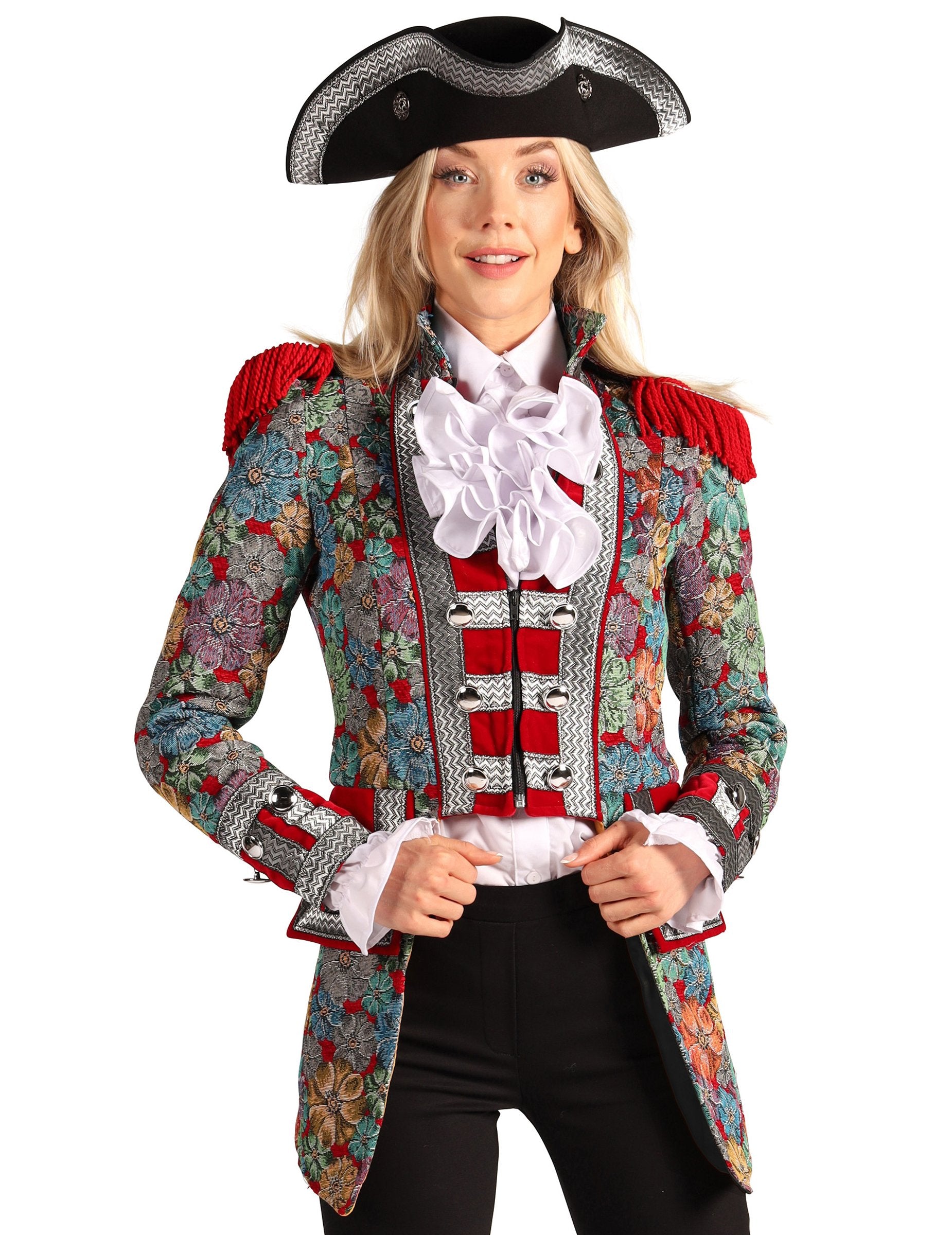 Ova ženska karnevalska jakna s cvjetnim uzorkom, vrhunske kvalitete, ističe se živim bojama i dekorativnim motivima koji odmah privlače pažnju. Elegantni kroj naglašava ramena zahvaljujući crvenim ukrasima, dok cvjetni detalji dodaju profinjenu notu. Kontrast između završnih obrada i dekorativnih traka stvara skladan i karakteran dojam, idealan za svaku svečanu kombinaciju.
