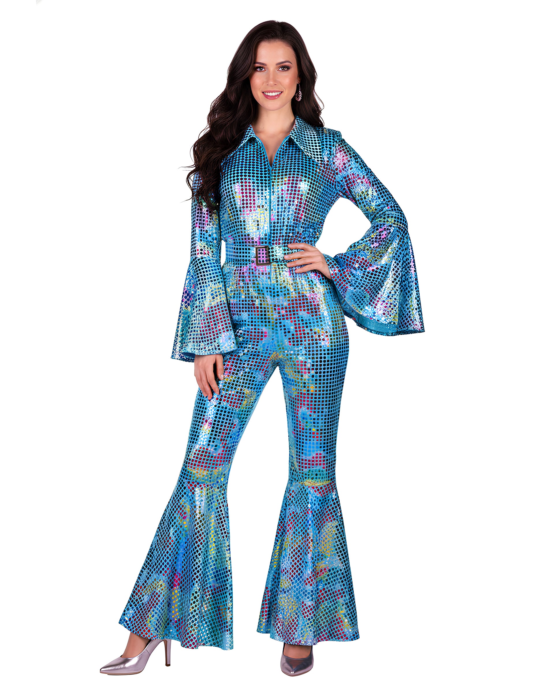 Ovaj vrhunski tirkizni disko kombinezon za žene odmah privlači poglede svojim svjetlucavim efektom i živopisnom nijansom, savršen za proslavu Nove godine. Njegova višestruko reflektirajuća tkanina osvjetljava svaki pokret i daje upečatljivu prisutnost od trenutka kada stignete na zabavu. Rašireni rukavi i zvonasti rub stvaraju klasičnu disko siluetu, a istovremeno nude fluidan i definiran stil. Kroj laska figuri bez previše otkrivanja, za elegantan i svečan izgled na svakom živahnom događaju.