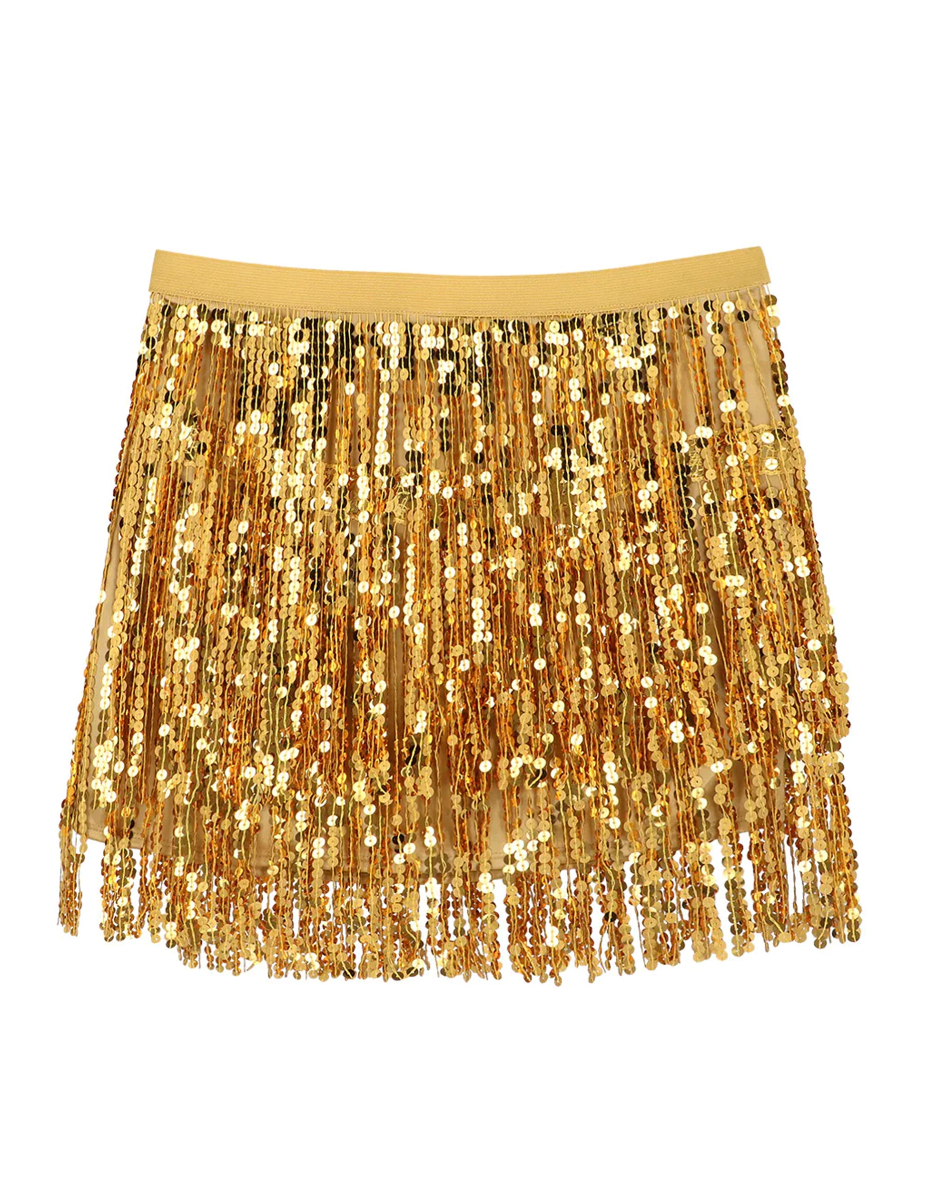 Ova zlatna ženska minisu-knja s šljokicama ističe se dugim svjetlucavim resama koje se elegantno njišu pri svakom koraku. Mekana baza udobno pristaje u struku, dok zlatne šljokice stvaraju topao i vrlo izražen sjaj. Kratki kroj daje moderan dojam, naglašavajući zlatne odsjaje koji osvjetljavaju cijelu siluetu. Savršena za dodati svečanu i blistavu notu, ova zlatna suknja sa šljokicama idealna je za festival ili proslavu Nove godine, pružajući sjajan stil koji će s elegancijom i energijom pratiti svaki trenutak večeri.