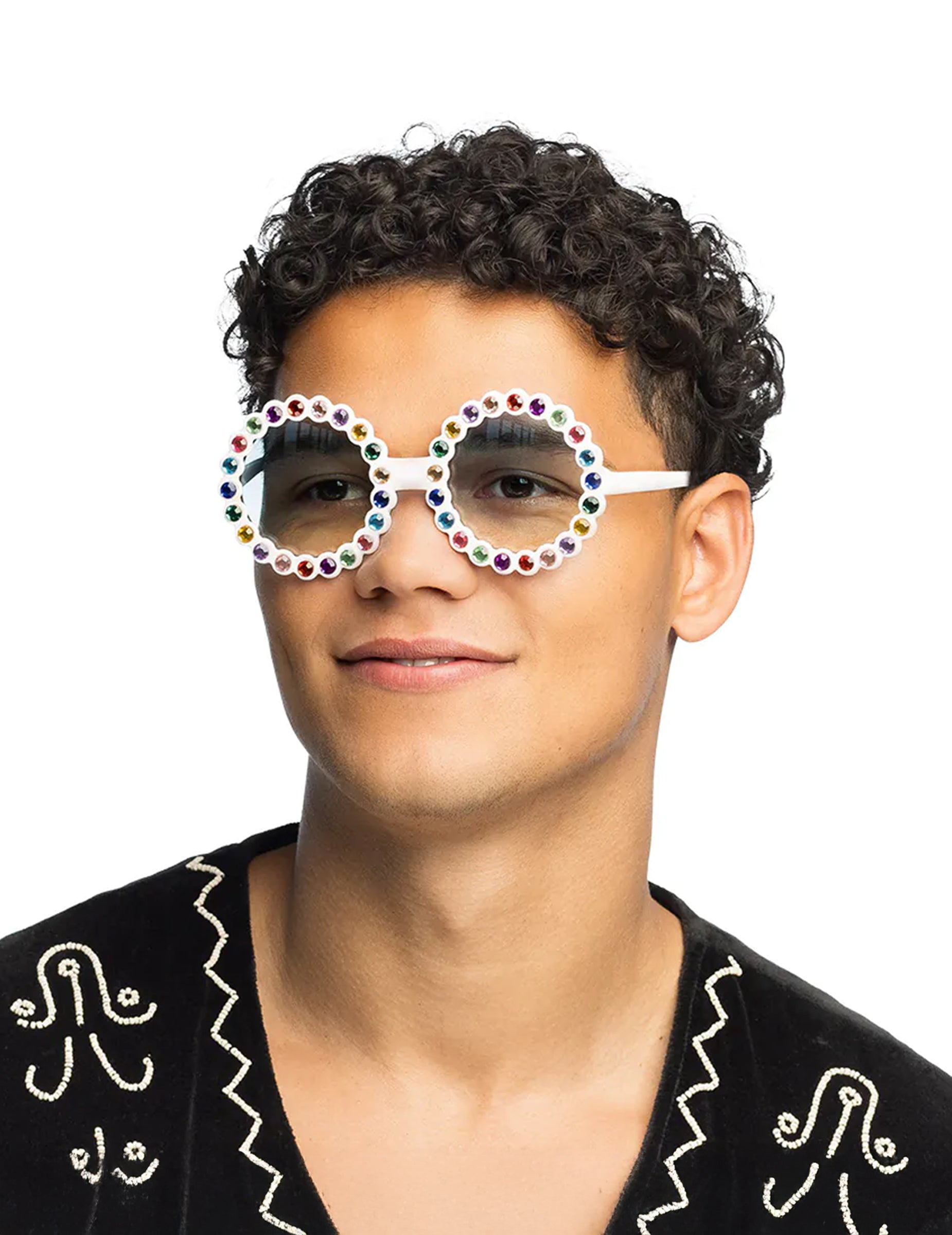 Okrugle naočale s višebojnim kamenčićima nude dinamičan izgled zahvaljujući dekorativnim kamenčićima raspoređenim oko okvira. Okrugla stakla u kombinaciji s raznobojnim kamenčićima stvaraju upečatljiv vizual koji dodaje veseo ton svakom kostimu. Odmah naglašavaju laganu i zabavnu atmosferu. Idealne su za rođendan, kostimiranu zabavu ili svaki trenutak kada želite dodati šareni detalj.