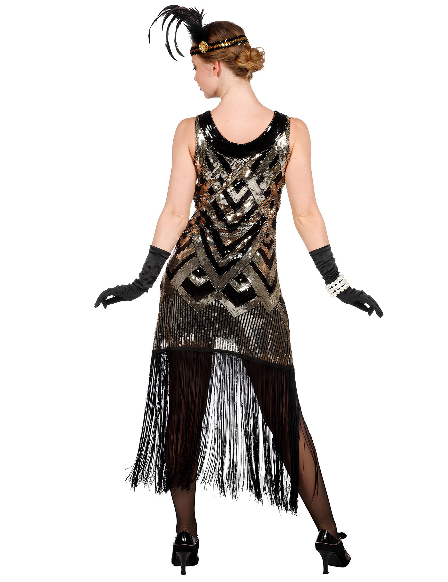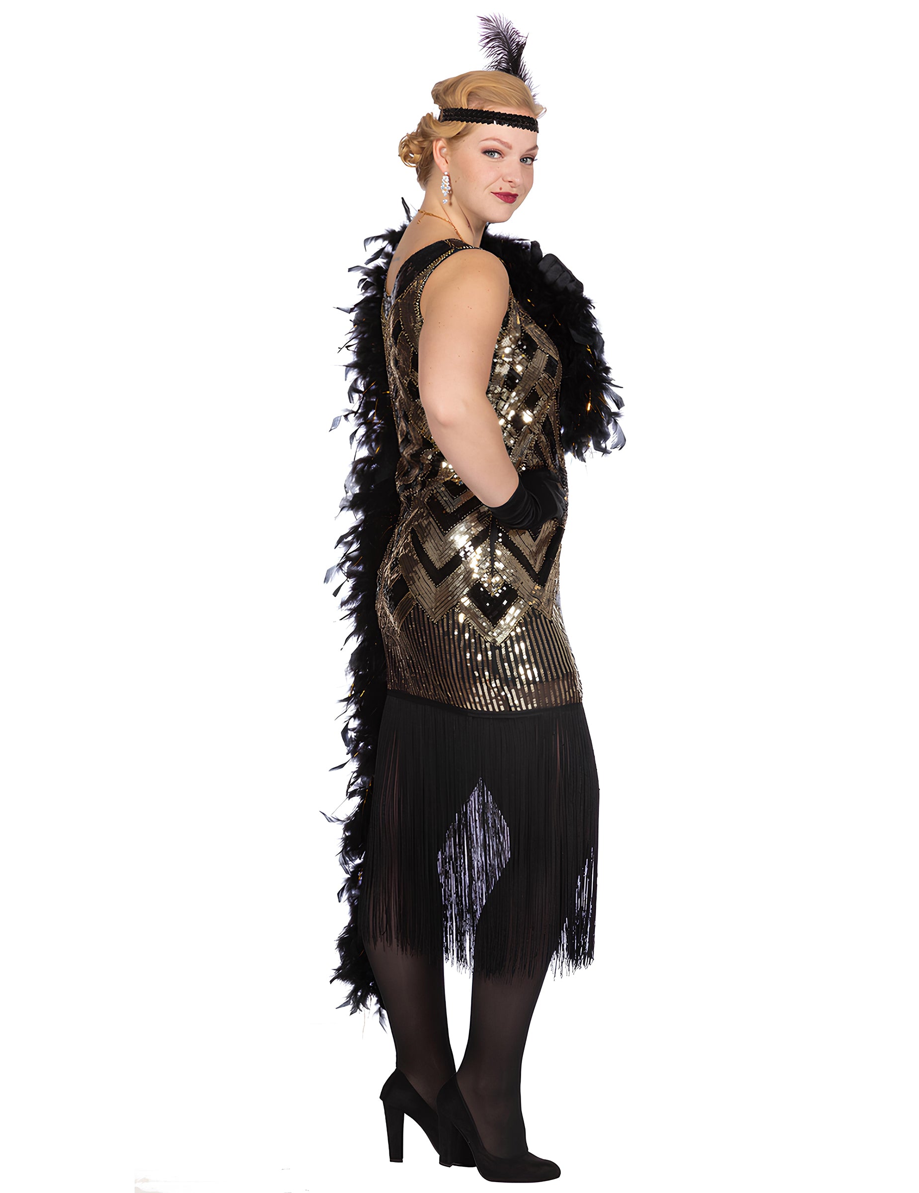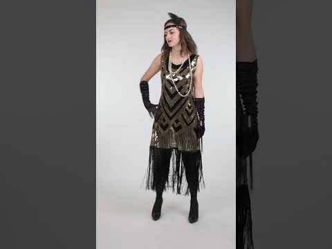 Ovaj Luksuzni crni i zlatni Charleston kostim sa šljokicama za žene ističe haljinu čiji metalizirani šljokice stvaraju grafičke oblike koji prirodno privlače poglede. Kombinacija crne i zlatne stvara elegantan kontrast koji daje pravi dojam prisutnosti ovoj odjevnoj kombinaciji.