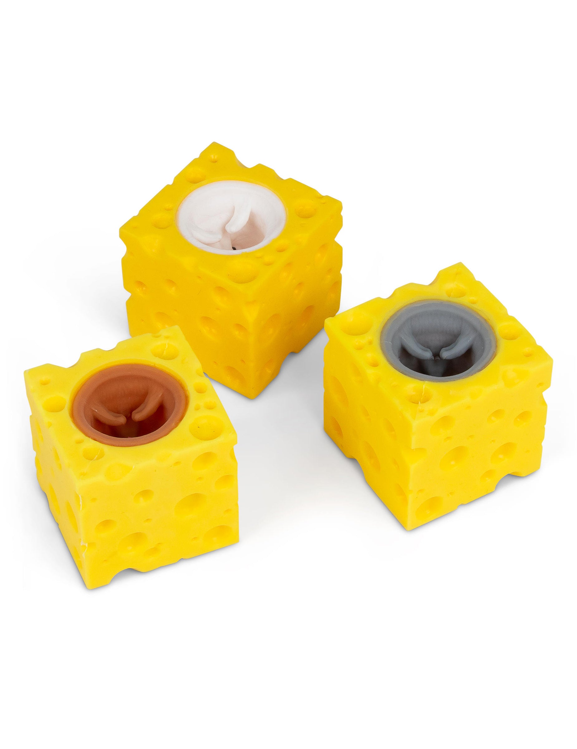 Le Pop Up Souris est un jouet souple représentant un cube de fromage dans lequel une souris apparaît lorsqu’on le presse.