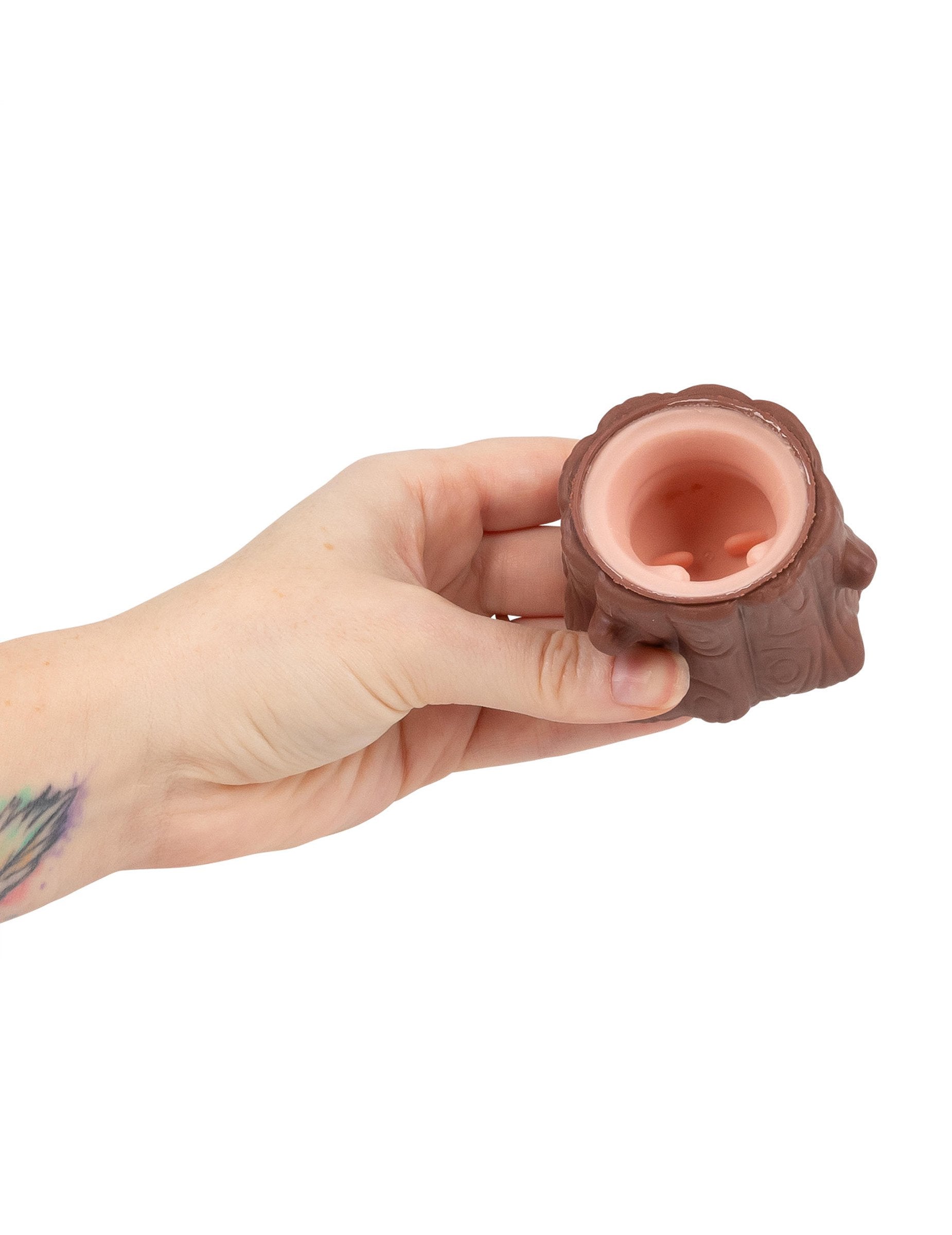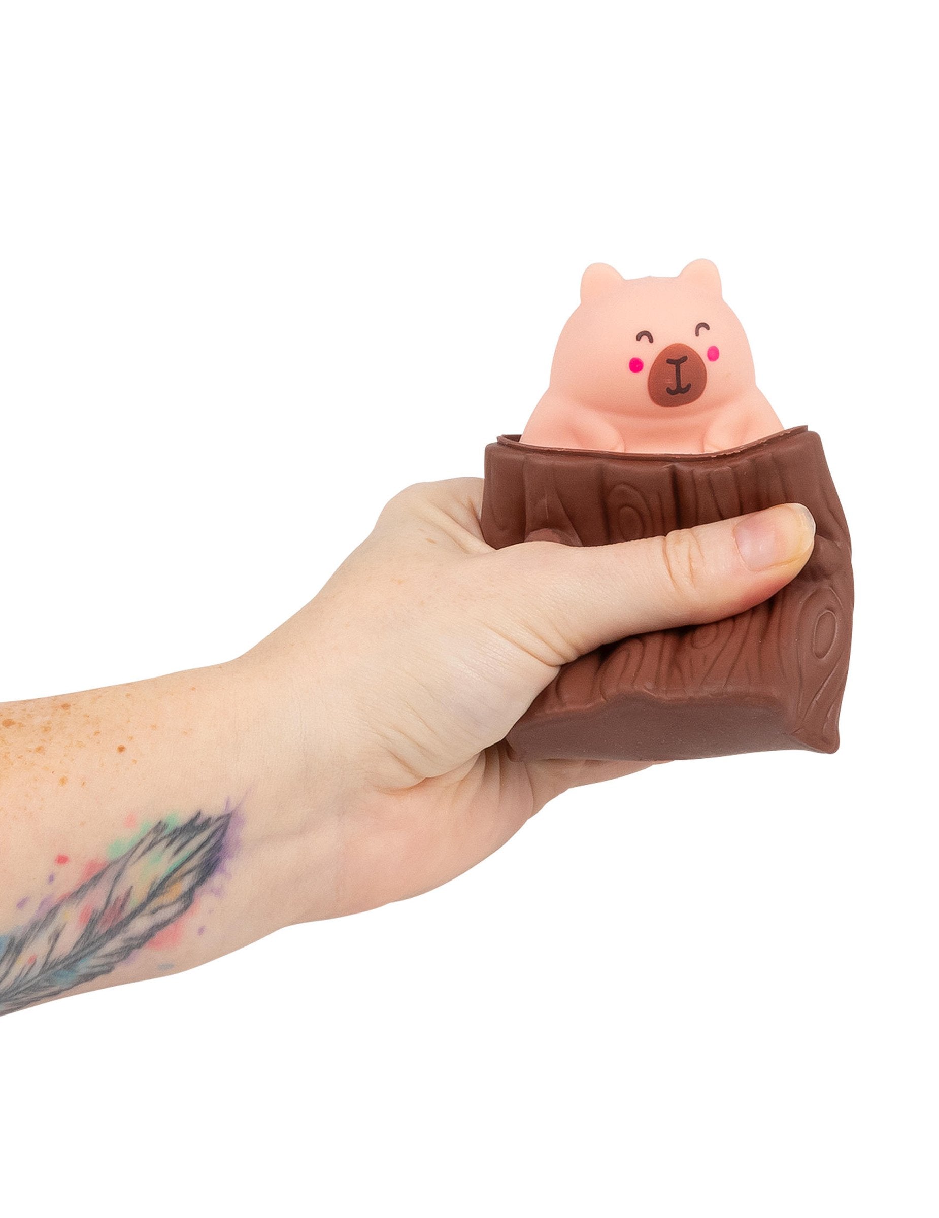 Le socle marron évoque une forme de tronc ou de cachette, et son toucher moelleux se déforme facilement entre les doigts. À chaque pression, le capybara rose remonte puis disparaît lorsque la pression est relâchée, créant un effet simple et amusant.