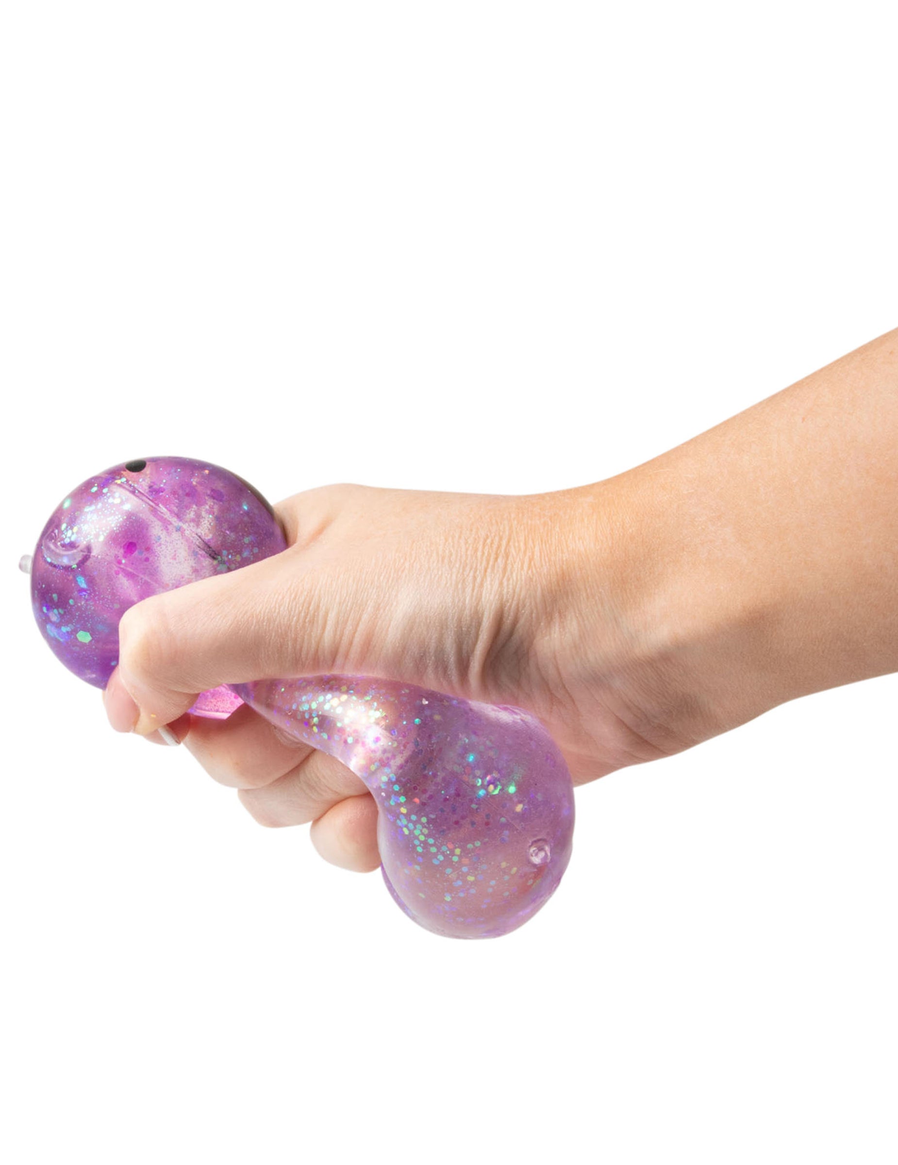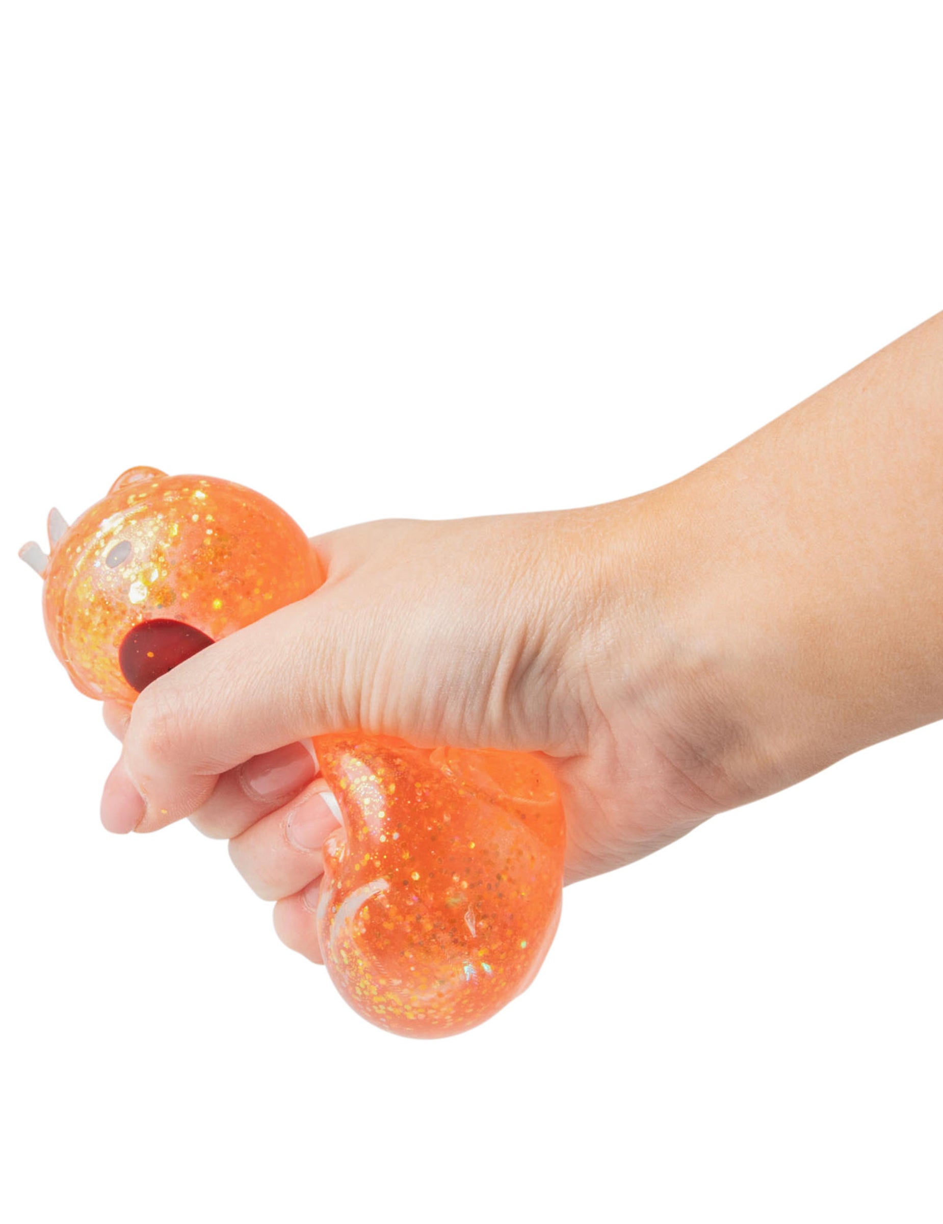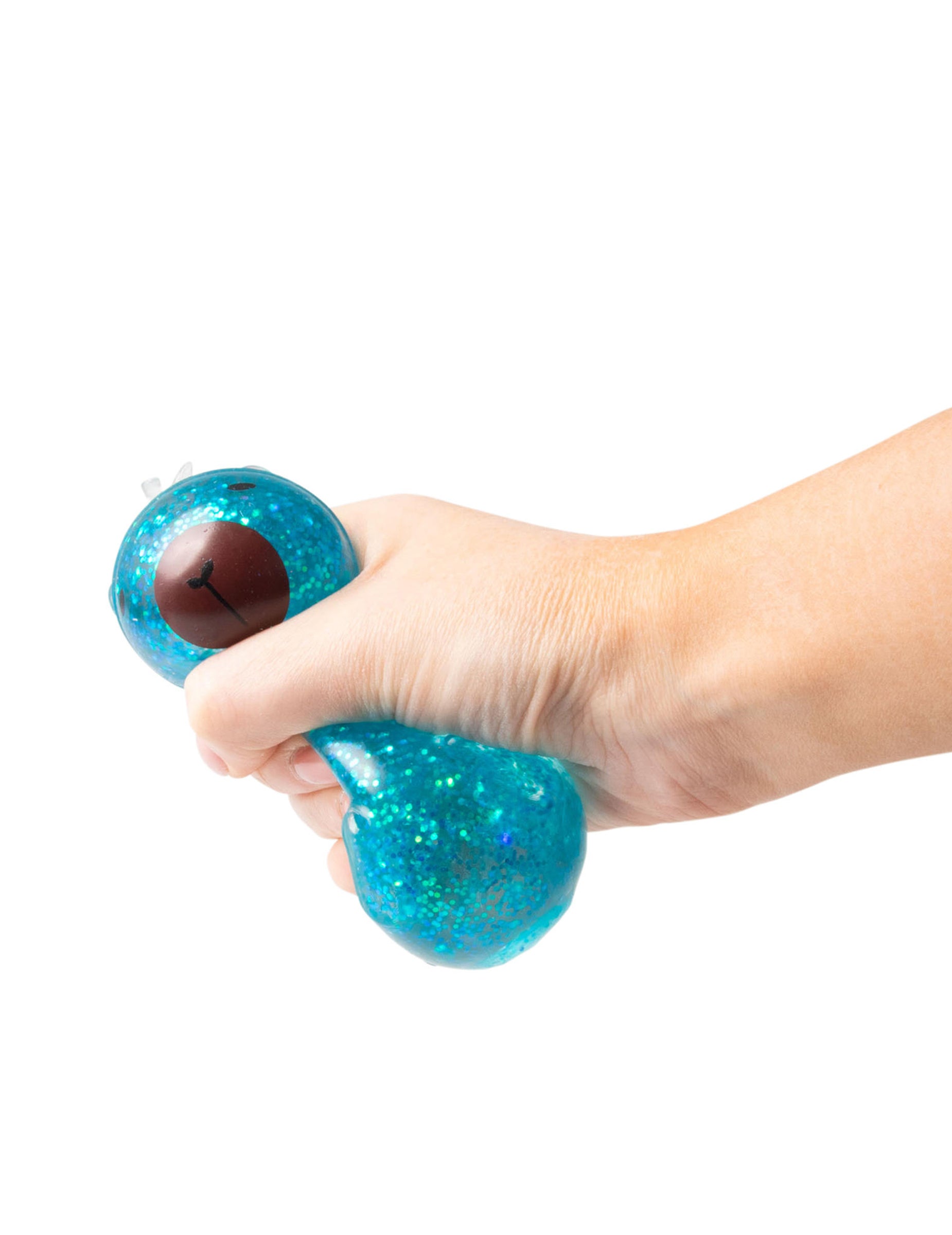 Cette balle capybara anti stress Scrunchems se presse facilement entre les mains grâce à sa texture souple remplie de gel pailleté.