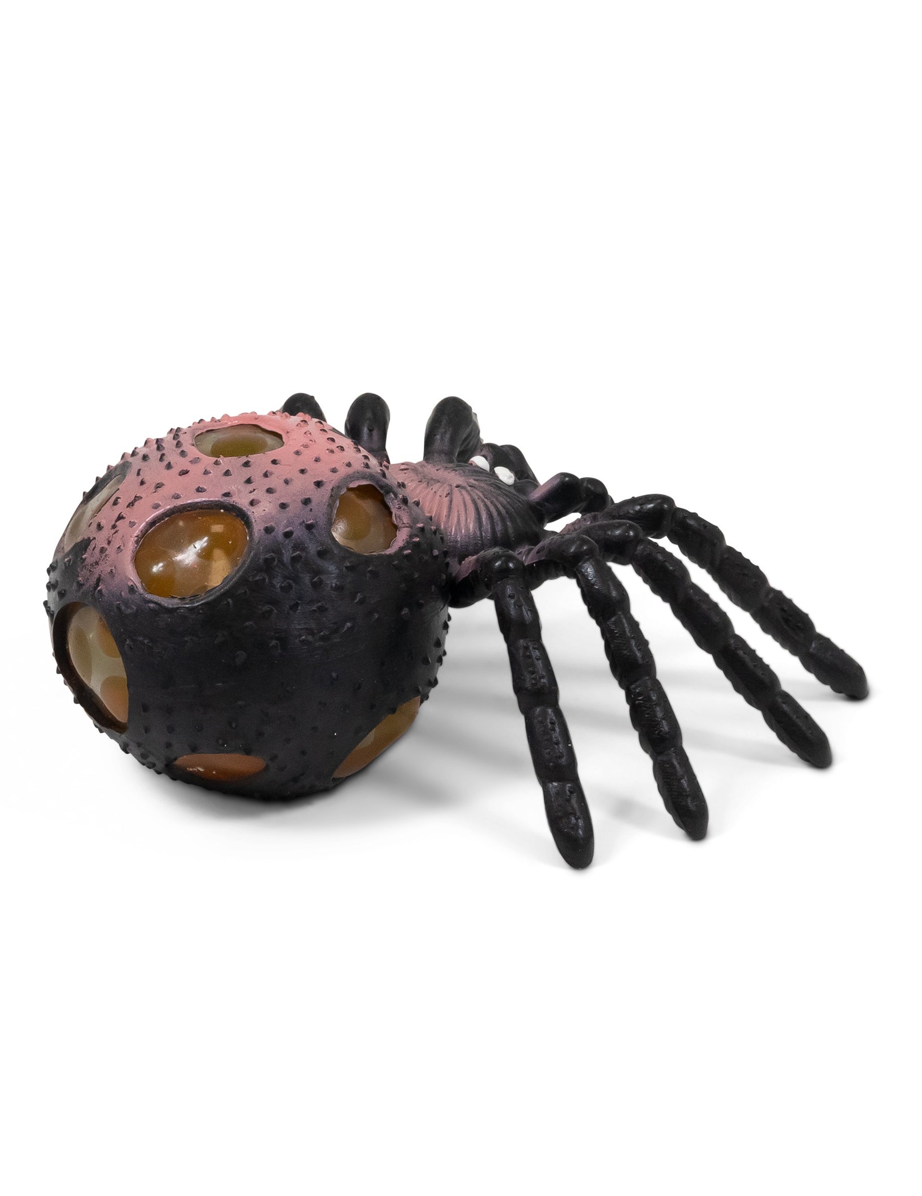 Ova meka kugličasta paukica izrađena je od fleksibilnog materijala koji se lako deformira pod rukom. Ima ispupčeno tijelo ispunjeno malim kuglicama koje postaju vidljive kada je stisnete. Tanke noge i blago zrnasta tekstura dodatno naglašavaju njezin izgled.