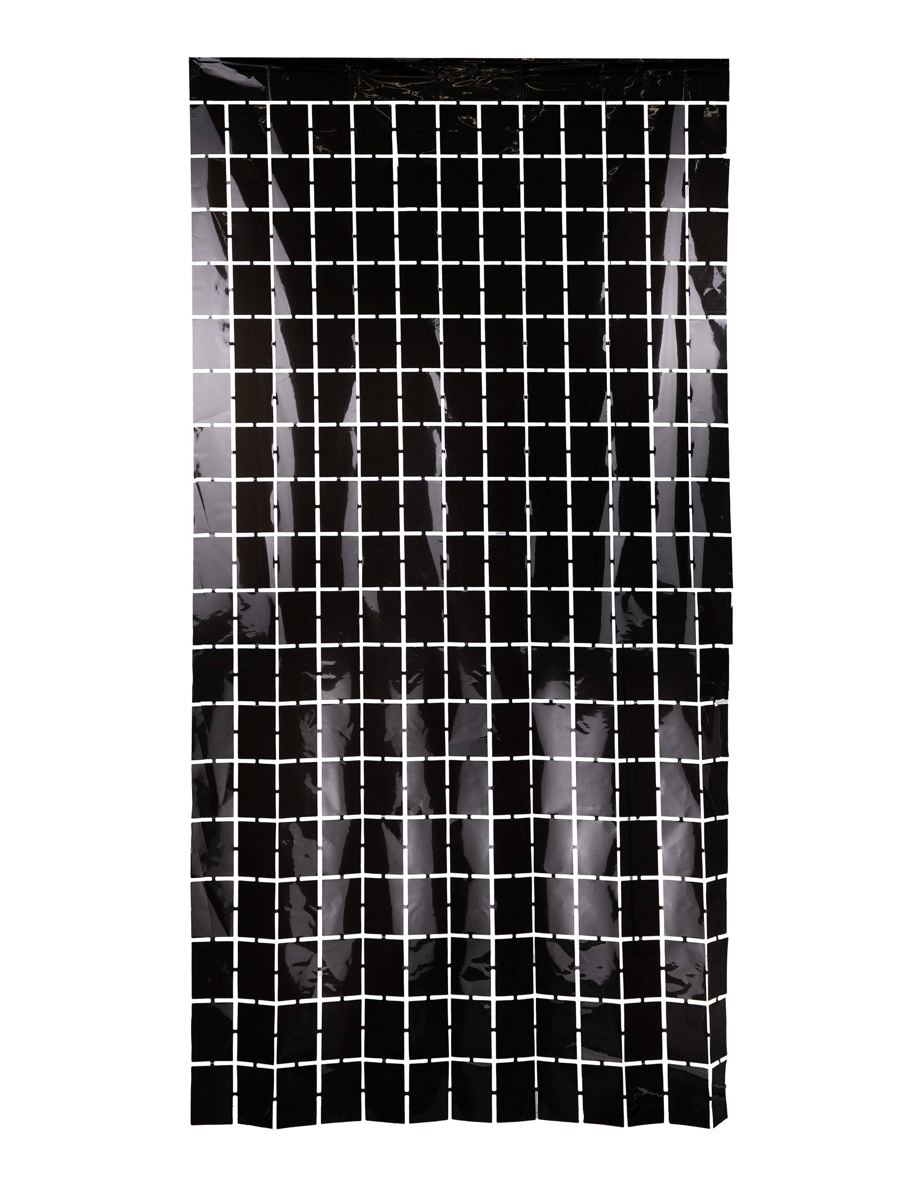 Ova crna dekorativna zavjesa sastoji se od sjajnih crnih kvadratića spojenih kako bi stvorili elegantnu i grafičku pozadinu.