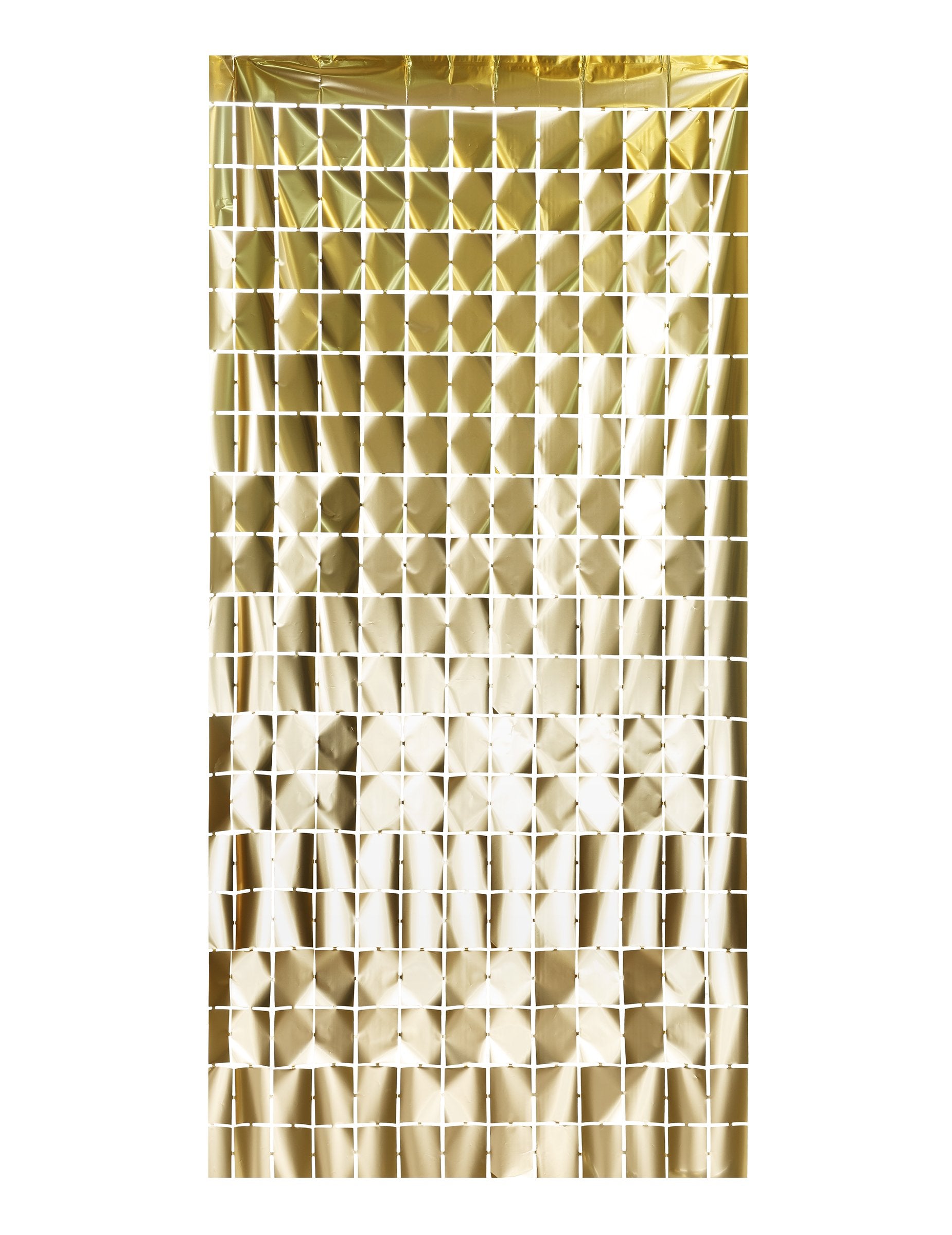 Ova pozadinska dekoracija sastoji se od zlatnih kvadratića sjajnog izgleda, spojenih kako bi formirali svjetlucavu dekorativnu zavjesu.