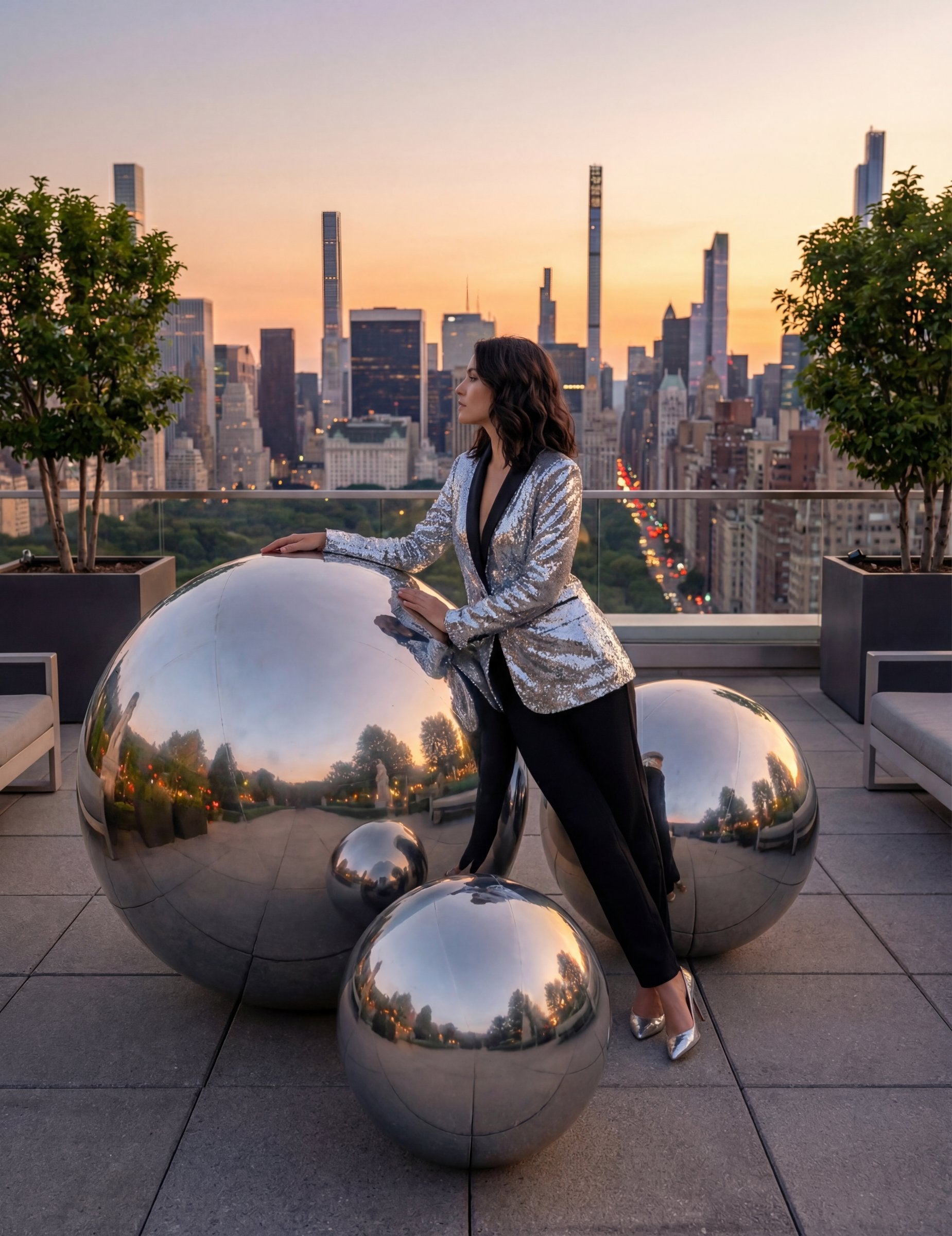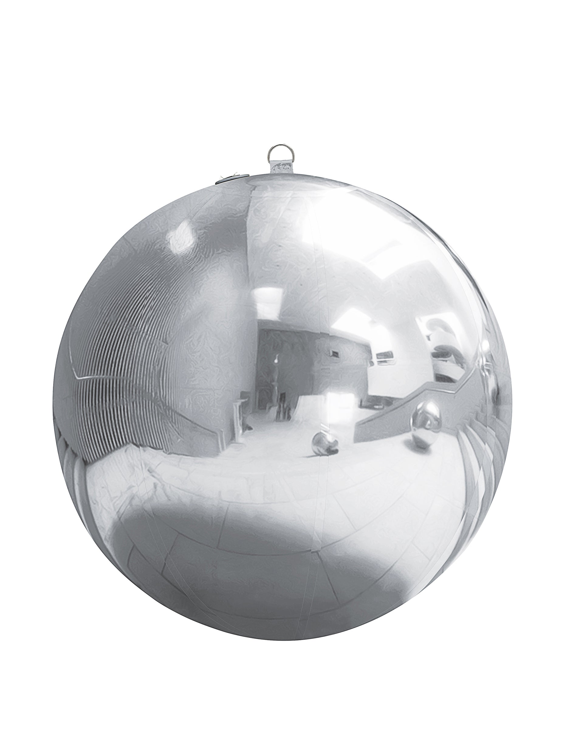 Ima srebrnu površinu s efektom ogledala koja reflektira svjetlost i okolinu. Njezina sferična forma i promjer od otprilike 90 cm omogućuju lako uklapanje u dvoranu, prostor za prijeme ili kao dekoraciju za foto-kutak.