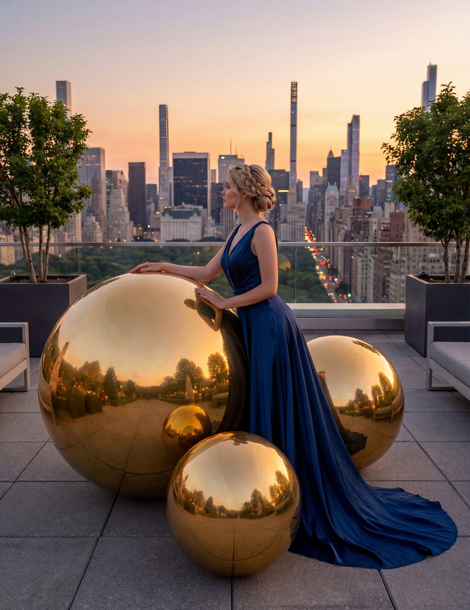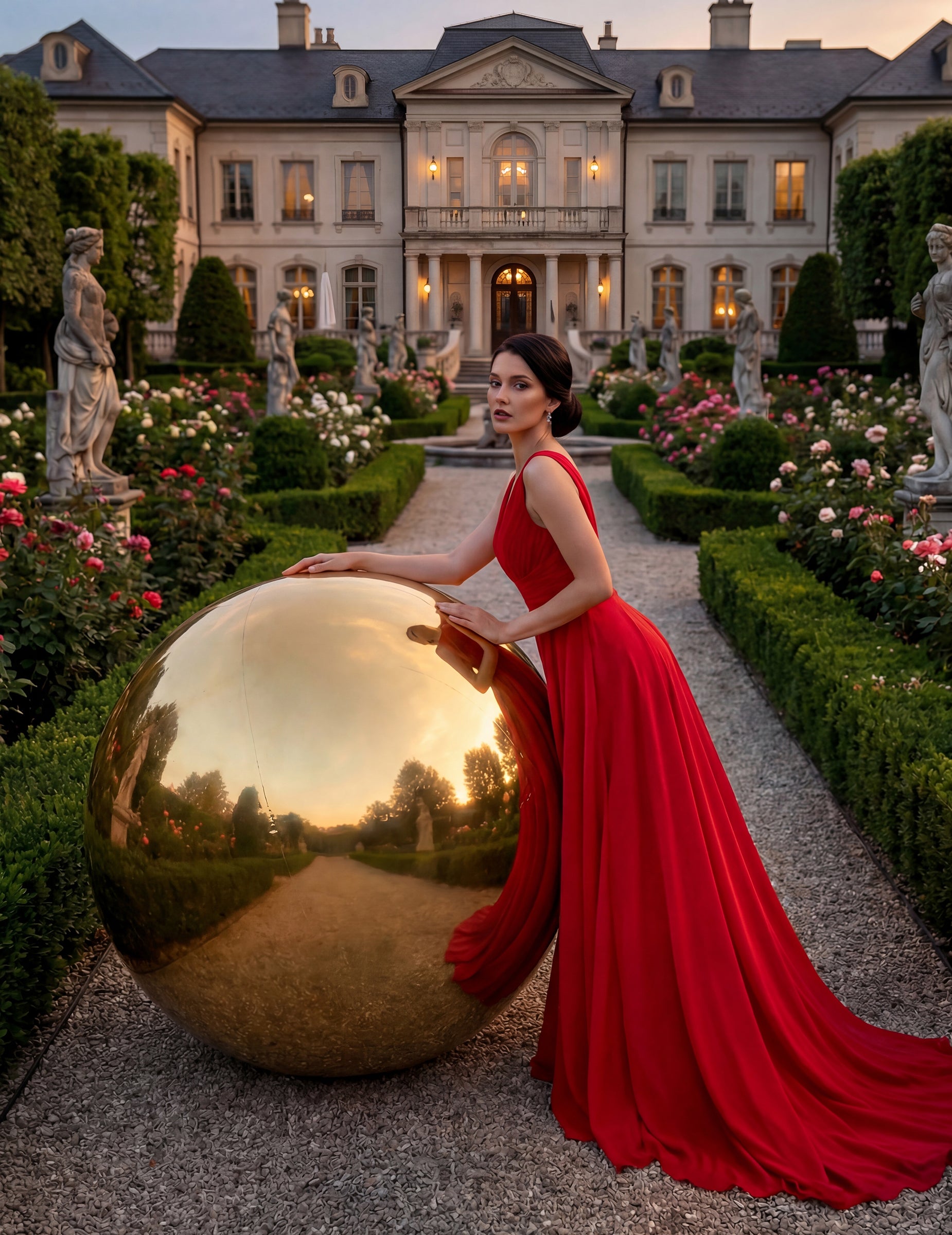 Ima zlatnu površinu sa zrcalnim efektom koja reflektira svjetlost i okolinu. Njezin sferični oblik i velika veličina od otprilike 120 cm čine je vidljivim dekorativnim elementom, prikladnim za dvorane, vrtove ili foto zone tijekom proslava.